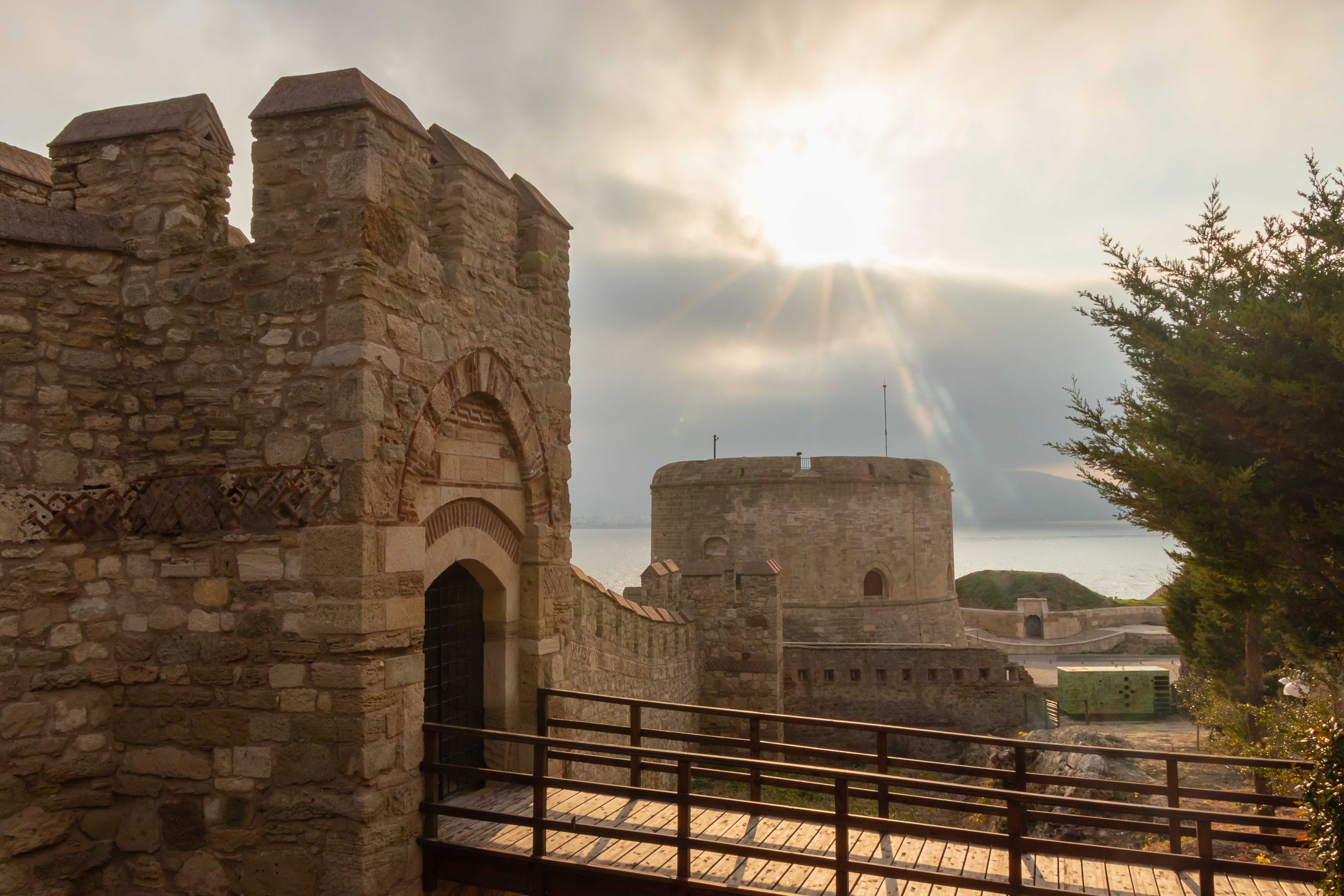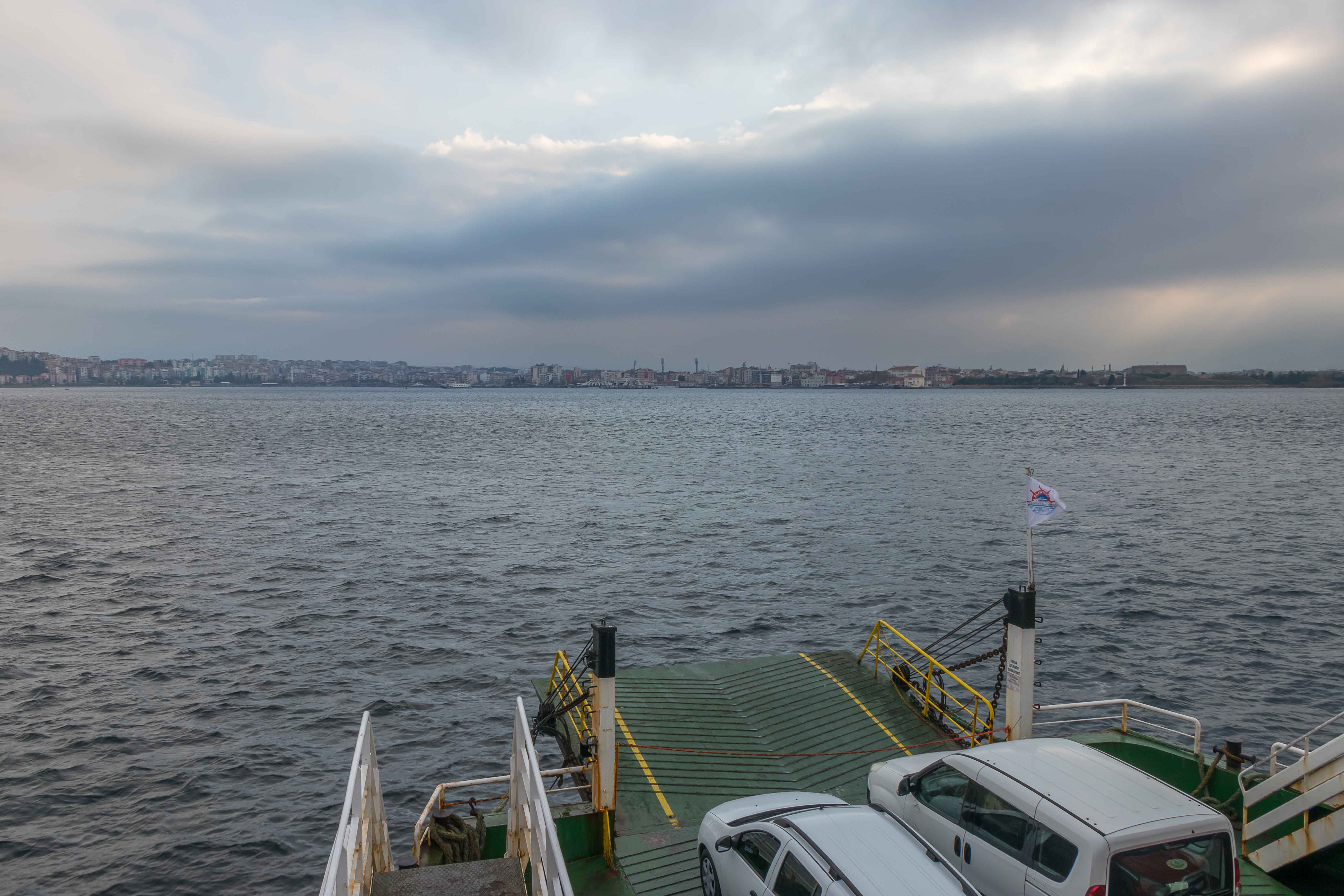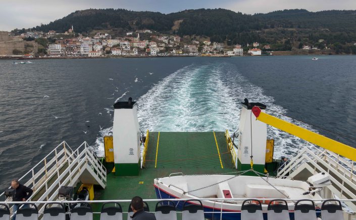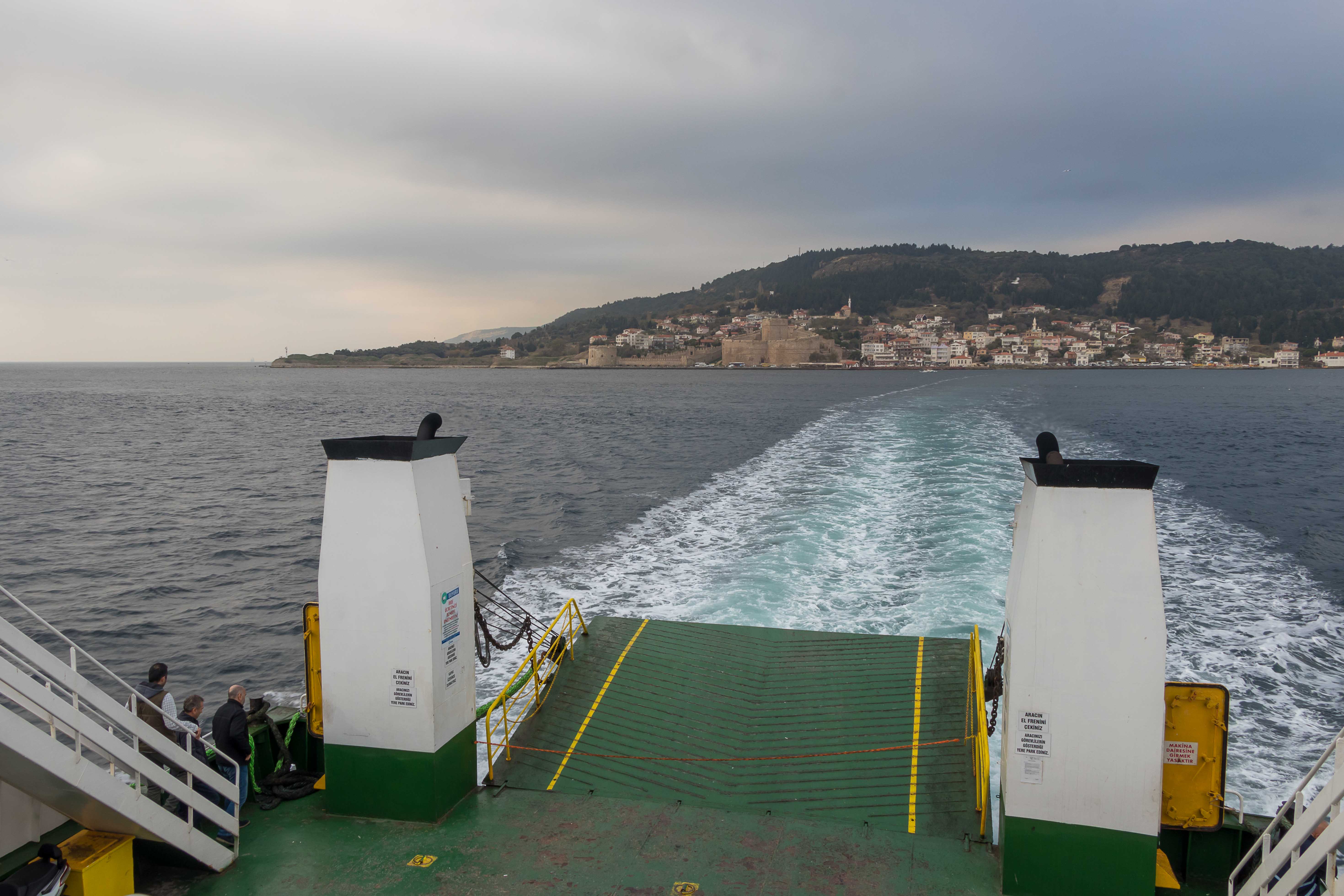 Eigentlich wollten wir nach den langen Fahrstrecken am weiten Strand der Halbinsel GALLIPOLI noch einen Tag bleiben. Doch am Morgen sind alle Fenster des Dicken sowohl außen als auch innen beschlagen, dicke graue Wolken hängen am Himmel. So fällt es uns nicht allzu schwer aufzubrechen. Wir holpern die Piste von unserem einsamen Übernachtungsplatz zurück zur Teerstraße, umrunden ECEABAT, schauen uns von außen die mächtige, frisch restaurierte, nur heute am Montag leider geschlossene, Festung in KILITBAHIR an. Dann rollen wir auf die Fähre, überqueren die DARDANELLEN und kommen bei ÇANAKKALE das erste Mal mit unseren Dicken in ASIEN an.