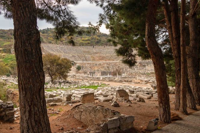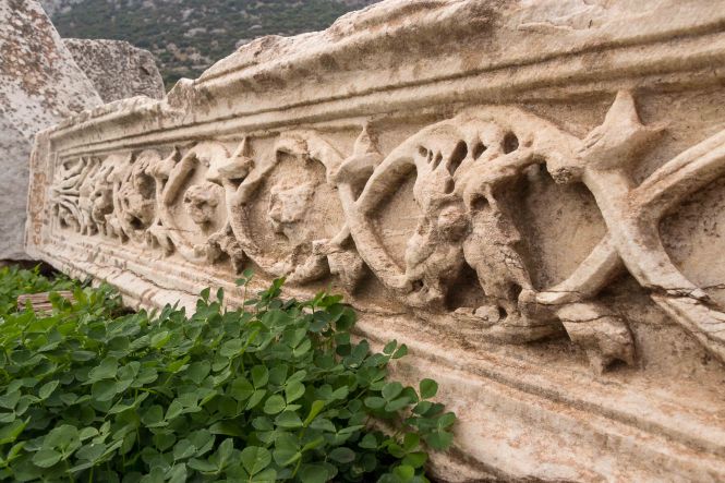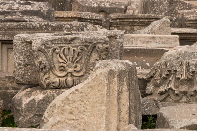 Wir brauchten kein Orakel und sind dennoch fast die ersten Besucher. Schon auf den ersten Metern überrascht uns die schiere Größe des Theaters, in dem 25 000 Menschen Platz fanden. Zum ehemaligen Hafen führt eine breite, 500 m lange Straße, für die es strenge Beleuchtungsregeln gab. An beiden Seiten standen Säulen und Verkaufsgeschäfte. Auch die anderen Straßen sind breit und prunkvoll, alle mit riesigen weißen Marmorplatten gepflastert. Neben dieser Monumentalität beeindrucken uns die vielen Details. Fast jeder Stein, und davon gibt es unwahrscheinlich viele, ist mit Ornamenten oder geometrischen Mustern verziert. An den antiken Ruinen, und davon haben wir in den letzten Jahren ja viele gesehen, fasziniert uns immer wieder der Sinn für das Schöne, das uns im Laufe der Zeit irgendwie verloren ging. Doch keine Geschichte erzählt von der Lebensweise der Bauern, Handwerker und Sklaven, ohne die diese eindrucksvollen Kunstwerke gar nicht geschaffen werden konnten.