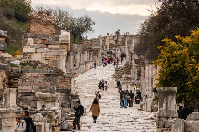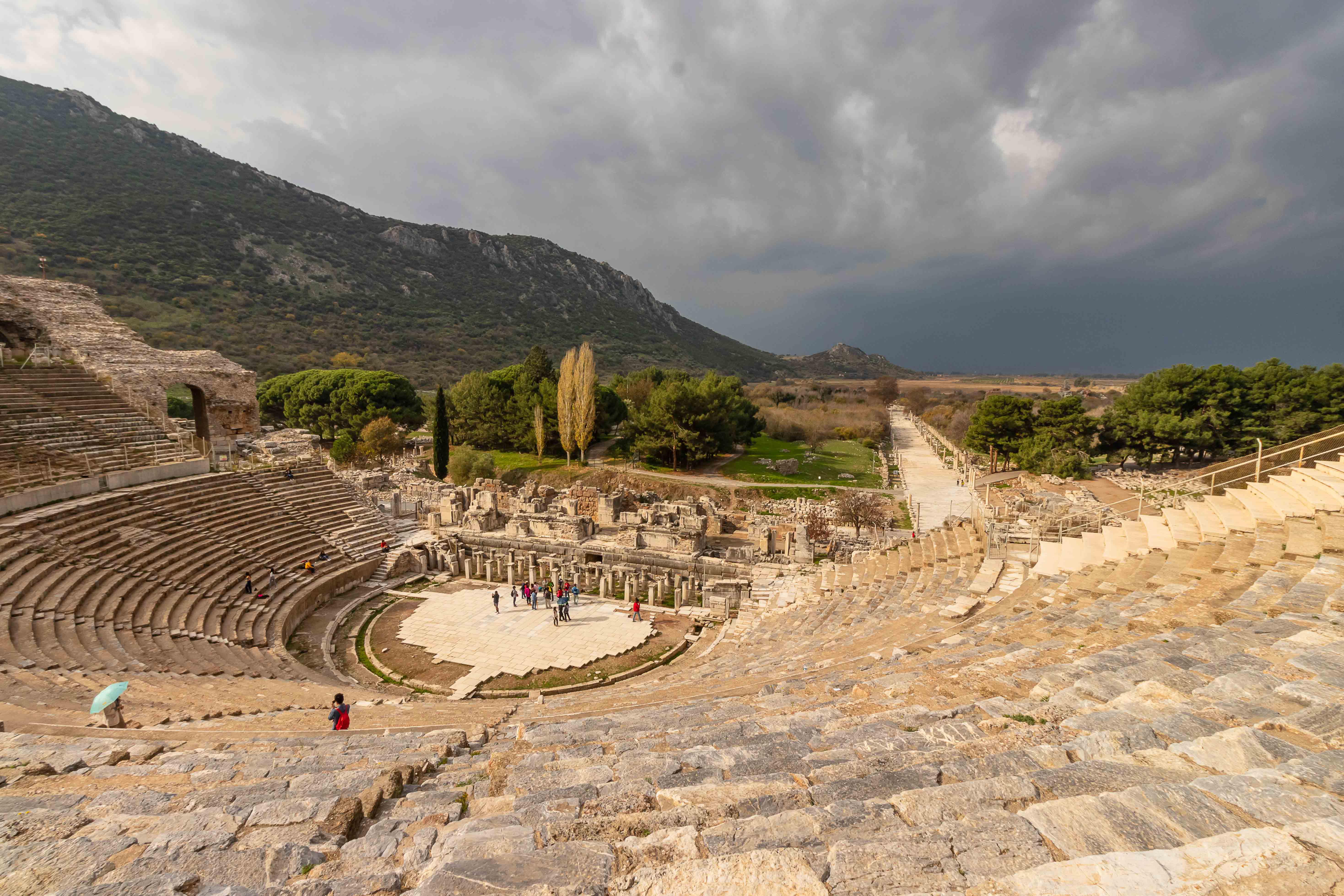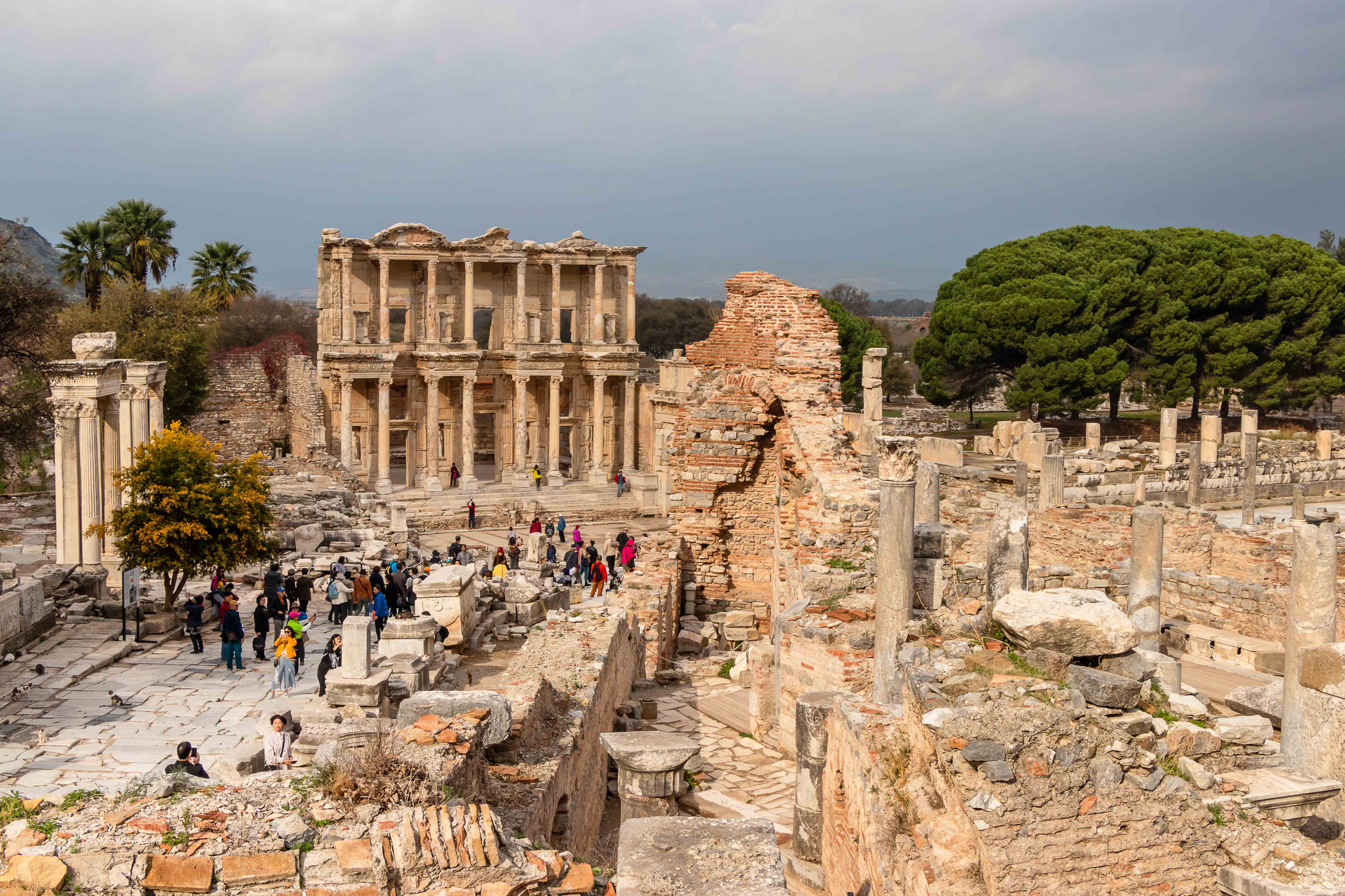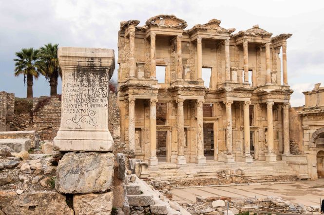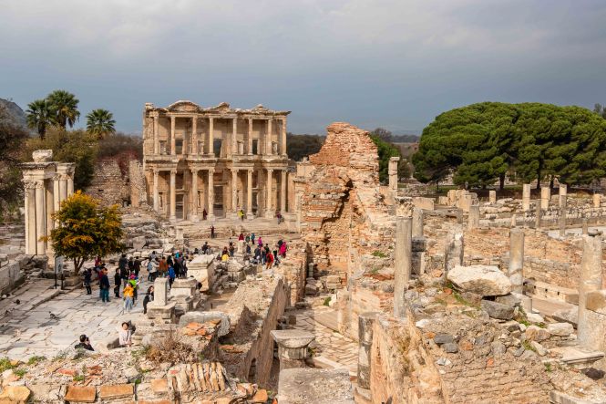 Wir kommen nach EPHESUS, der ehemaligen Weltstadt und heute UNESCO-Weltkulturerbe. Sie wurde gegründet als Athen noch ein Provinznest war und Rom noch gar nicht existierte. Ionische Siedler wollten im 11 Jh. v. u .Z. eine neue Stadt gründen. Und wie man das früher so machte, wurde bei wichtigen Entscheidungen das Orakel von Delphi gefragt. So pilgerte der Führer Androklos zu den Priesterinnen, die ihm gegen eine Spende antworteten: „Ein Fisch und ein Keiler werden dir den Ort zeigen.“ Etwas verwirrt zogen die Siedler los. Als sie einen Fisch grillten, sprang dieser noch lebendig vom Rost und riss dabei glühende Kohlen mit. Darauf ging ein Busch in Flammen auf, ein Keiler stürzte hervor und kam am Kaystro-Fluss zum Stehen.