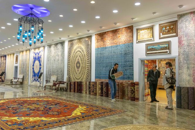 Dann werden wir natürlich von einem städtischen „Aufseher“ zu einer staatlichen Teppichknüpfschule abgeschleppt. Eine Frau opfert für uns ihre Mittagspause und führt uns das mühsame Handwerk vor, vom Spinnen der feinen Seidenfäden aus den Kokos der Raupen bis hin zum Knoten der Teppiche. Wunderschöne Stücke hängen an den Wänden, an denen die Frauen viele Monate arbeiteten. Unweigerlich kommen wir in den eleganten Verkaufsraum. „Dieser Teppich kostet 14 000 €, doch jetzt in der Nebensaison nur noch 4 500 €.“ Wir bedanken uns herzlich für die wirklich interessante Führung, nein wir wollen auch keinen Schmuck sehen, und fahren zurück zu unserem Übernachtungsplatz an den Strand.