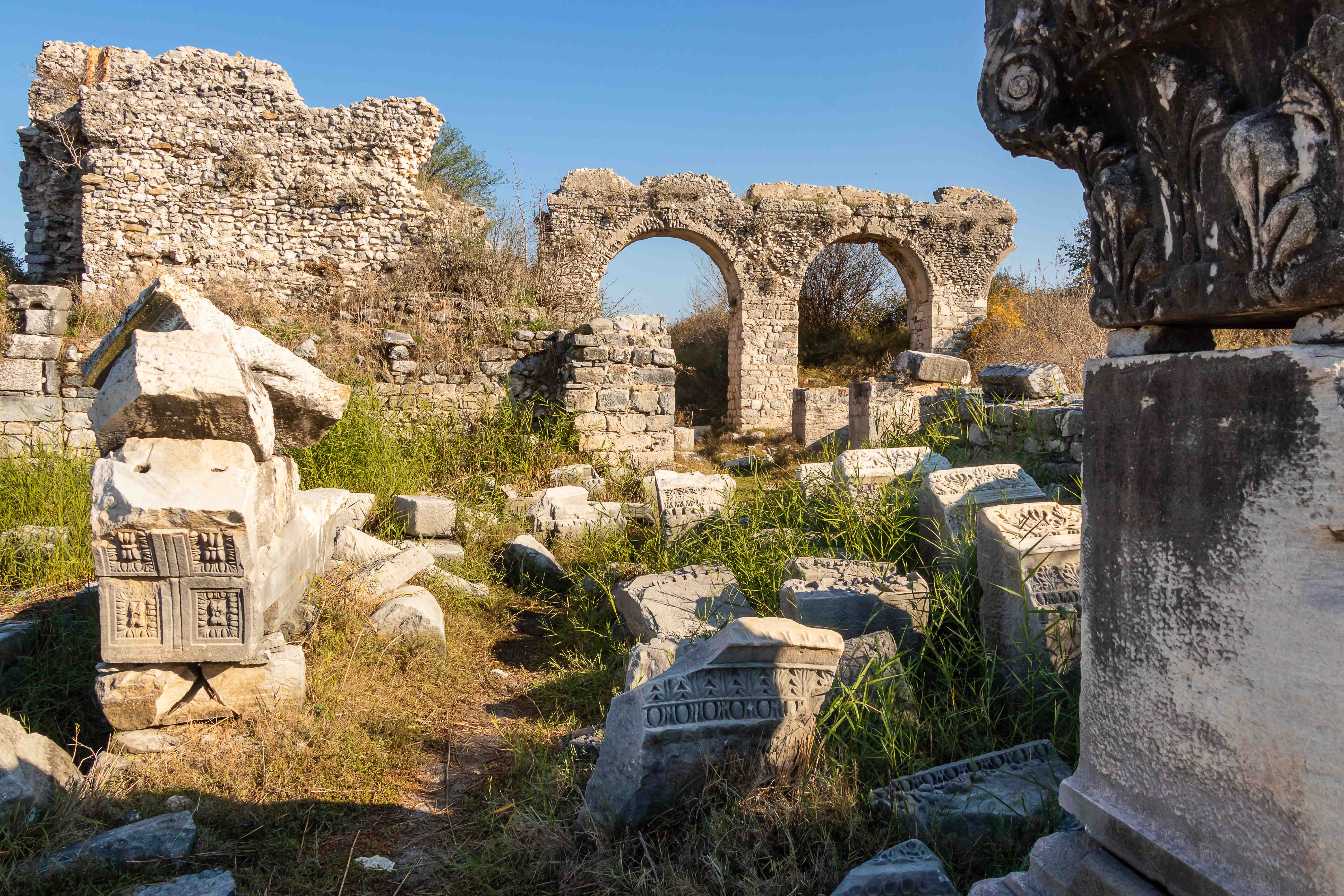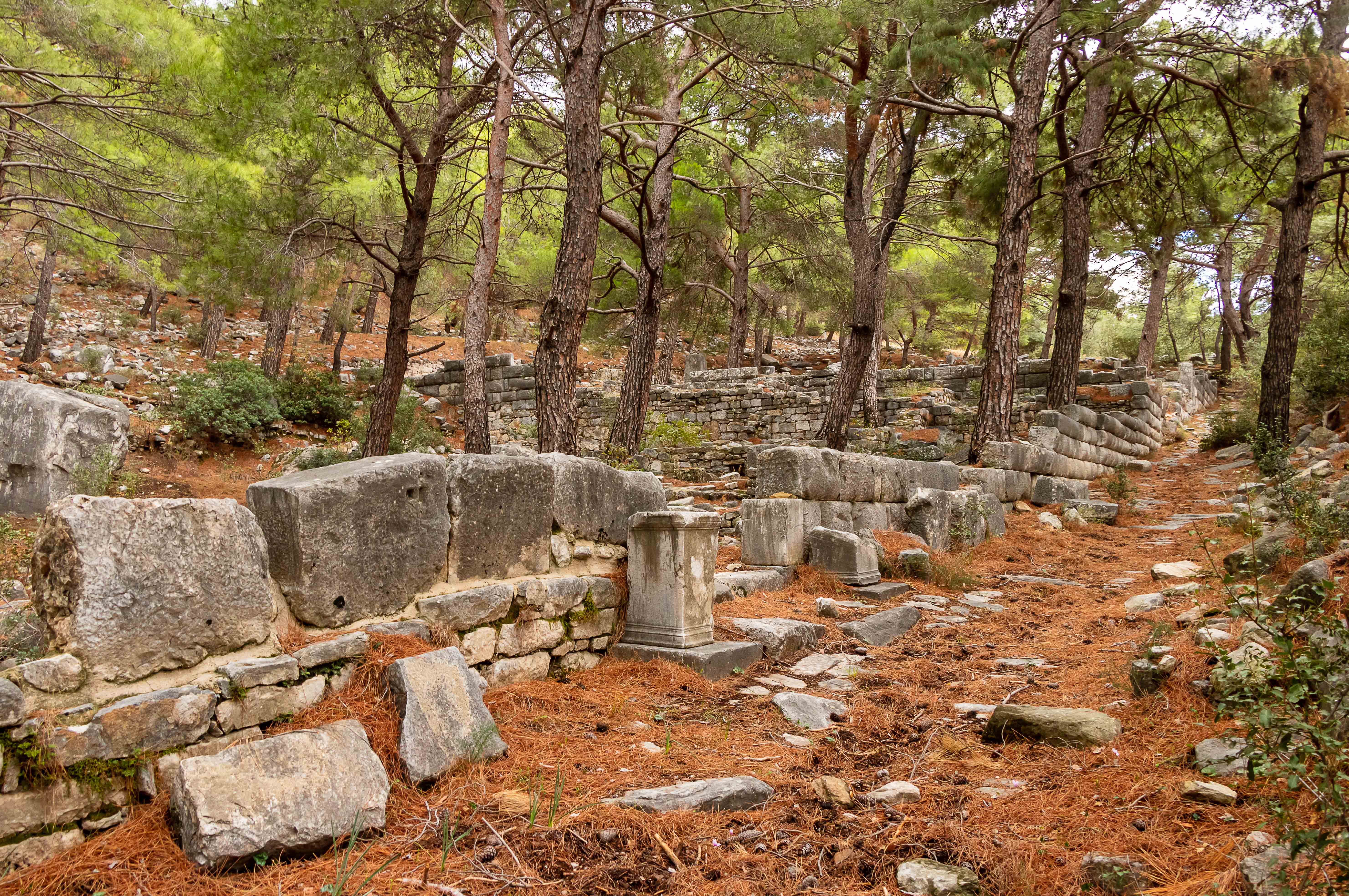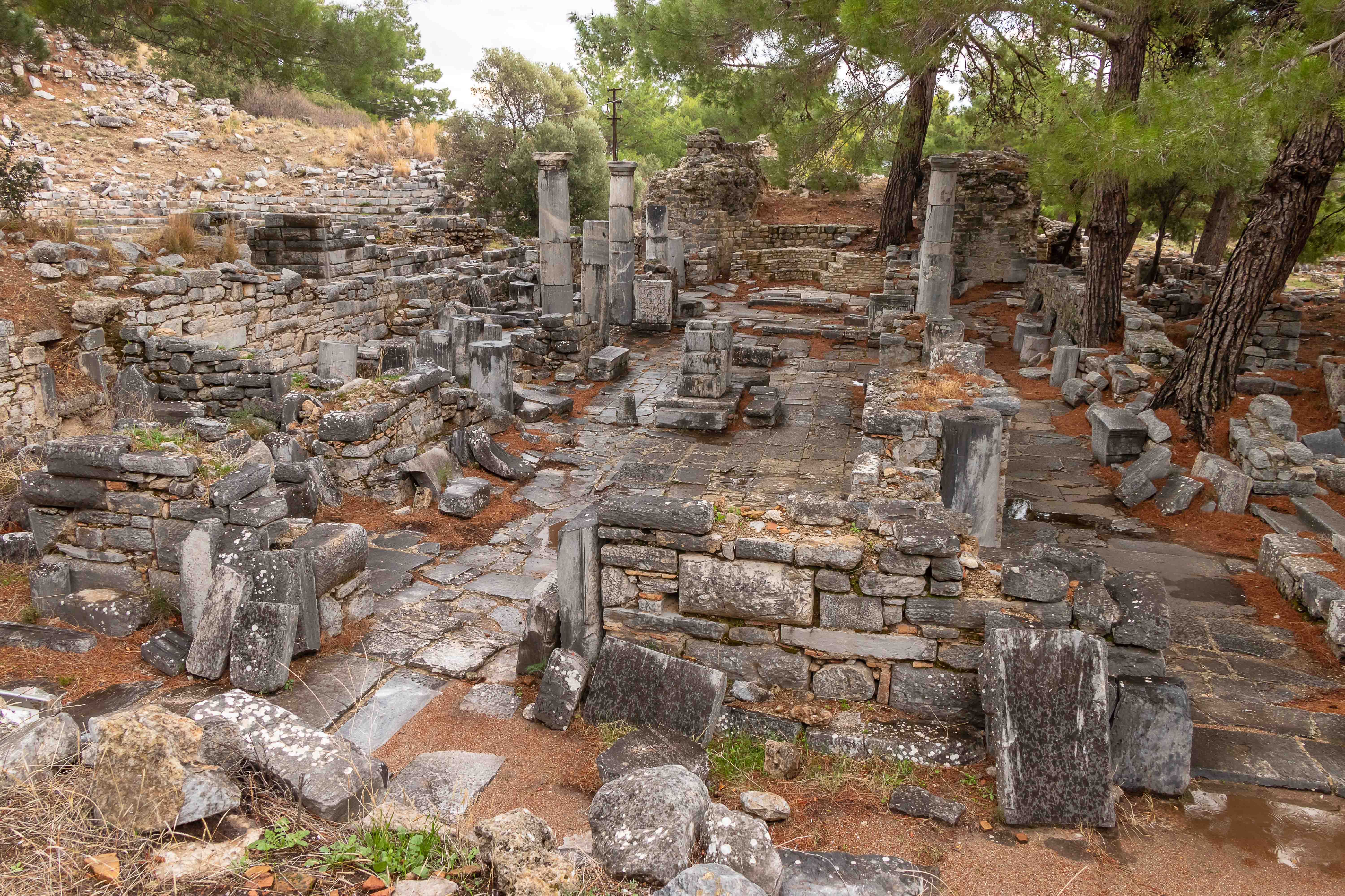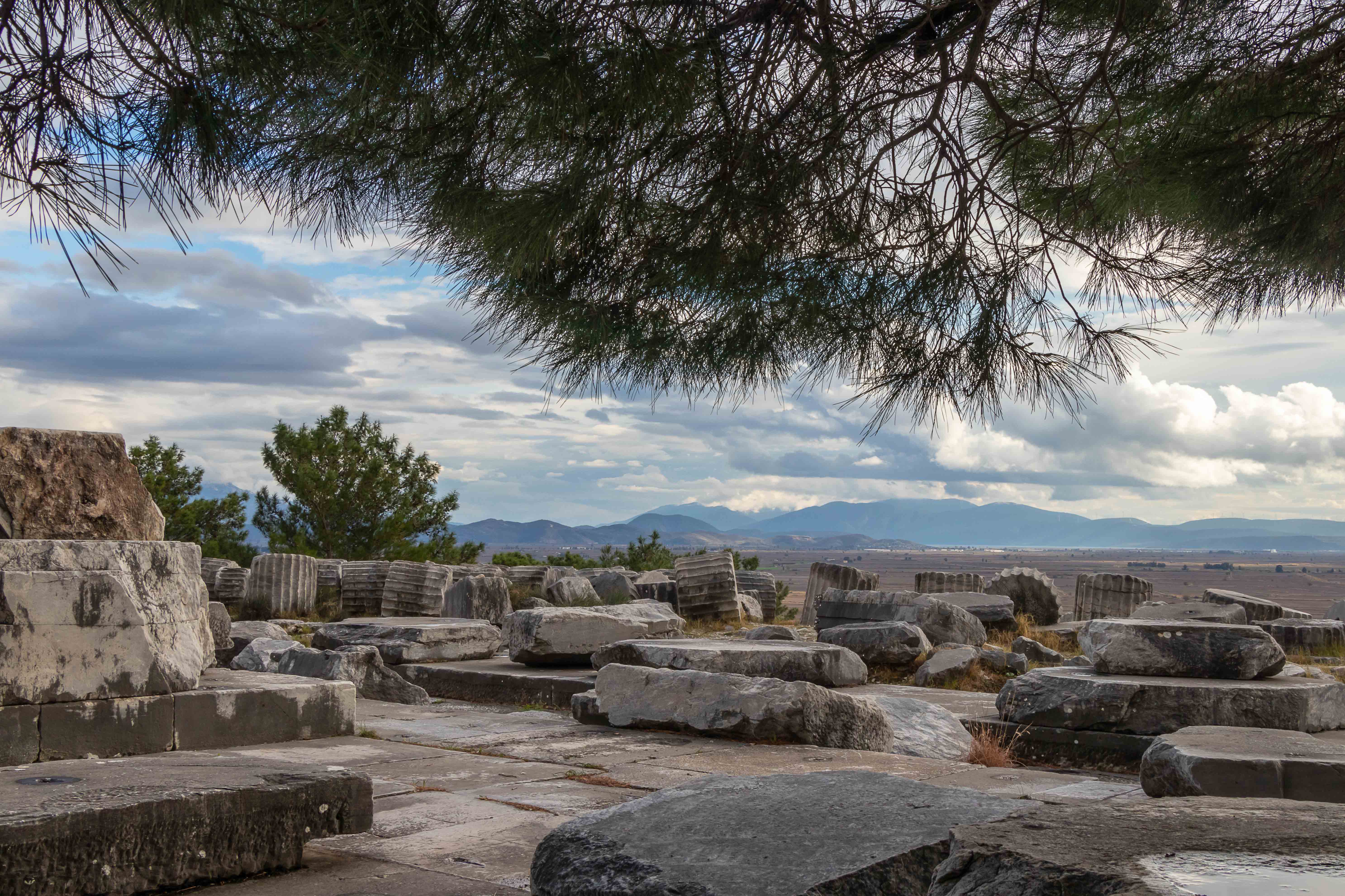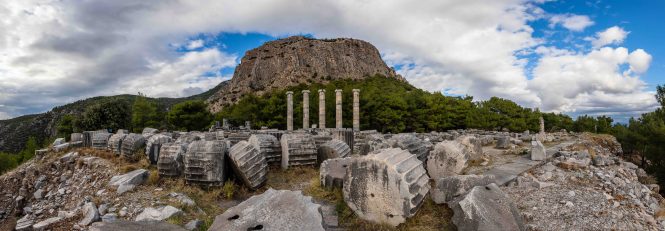 Zurück auf dem Parkplatz geht ein heftiger Platzregen nieder. Wir beschließen bei dem Wetter ein Stück weiter in den Süden zu fahren. Nachdem es grau ist und die Landschaft uns nicht so beeindruckt (was sind wir verwöhnt) steuern wir die nächste Ausgrabungsstätte an, PRIENE. Wir machen uns unter grauen Wolken gleich auf den Weg zur Besichtigung. Die alte Stadt liegt aussichtsreich über den Mäandern des Flusses BÜYÜK MENDERES, der durch sein Geschiebe, immerhin 9 Meter pro Jahr, den Hafen versanden lies und die Stadt dadurch zur Bedeutungslosigkeit verbannte. Ein Felssturz, riesige Steinbrocken liegen inmitten der ausgegrabenen Häuser, und schwere Erdbeben gaben den Gebäuden den Rest. Die gewaltigen Säulen des Heratempels liegen weit verstreut über den Hang verteilt. Das Theater ist wie alle griechischen Theater in den Hang gebaut, mit weitem Blick über die Ebene. Ein Tempel für Ägyptische Götter überrascht uns. Diese hatten eine Lösung für das Jenseits, was den griechischen Göttern anscheinend nicht so wichtig war. So wurden die fremden Götter einfach vereinnahmt und man konnte beruhigt weiterleben. Wenn doch auch die heutigen Religionen so pragmatisch gewesen wären.