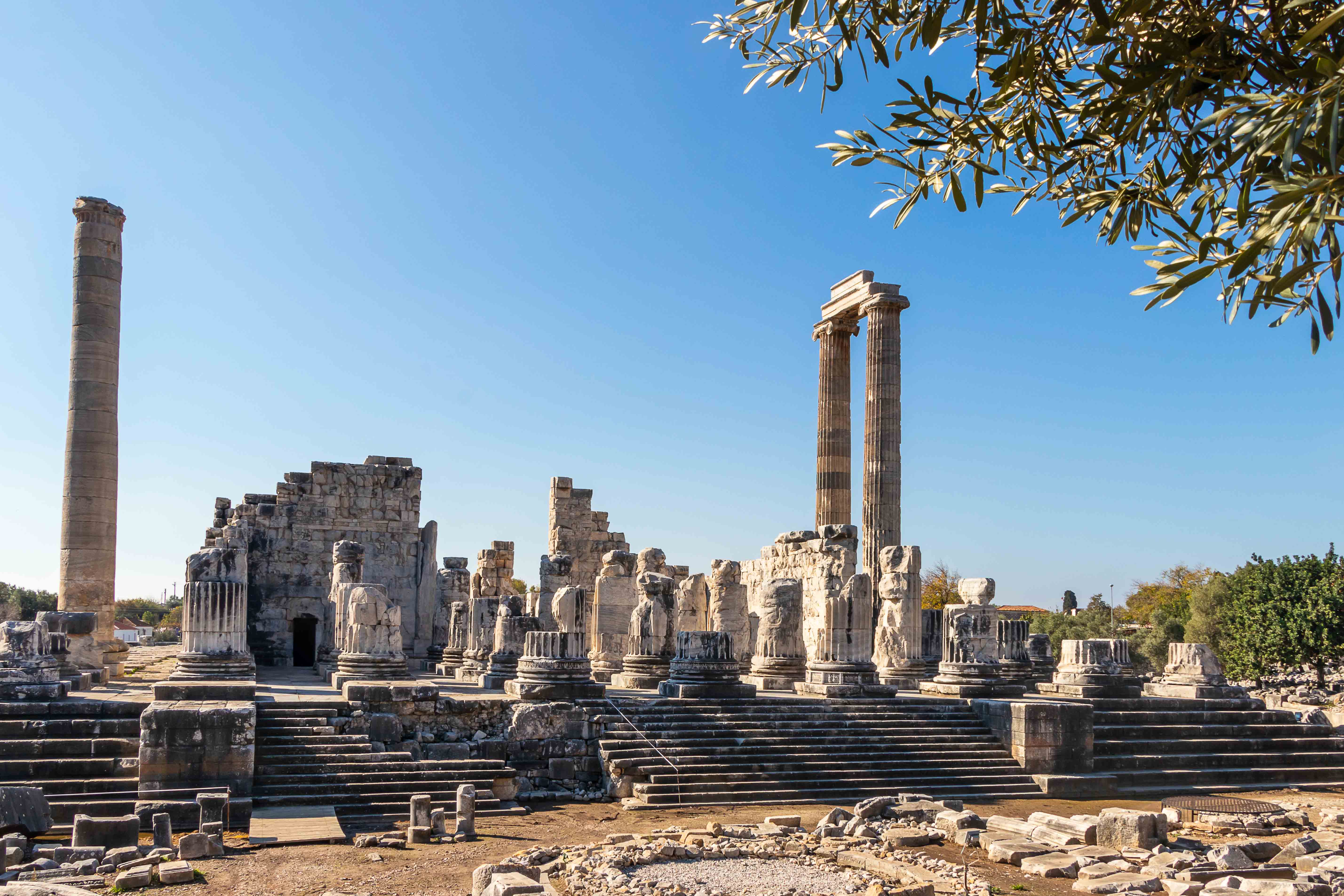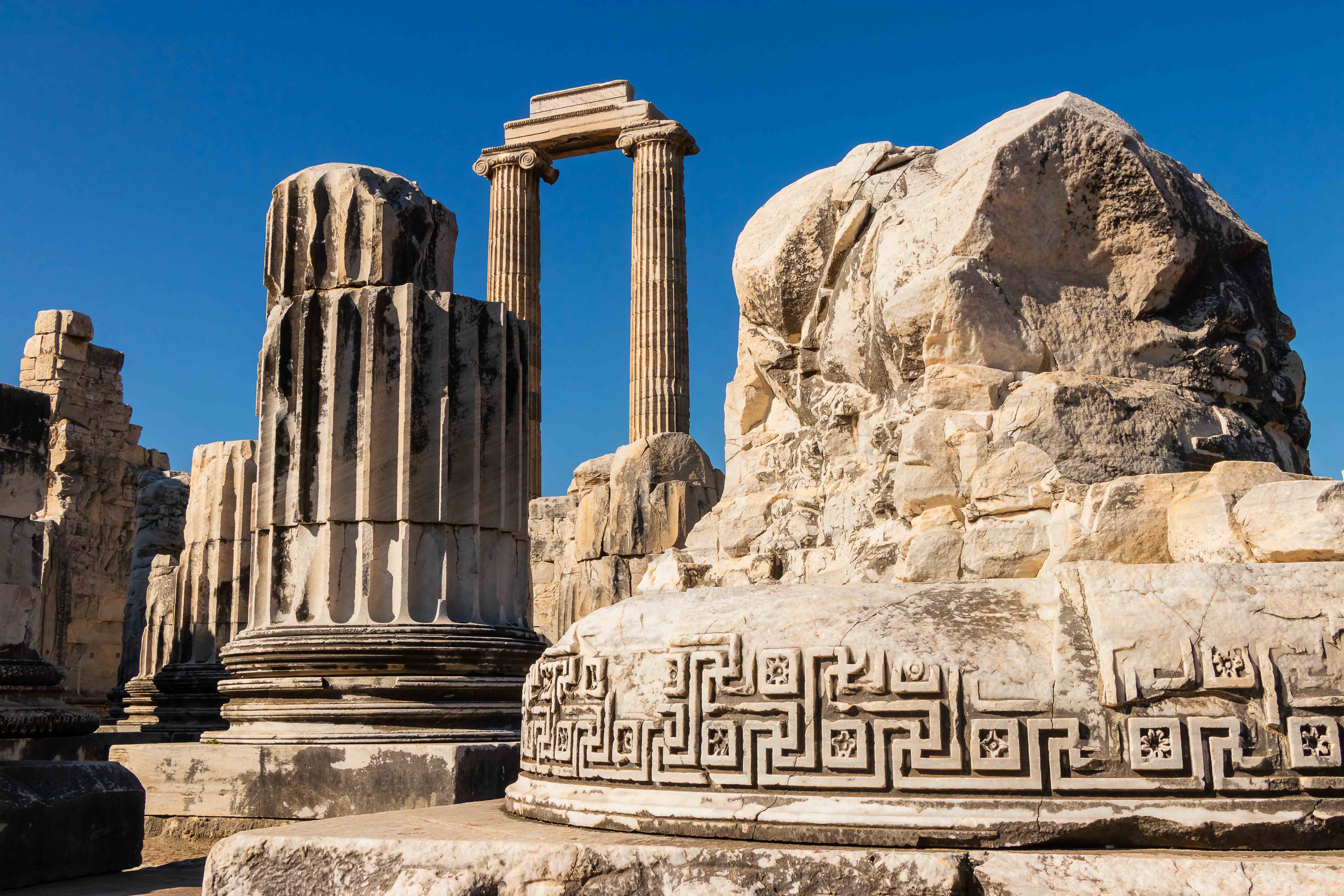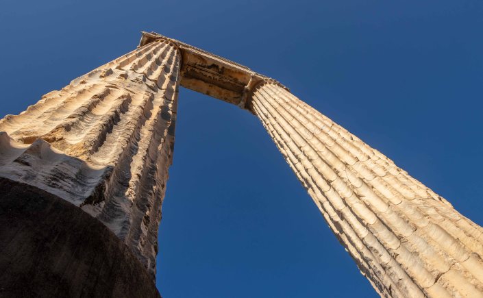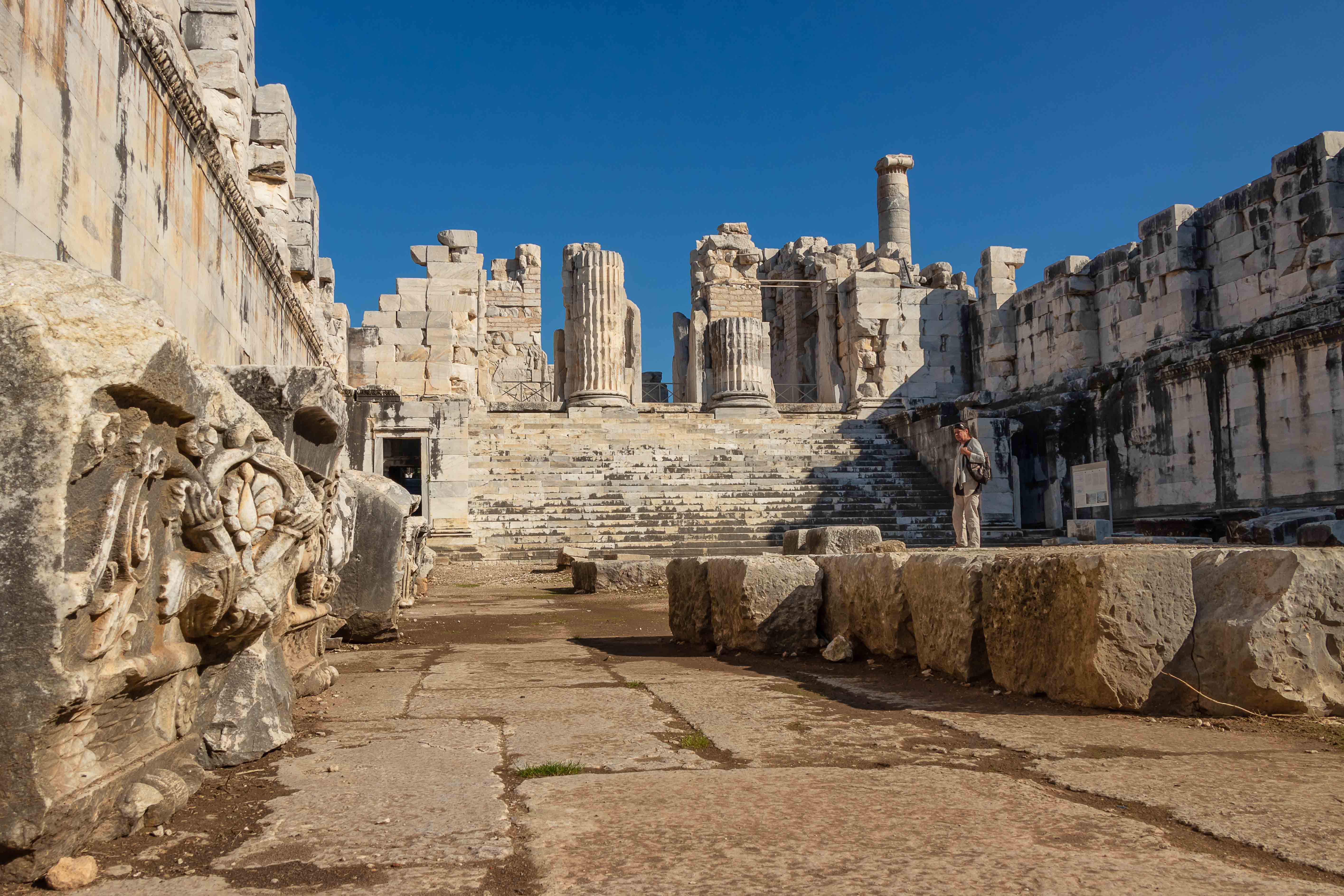 Nachdem uns die Landschaft immer noch nicht so beeindruckt, besuchen wir eine weiter historische Stätte. In DIDYMA steht die größte Tempelanlage der Türkei. Hier war nie eine Stadt, der Ort diente alleine der Verehrung des Gottes Apollons und beherbergt nach Delphi das zweit wichtigste Orakel der Antike. Nach der Zerstörung durch die Perser sollte die Stätte noch prächtiger wieder aufgebaut werden. 122 Säulen, 20 Meter hoch und am Fuße 2 Meter dick, sollten das neue Heiligtum schmücken. Eine Säule erforderte alleine 20 000 Arbeitsstunden, sodass ein Steinmetz 10 Jahre damit beschäftigt war. Wegen der immensen Kosten ist es nicht verwunderlich, dass der Tempel selbst nach 600-jähriger Bauzeit nicht vollendet werden konnte. Als das Christentum Staatsreligion wurde, stellte man die Bautätigkeiten endgültig ein. Und heutzutage glaubt man eher an Algorithmen als an Priester.