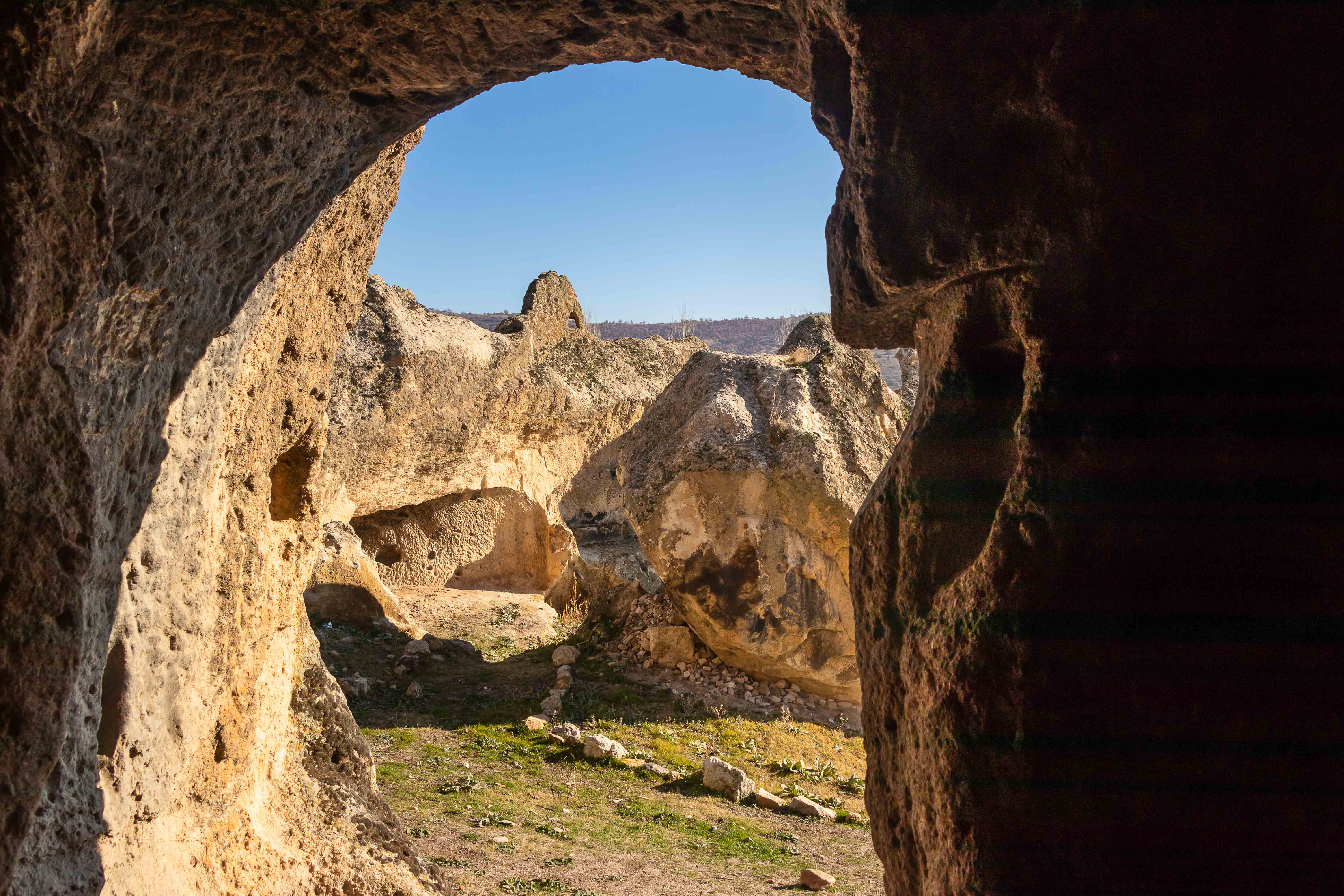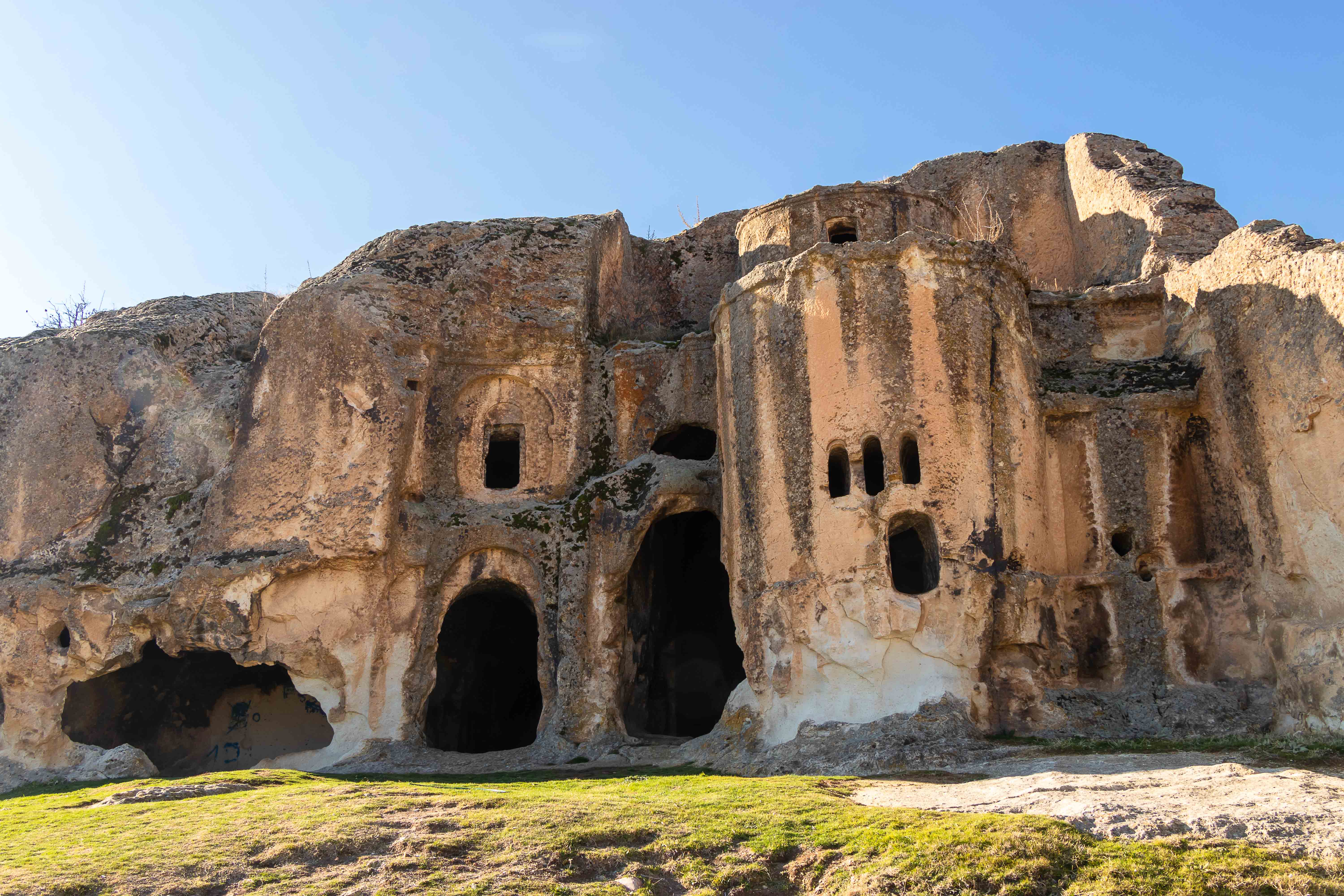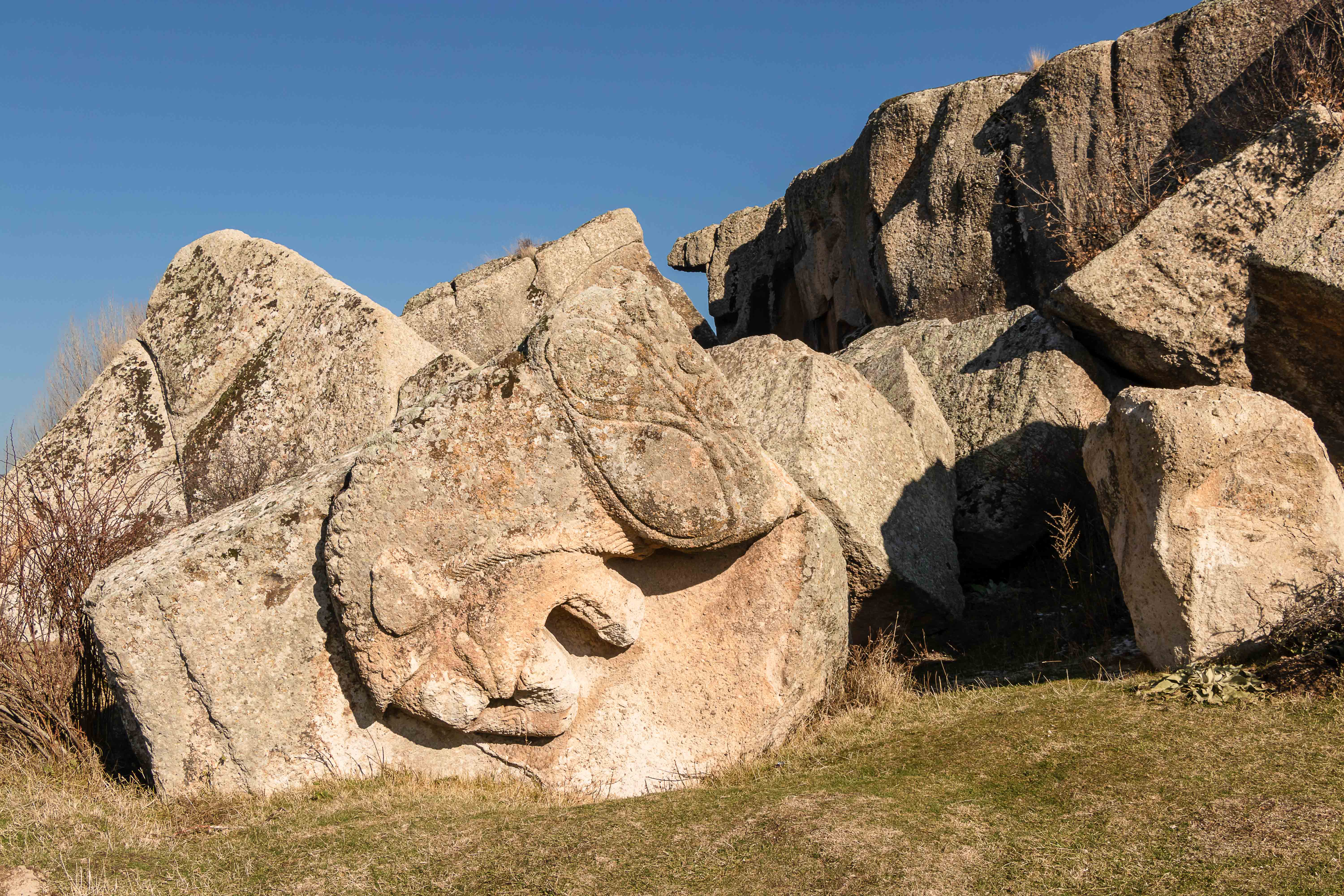 Tuffsteine stehen in der weiten Landschaft. Das alte Volk der Phryger höhlte sie aus, sie wohnten darin und bestatten ihre Toten in dem weichen Fels. Wir schauen uns die Kreuzkuppelkirche in AYAZINI an und fahren zur Übernachtung ins GÖYNÜŞ-TAL. Hier entdecken wir einen gestürzten Löwen, der einst ein Grab bewachte. Ein paar Meter weiter finden wir einen guten Platz. Die Jandarma kommt vorbei, prüft Peters Pass sowie den Einreisestempel und sagt den Standardspruch: „No problem.“