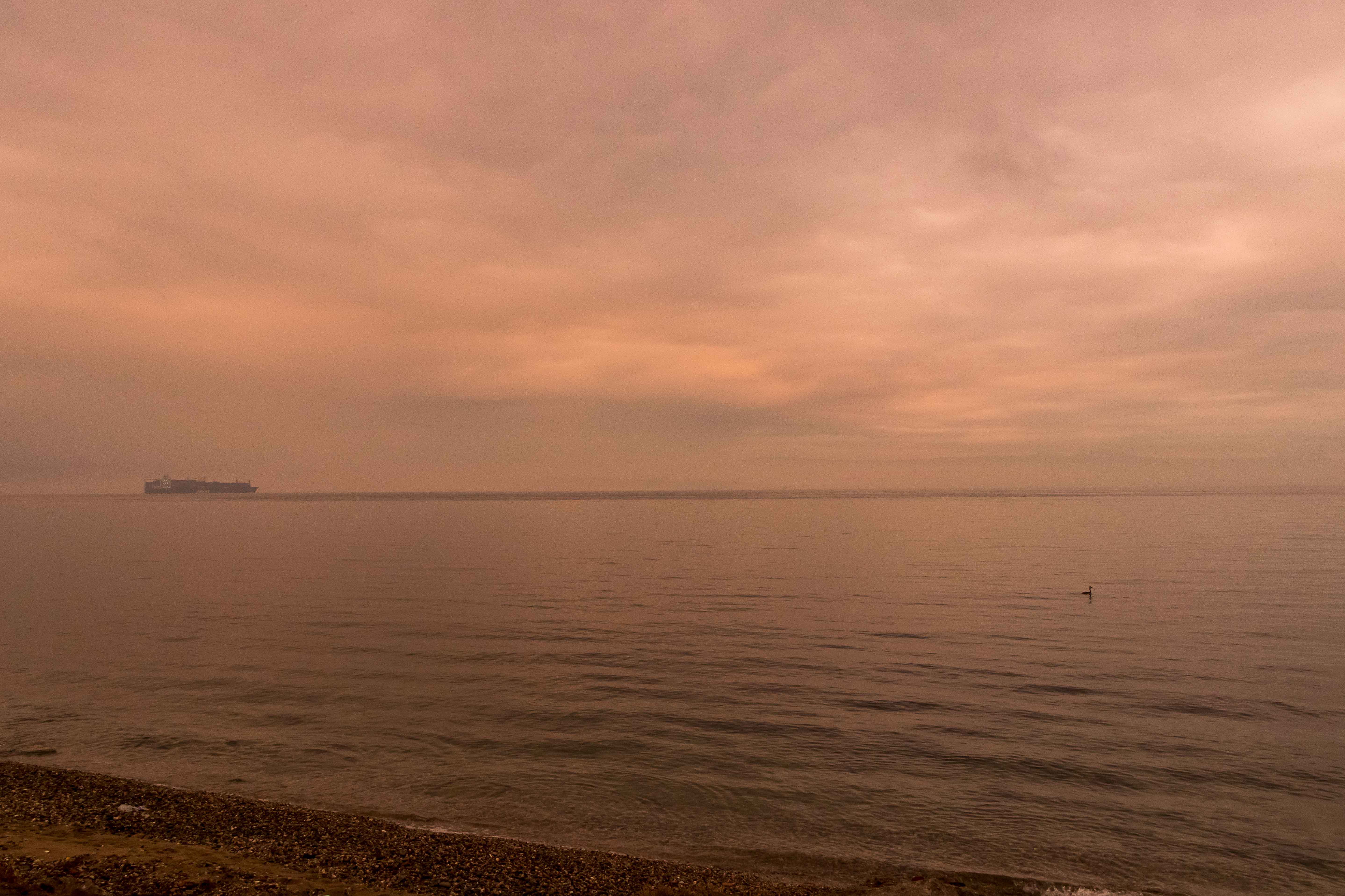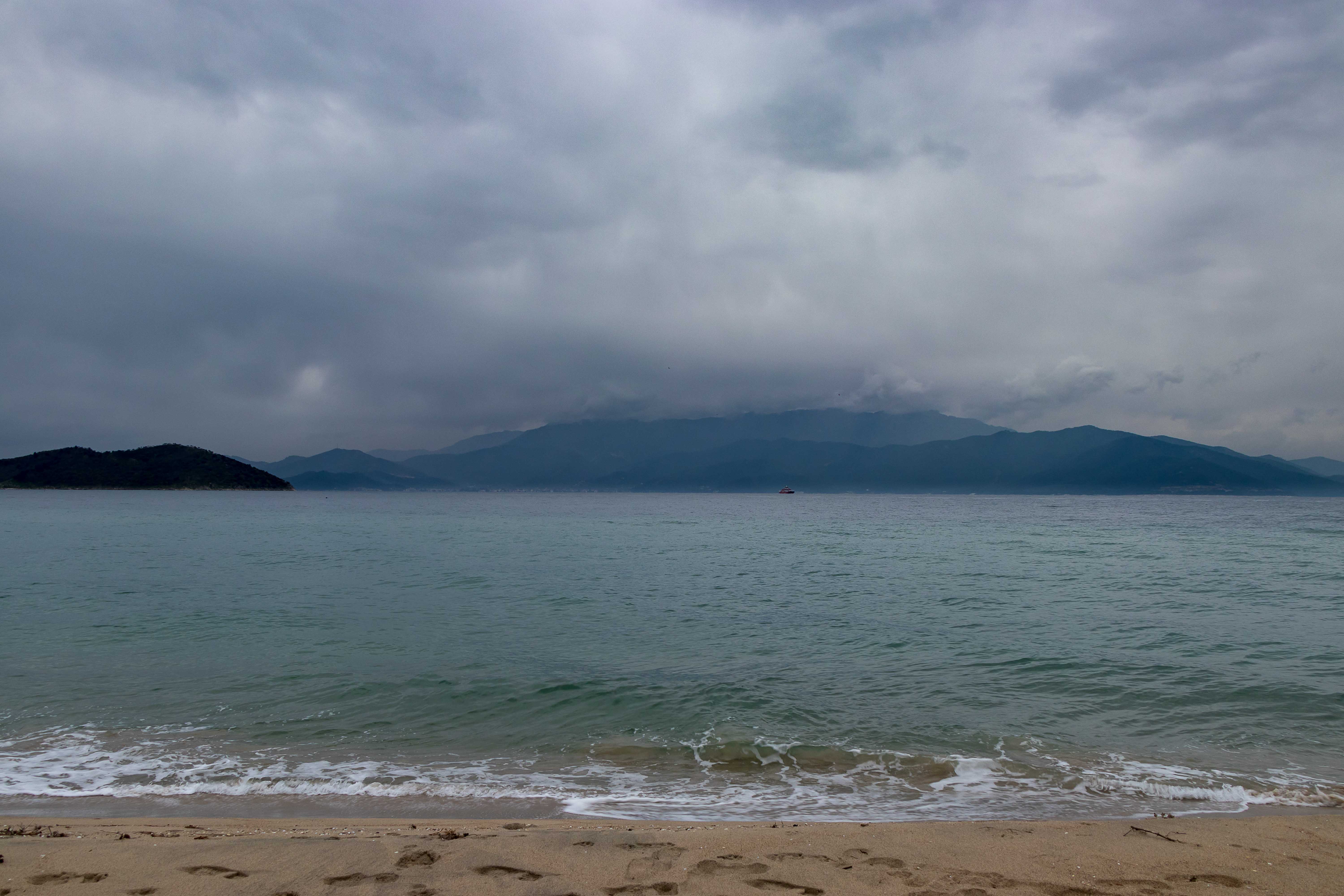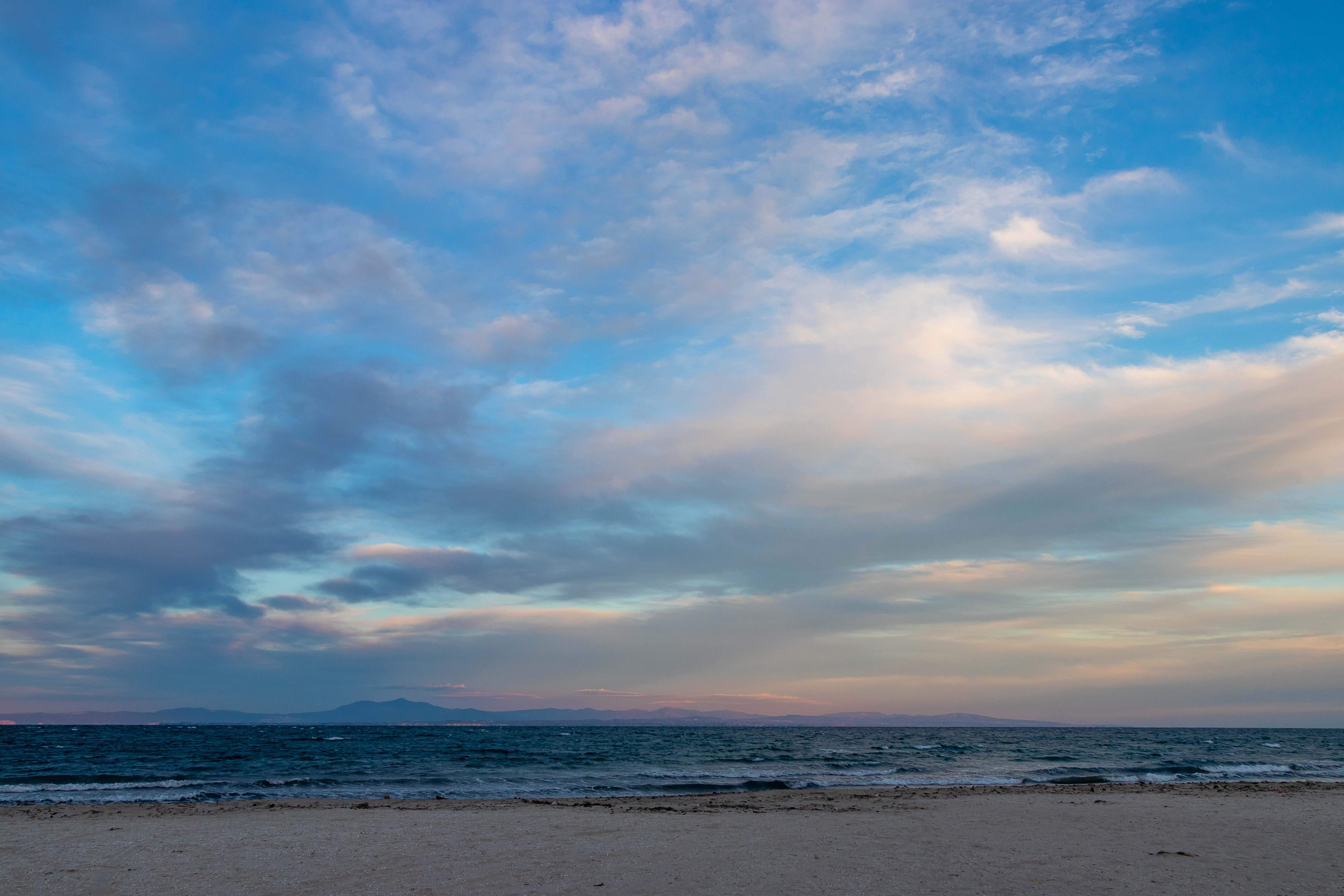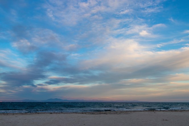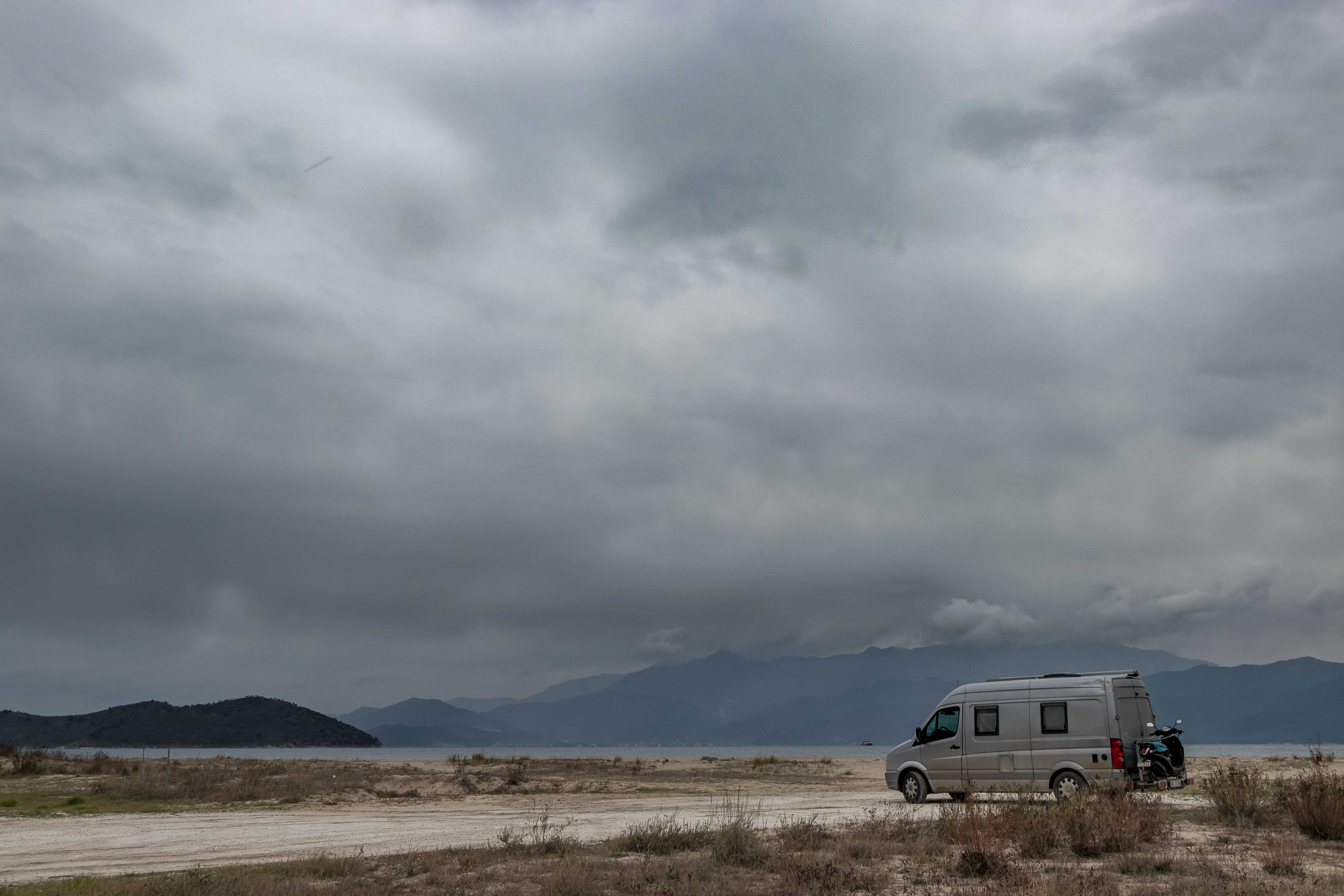 Auch am nächsten Morgen sehen wir die Sonne nur für ein paar Augenblicke als sie die dunklen Wolken kurz rot aufleuchten lässt. Dann fahren wir im Regen und streckenweise im dichten Nebel zügig weiter. In KEŞAN geben wir unsere letzten türkischen Lire aus und kommen schnell an die Grenze nach GRIECHENLAND. Auch bei der Ausreise aus der TÜRKEI müssen wir vier Posten passieren, alleine die Durchsuchung des Dicken bleibt uns diesmal erspart. Zur Einreise in die EU stauen sich die Lastkraftwagen. Ein paar Fahrer und junge Soldaten winken uns auf der nur zweispurigen Straße an der Schlange vorbei. Die Einreise nach GRIECHENLAND geht flott. Wir nutzen die kostenlose Autobahn und fahren unter grauen Wolken durch die flache und etwas eintönige Landschaft, Wolken quälen sich über die Berge. Wir umrunden ALEXANDROUPOLI und machen eine kurze Rast in MAKRI, in dessen Hafen wir bei der Herfahrt übernachteten. Dann zieht die Landschaft wieder schnell vorbei. Für die Nacht kommen wir nach KERAMOTI, wo wir am langen Strand mit Blick auf die Insel THASSOS einen ruhigen und schönen Platz finden.
