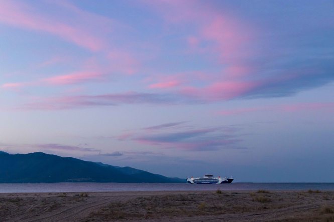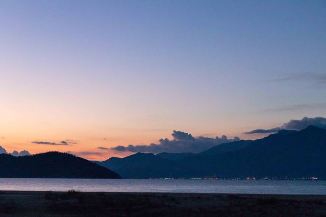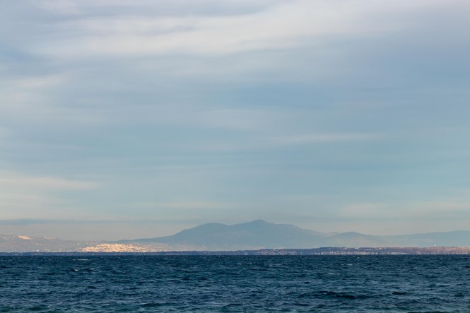 Auf unseren flotten Fahrt in den Süden scheinen wir nur die Sonnenaufgänge so richtig wahrzunehmen. Die Nacht am Meer an dem weiten Strand war wieder kalt. Schon in der Morgendämmerung tuckern die Fähren zur Insel THASSOS. Mit dem ersten Licht fahren wir los, um uns an der Heizung des Dicken zu wärmen. Wir durchqueren KAVALA, bleiben diesmal an der Küste, schneiden die drei Finger der CHALKIDIKÍ ab und kommen an den lang gestreckten VÓLVI-SEE. Da wir hier keinen geeigneten Vesperplatz finden, fahren wir weiter bis auf einen Höhenzug vor THESSALONIKI. Zum Bleiben regt uns der schattige und wenig aussichtsreiche Platz nicht an. So umrunden wir die Großstadt und landen schließlich auf der anderen Seite der weiten Bucht an einem langen Strand bei ALYKI. Ruhig, unbeleuchtet, ohne Mücken und mit moderaten Wind verbringen wir die Nacht. Nur die Temperaturen bringen unsere Heizung wieder zum Laufen.