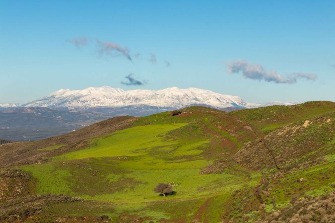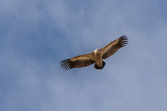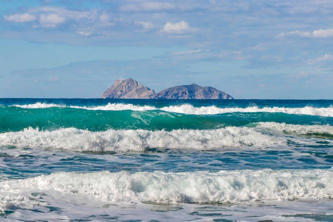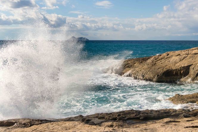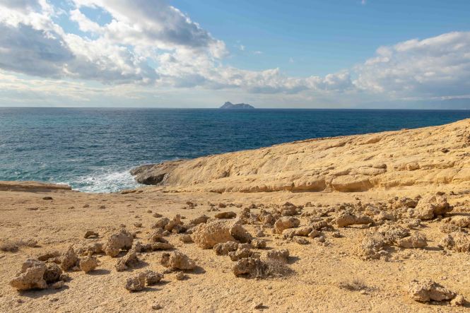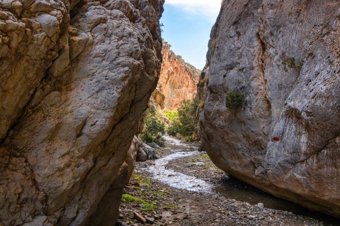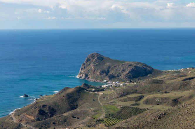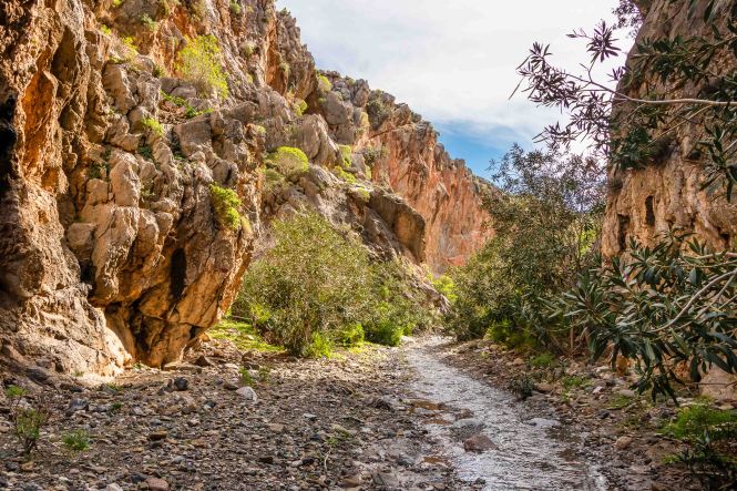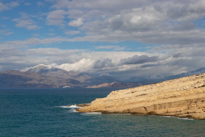 Mit der Wanderung auf den KOFINAS wird es heute leider nichts, die Straße und der Gipfel sind voller Schnee. Wir kehren lieber um, fahren hinunter in die weite MESSARÁ-EBENE, dann noch einmal hinauf auf einen Pass, von dem wir den weinenden Löwen von LÉNTAS sehen (der eher Ähnlichkeit mit einen Elefanten hat). Als sich Afrika von Kreta trennte, verpasst der Löwe den Absprung, fing alsdann bitterlich das Weinen an und versteinerte über seinen Kummer. In 10 Millionen Jahren wird er mit KRETA wieder in AFRIKA ankommen, da sich die Ägäis mit 3 cm pro Jahr nach Süden schiebt. Wir fahren bis zu einem neuen Hafen (der EU sei Dank), in dem sich eine ganze Menge Kreter versammeln. Peter wandert durch die kleine und enge TRACHOULAS-SCHLUCHT zur gleichnamigen Bucht. Geier kreisen im starken Nordwind. Im Windschatten am langen Sandstrand ist er herrlich warm, sodass ich natürlich ins Wasser springen muss.