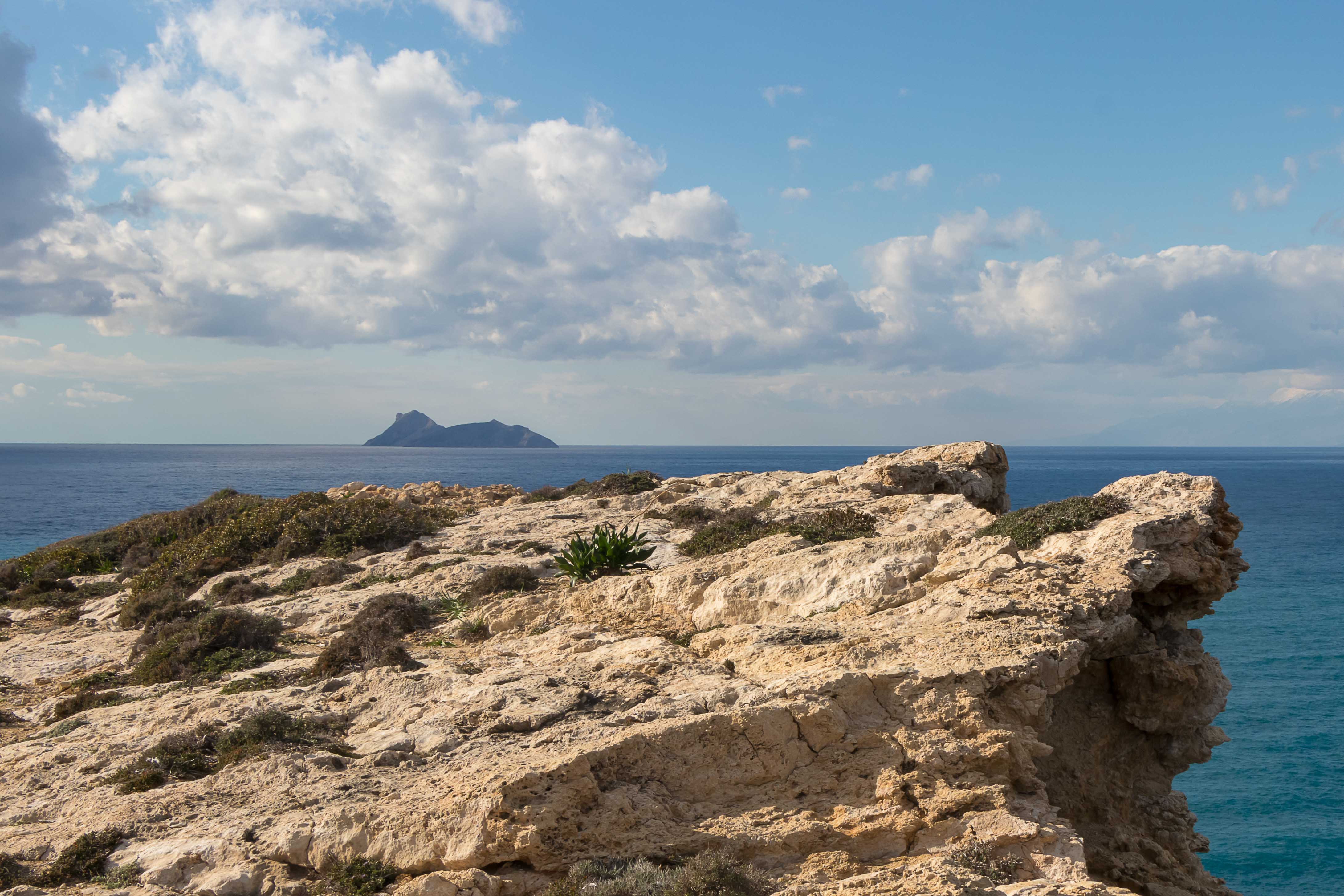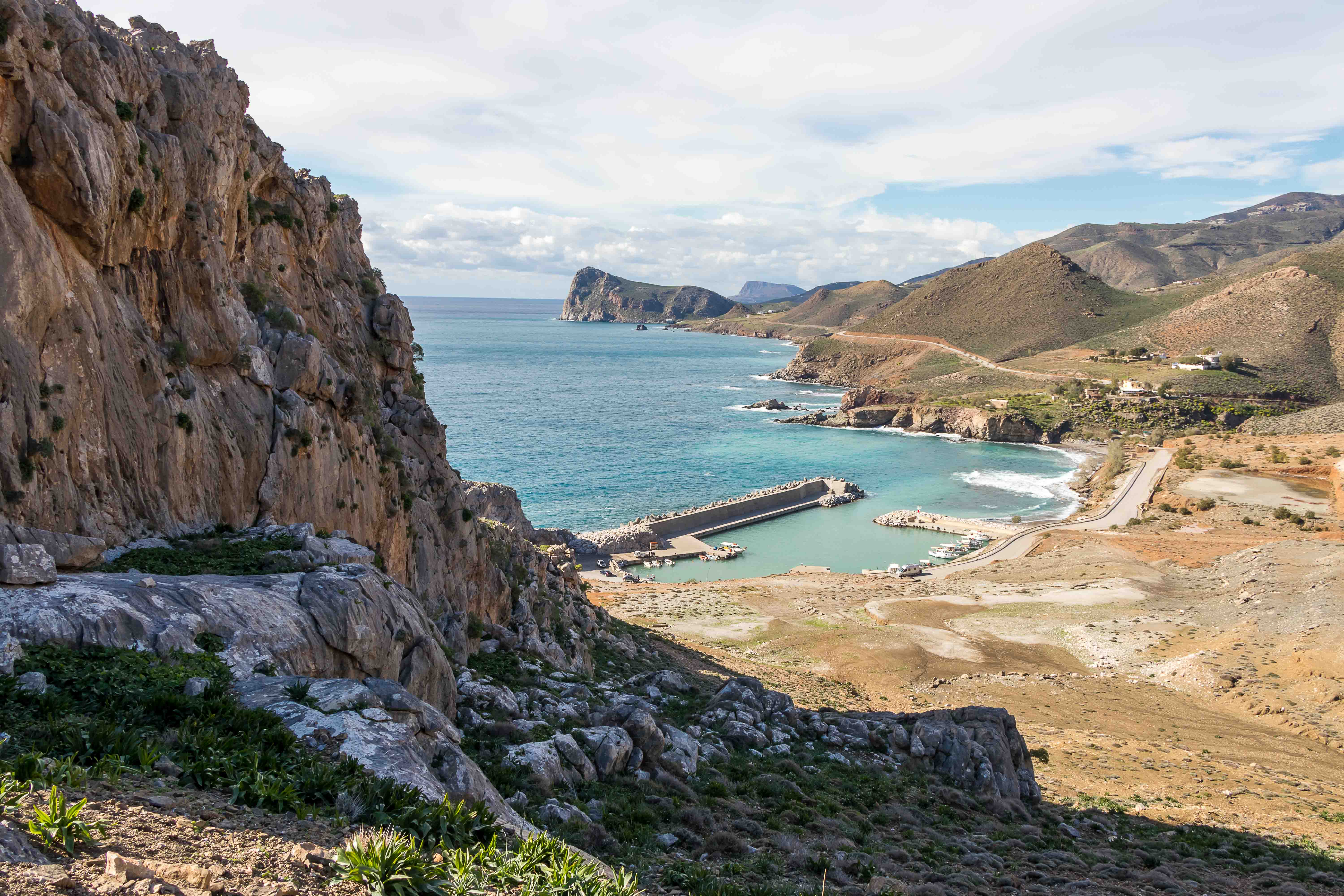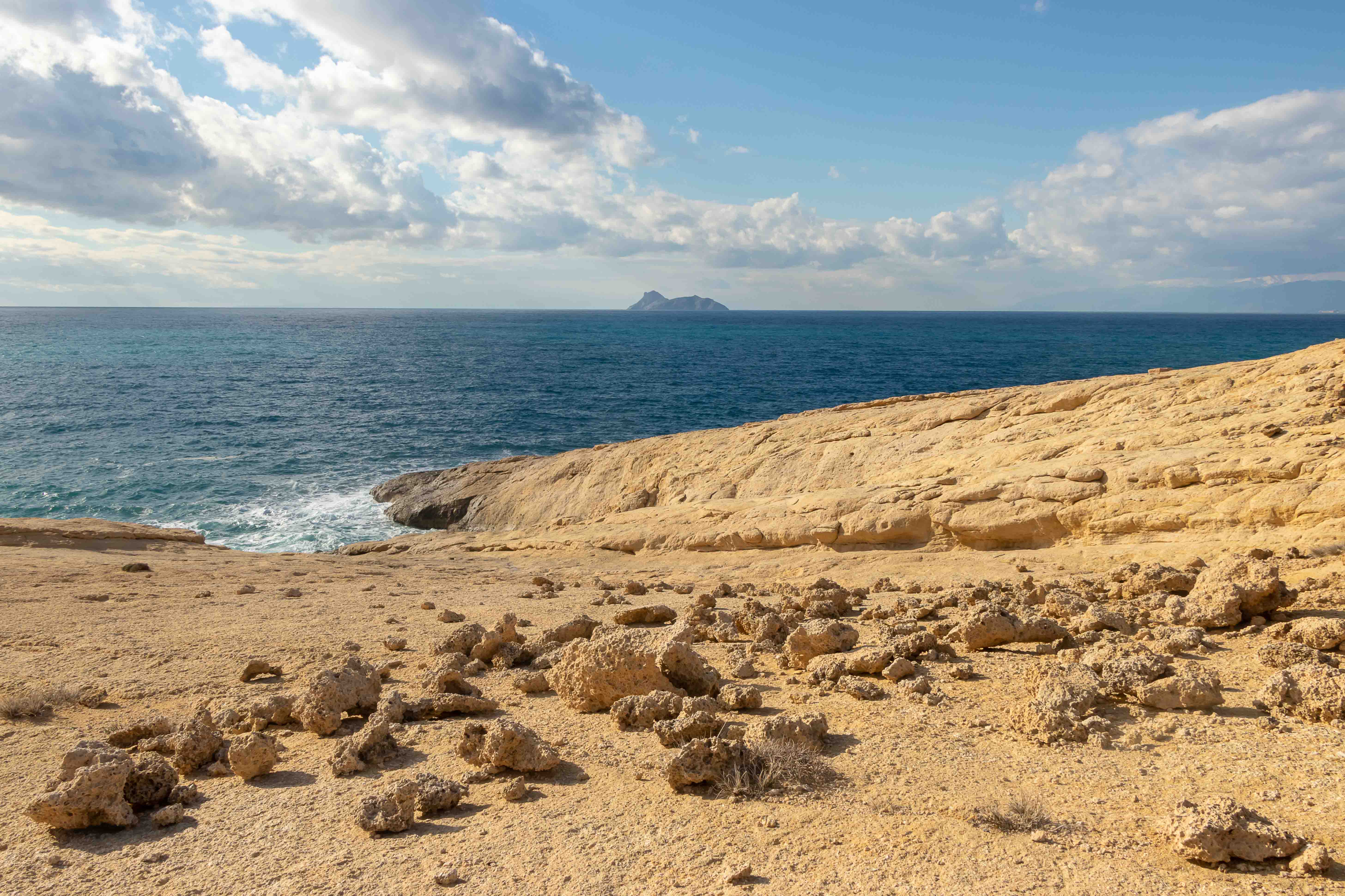 Mit der Wanderung auf den KOFINAS wird es heute leider nichts, die Straße und der Gipfel sind voller Schnee. Wir kehren lieber um, fahren hinunter in die weite MESSARÁ-EBENE, dann noch einmal hinauf auf einen Pass, von dem wir den weinenden Löwen von LÉNTAS sehen (der eher Ähnlichkeit mit einen Elefanten hat). Als sich Afrika von Kreta trennte, verpasst der Löwe den Absprung, fing alsdann bitterlich das Weinen an und versteinerte über seinen Kummer. In 10 Millionen Jahren wird er mit KRETA wieder in AFRIKA ankommen, da sich die Ägäis mit 3 cm pro Jahr nach Süden schiebt. Wir fahren bis zu einem neuen Hafen (der EU sei Dank), in dem sich eine ganze Menge Kreter versammeln. Peter wandert durch die kleine und enge TRACHOULAS-SCHLUCHT zur gleichnamigen Bucht. Geier kreisen im starken Nordwind. Im Windschatten am langen Sandstrand ist er herrlich warm, sodass ich natürlich ins Wasser springen muss.