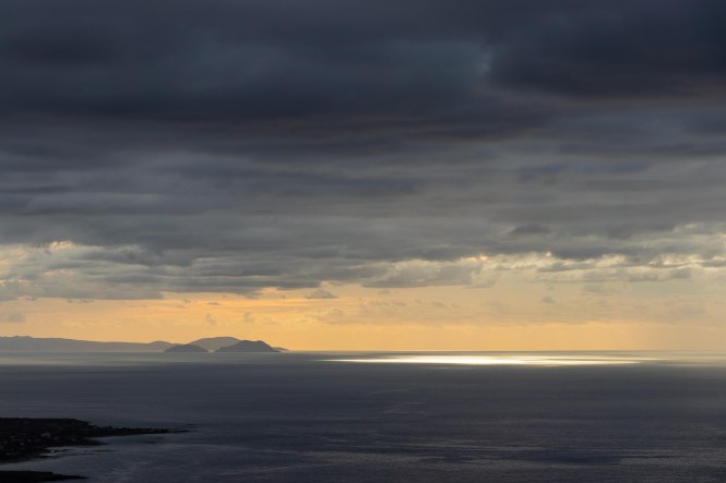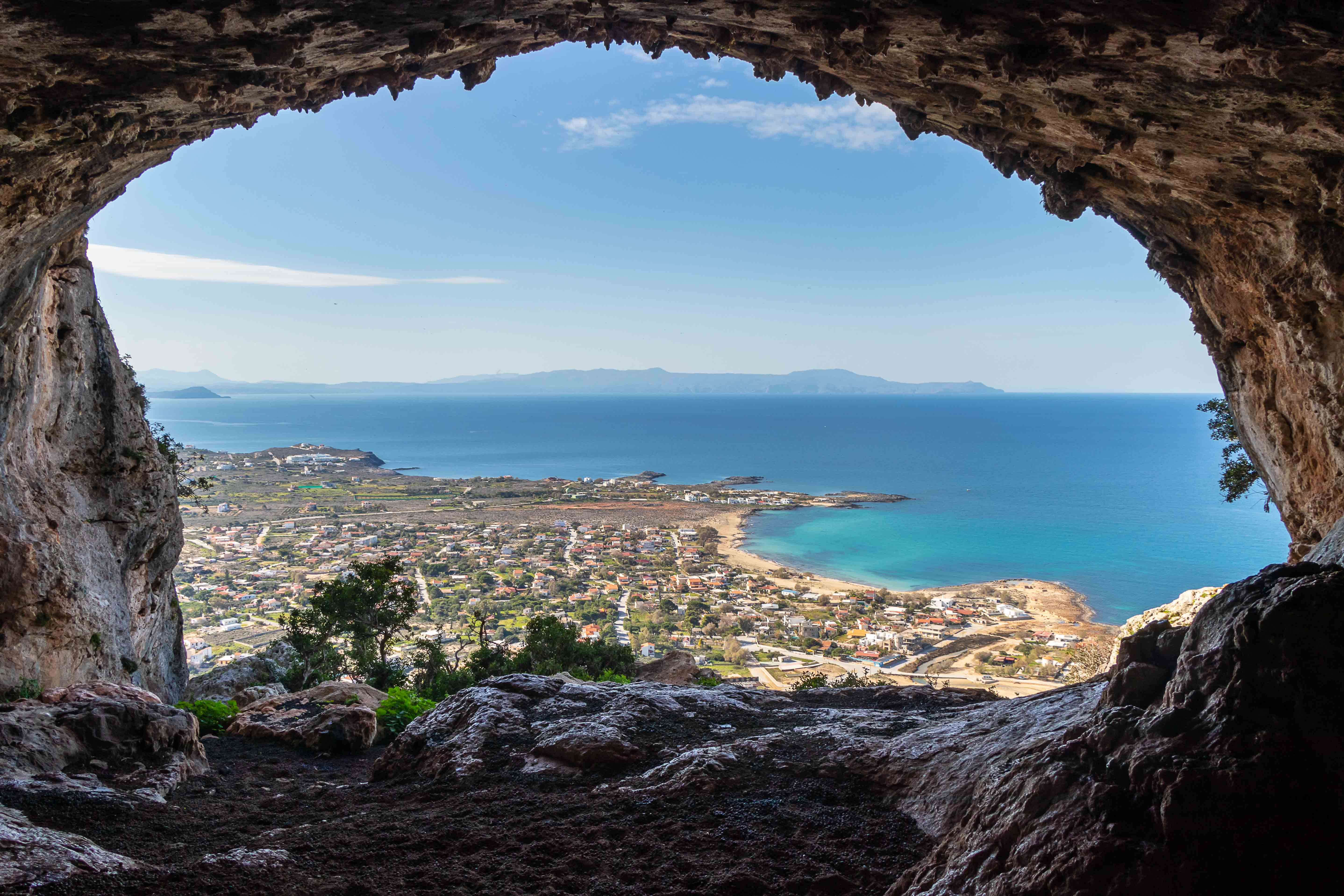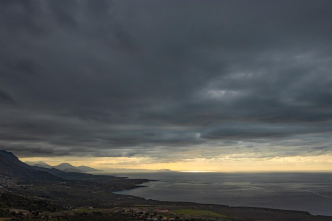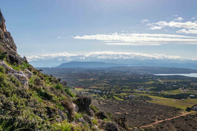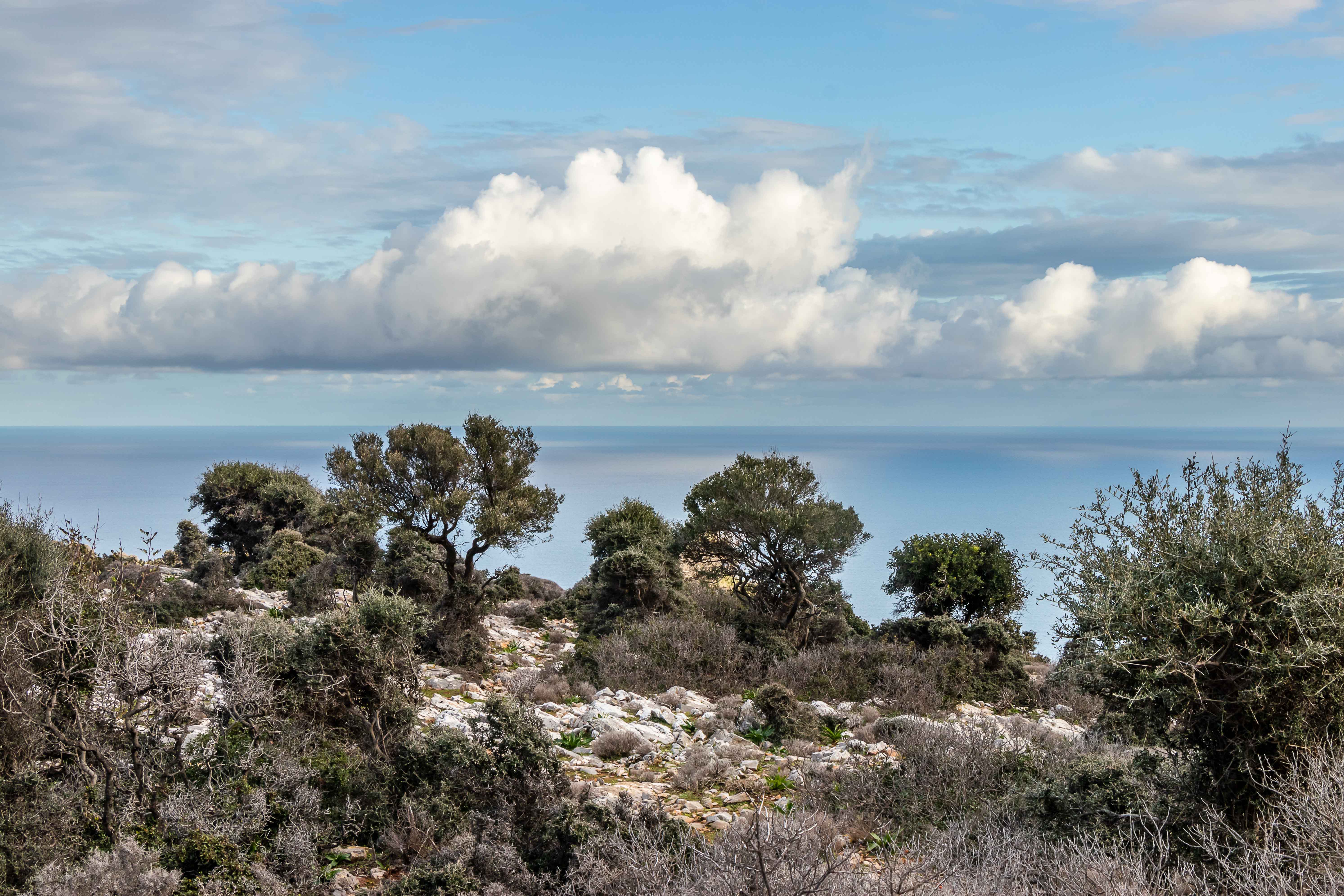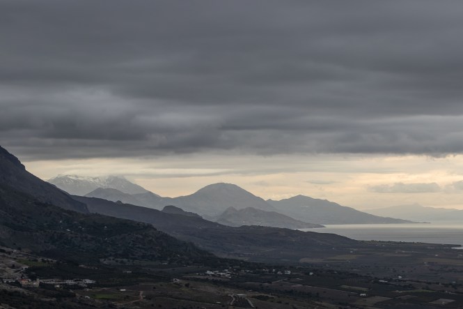 Der Frühling ist nun wirklich da, nicht überall, man muss in noch ein wenig suchen. So präsentiert sich der Himmel am Morgen im einheitlichen Grau. Vermutlich schiebt der Nordwind feuchte Luft über die fast 2500 m hohen Berge, die dort kondensiert und den Süden mit dunklen Wolken überzieht. So beschließen wir in den Norden der Insel zu fahren, in der Hoffnung auf etwas Sonne. Bei freundlicheren und stabileren Wetter wollen wir jedoch noch einmal hierher zurückkommen, auch damit Peter noch ein paar Schluchtwanderungen machen kann. In vielen Kurven schlängelt sich die breite Straße die steilen Abhänge hinauf. Immer fantastischer wird der Blick zurück auf die Ebene und hinüber zum PSILORÍTI-GEBIRGE. Die Sonne zwängt sich durch einen kleinen Wolkenspalt und wirft silberne Flecken auf das Meer. Ganz im Süden am Horizont schwebt die Insel GÁVDOS über dem Wasser.