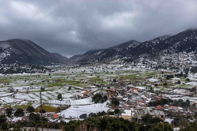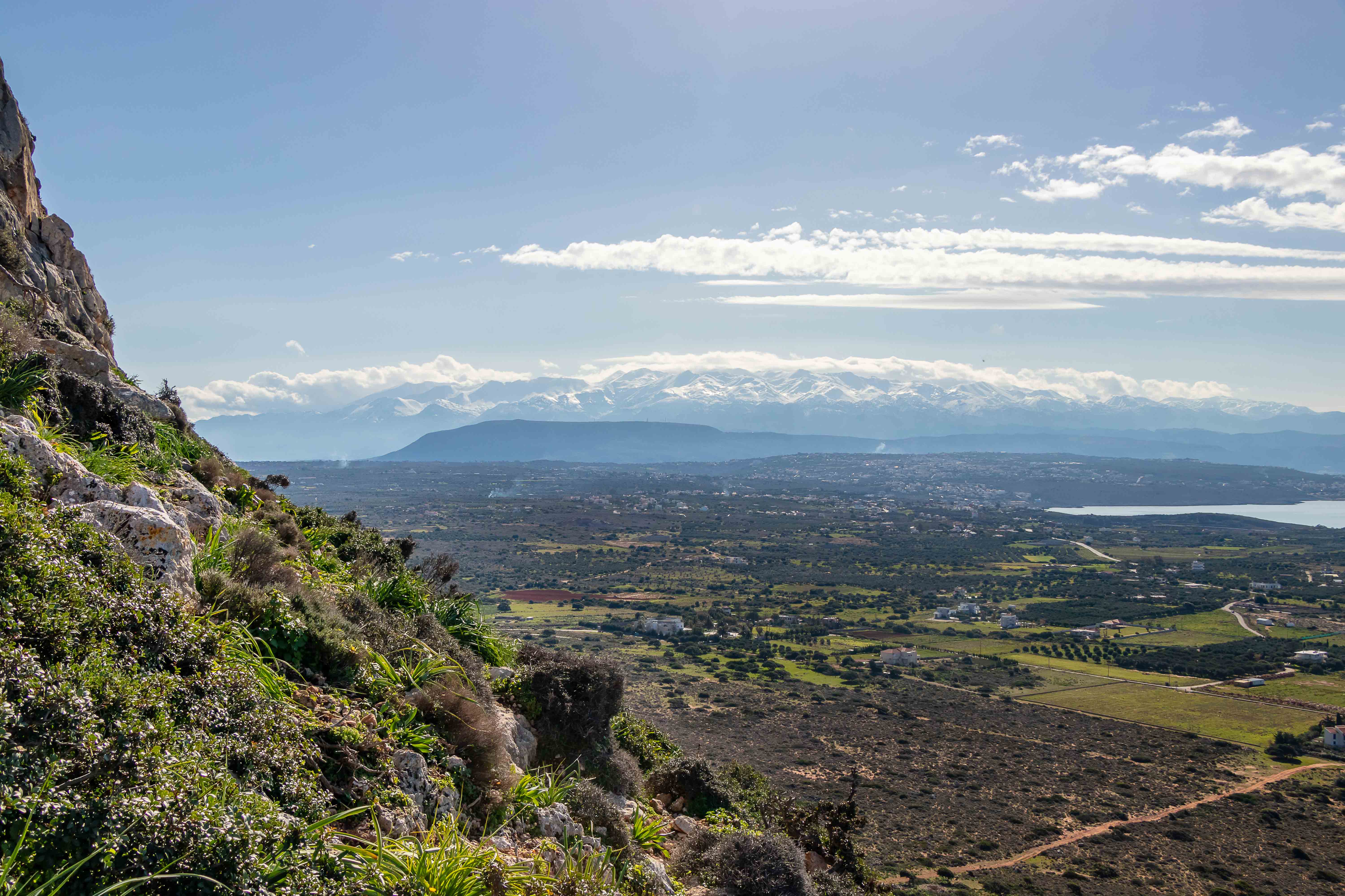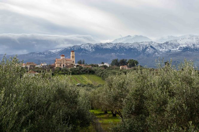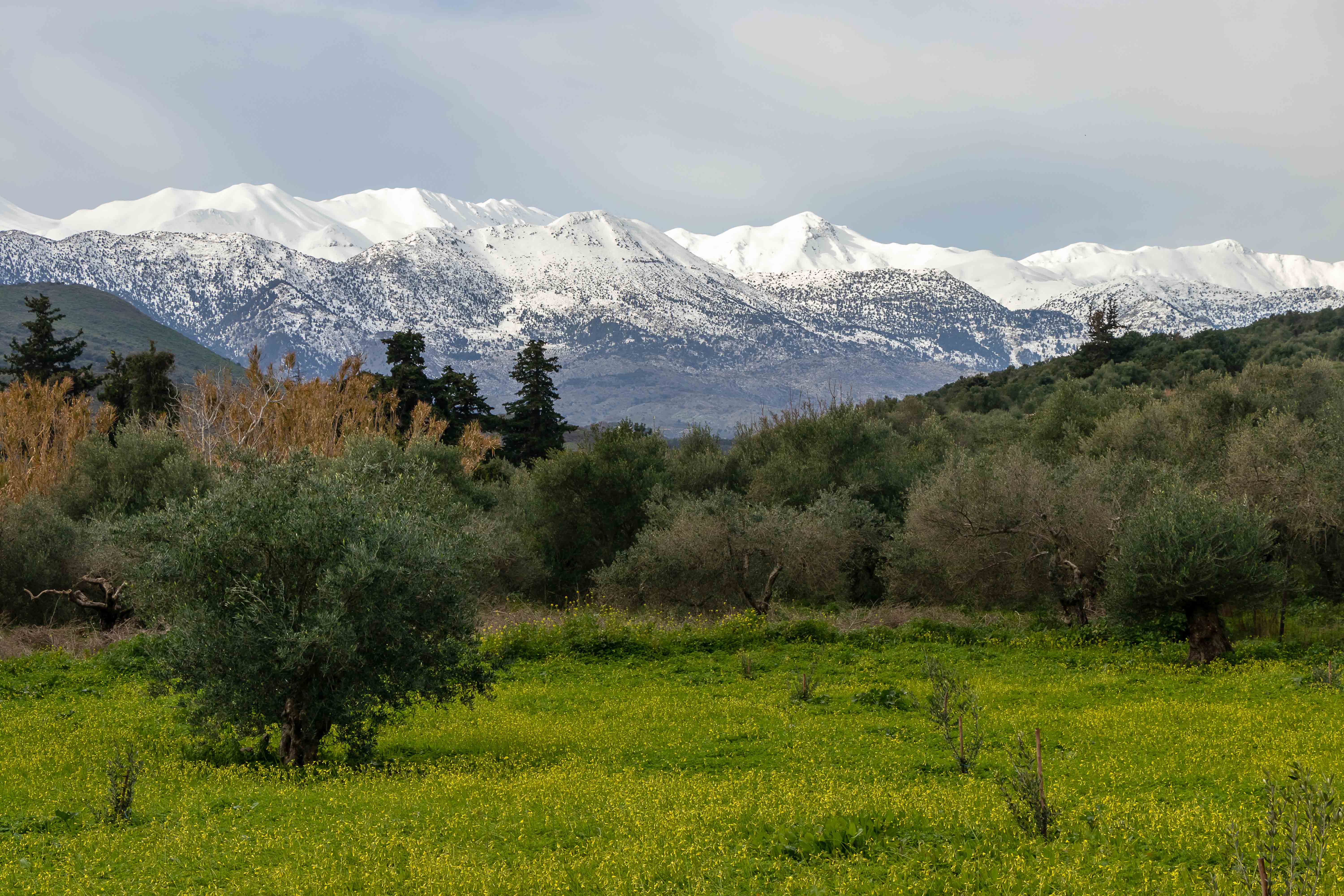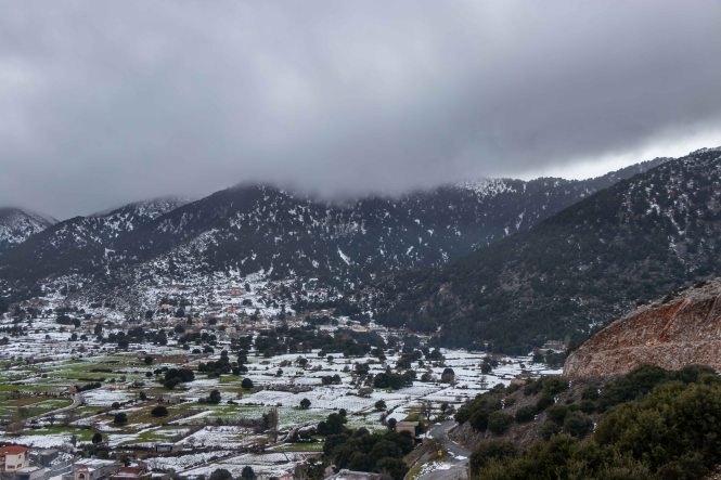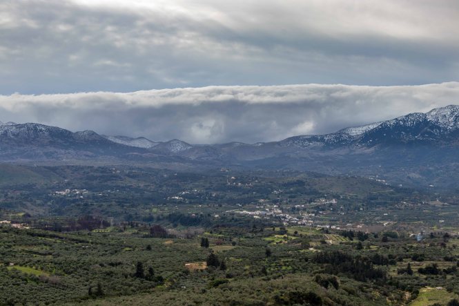 Je höher wir kommen, desto näher rücken die Wolken, die schwer auf den Bergen aufliegen. Wir durchqueren die ASKÍFOU-HOCHEBENE auf 700 m NN, deren Olivenhaine und Weiden mit letzten Schneeresten bedeckt sind. Es sieht aus wie in einem alpinen Hochtal gegen Ende des Winters.