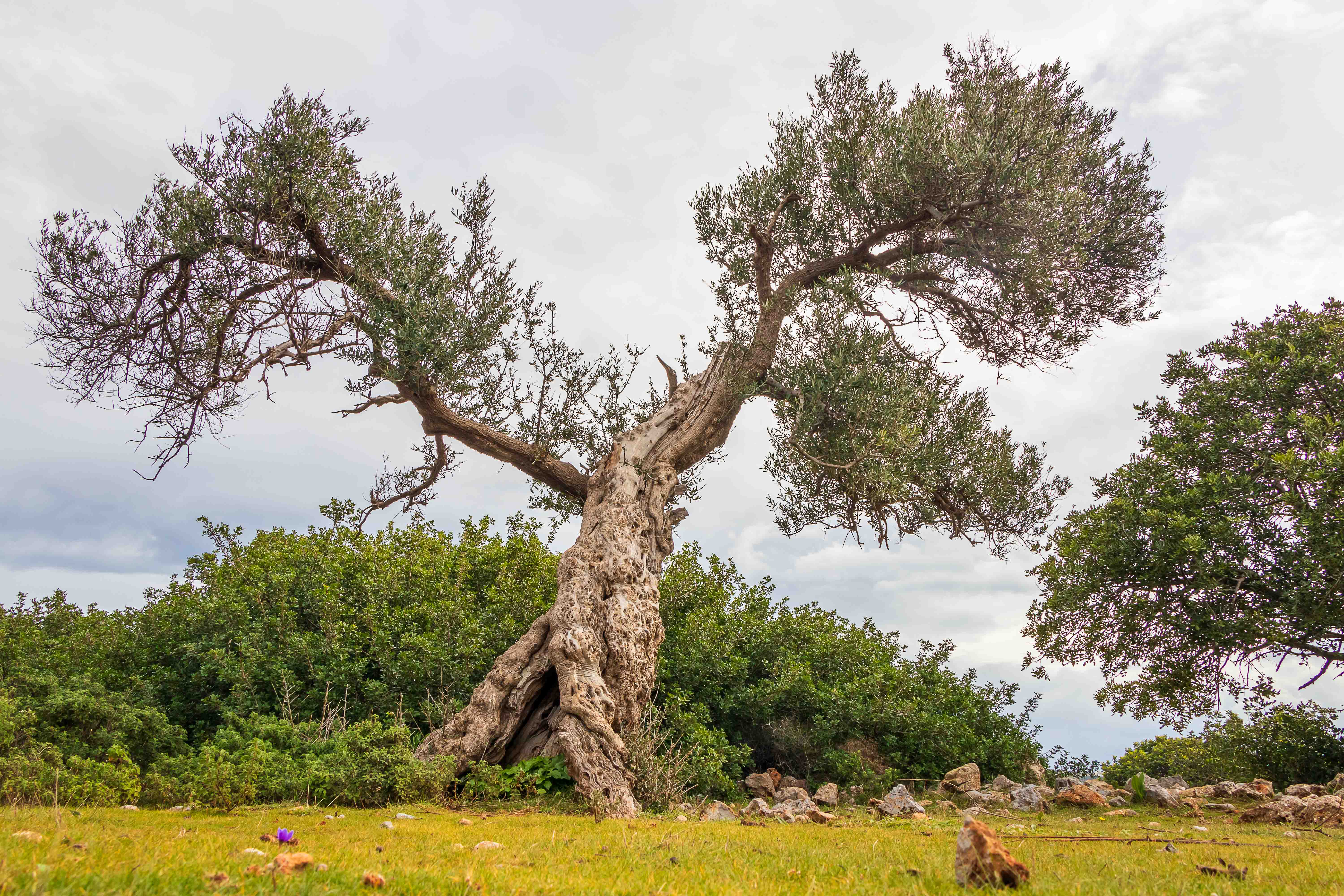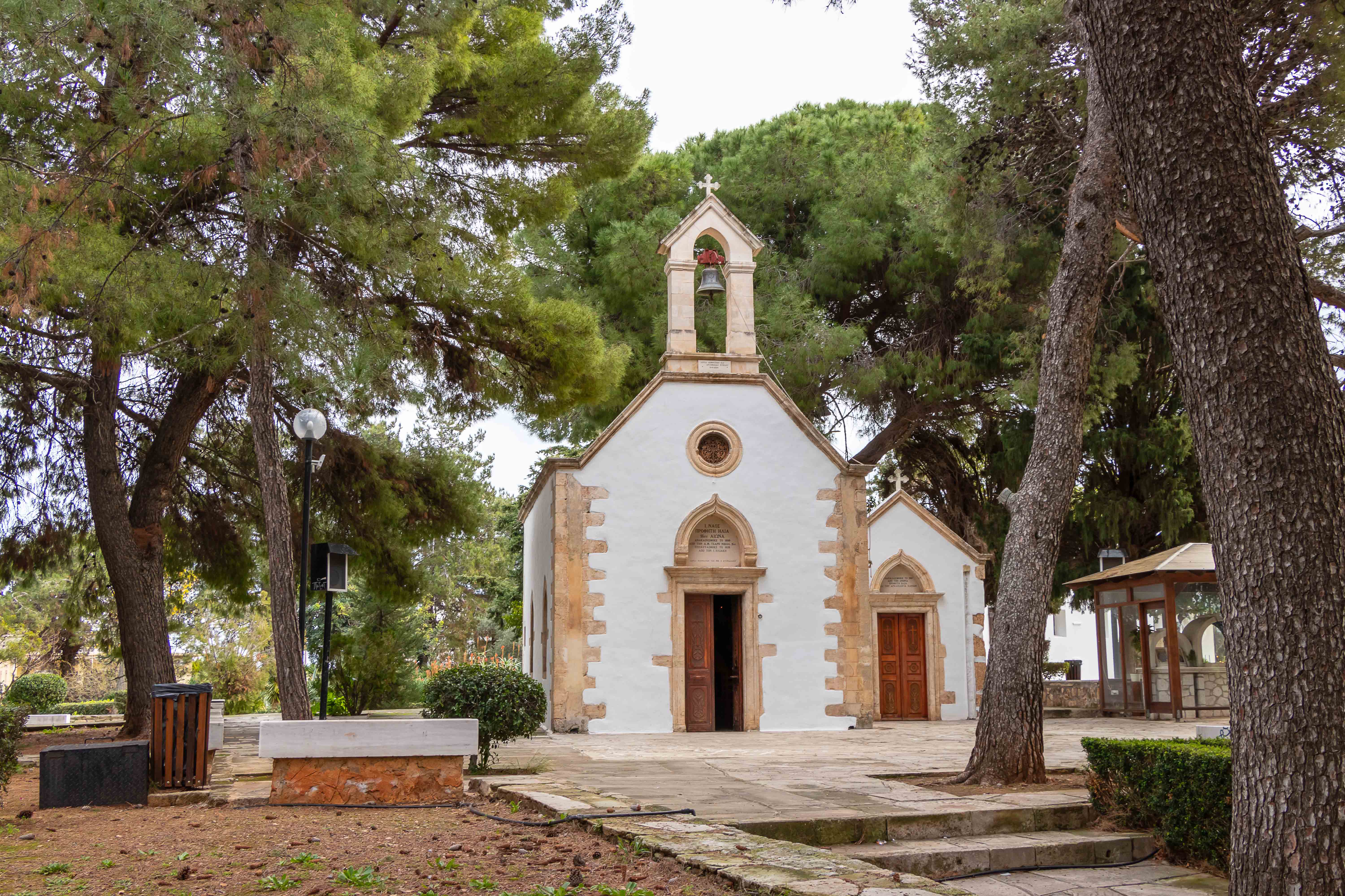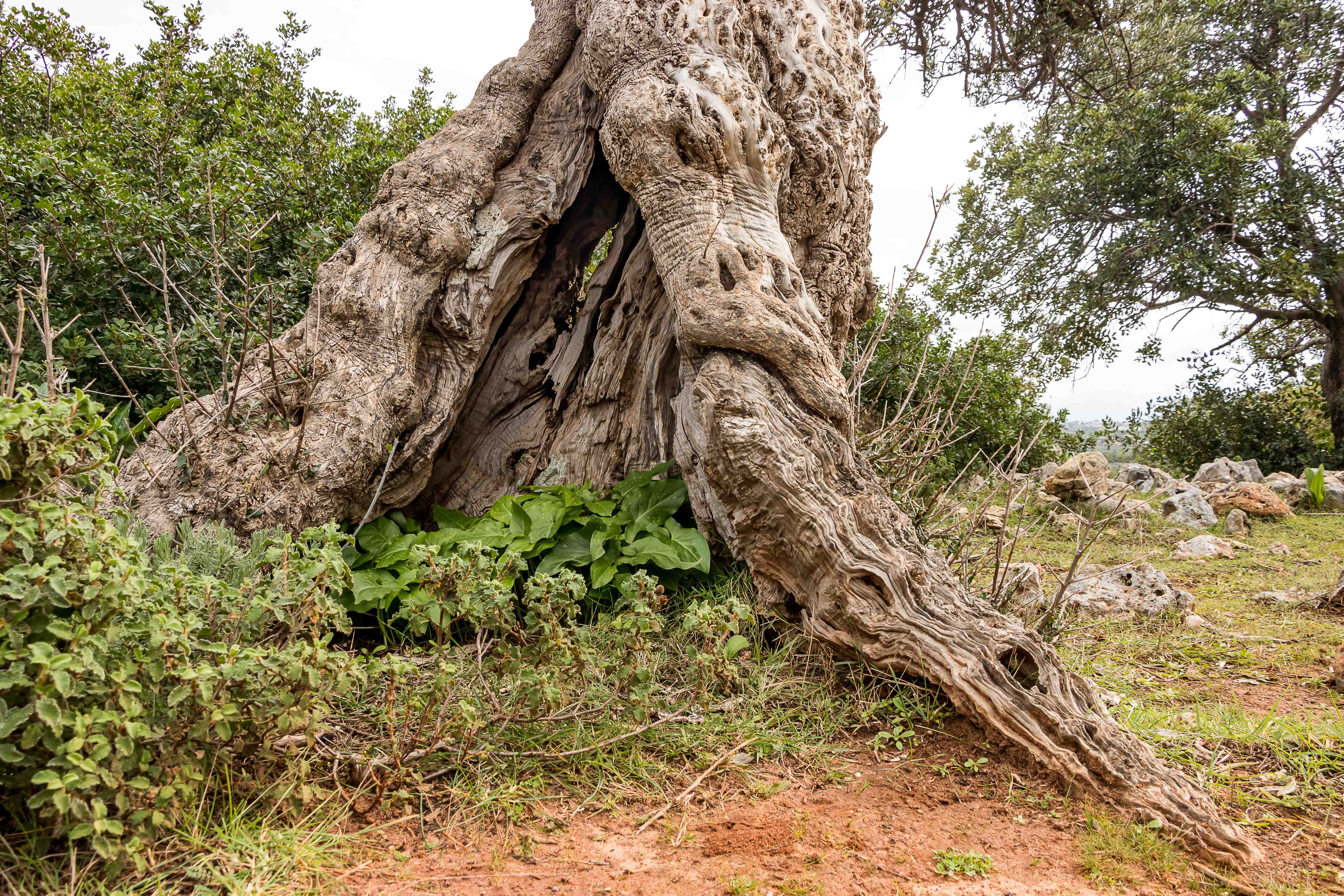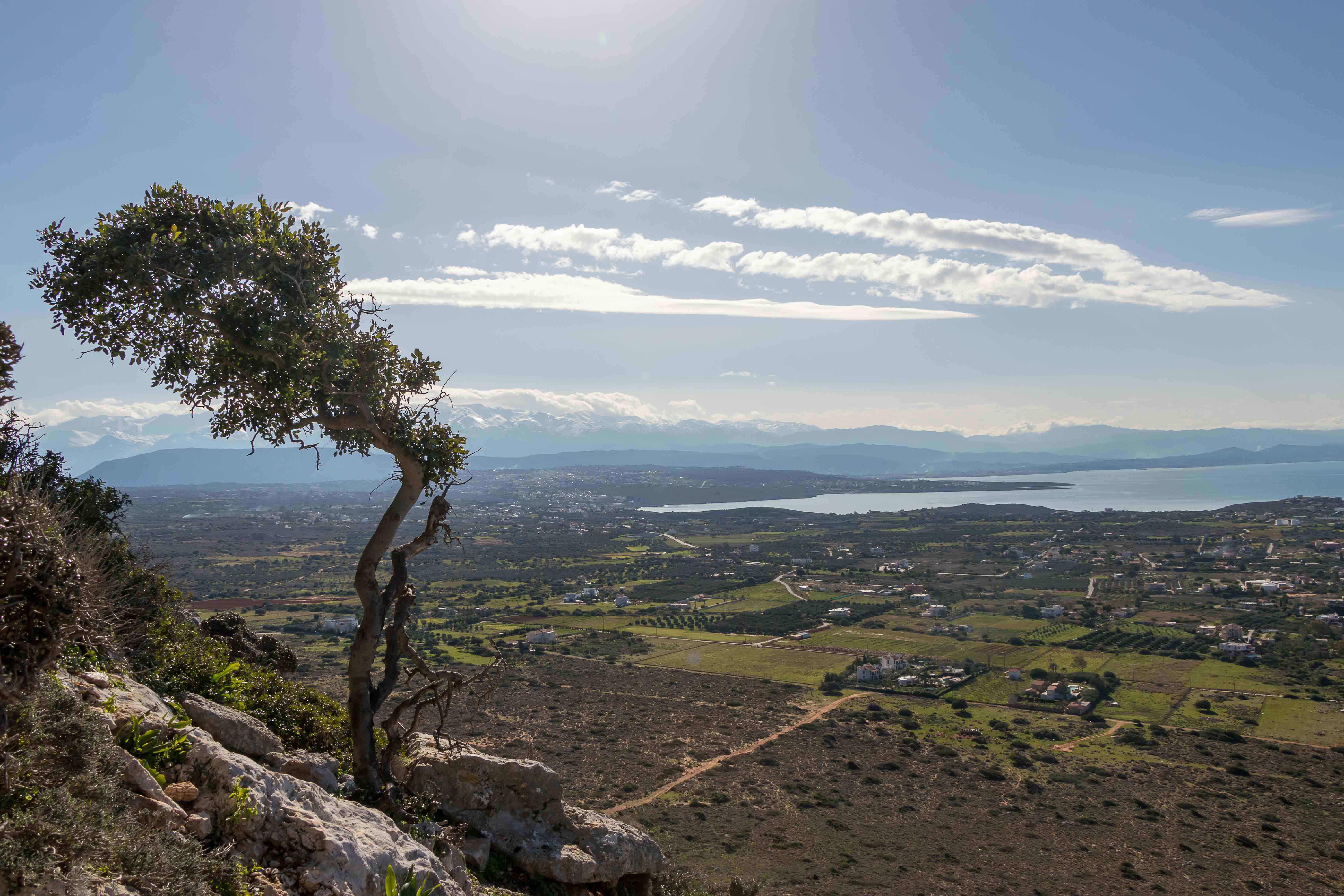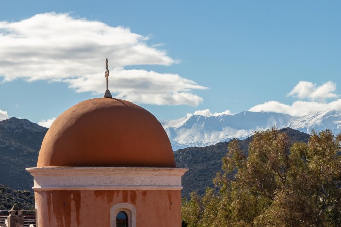 Die weitere Straße führt durch Olivenhaine und eine etwas zersiedelte Landschaft zu zwei bedeutenden Klöstern: KLOSTER AGÍA TRIÁDA und KLOSTER GOUVERNÉTO. Wir schauen bei beiden kurz vorbei, heben uns die Besichtigung aber für morgen auf, in der Hoffnung, dass dann die Sonne den grauen Schleier vom Himmel vertrieben hat. Auf einer kleinen Anhöhe finden wir zwischen alten Olivenbäumen einen aussichtsreichen Platz. Die hohen Gipfel der WEISSEN BERGE verschwinden im Grau der Wolken, aber es ist warm und regnet nicht.