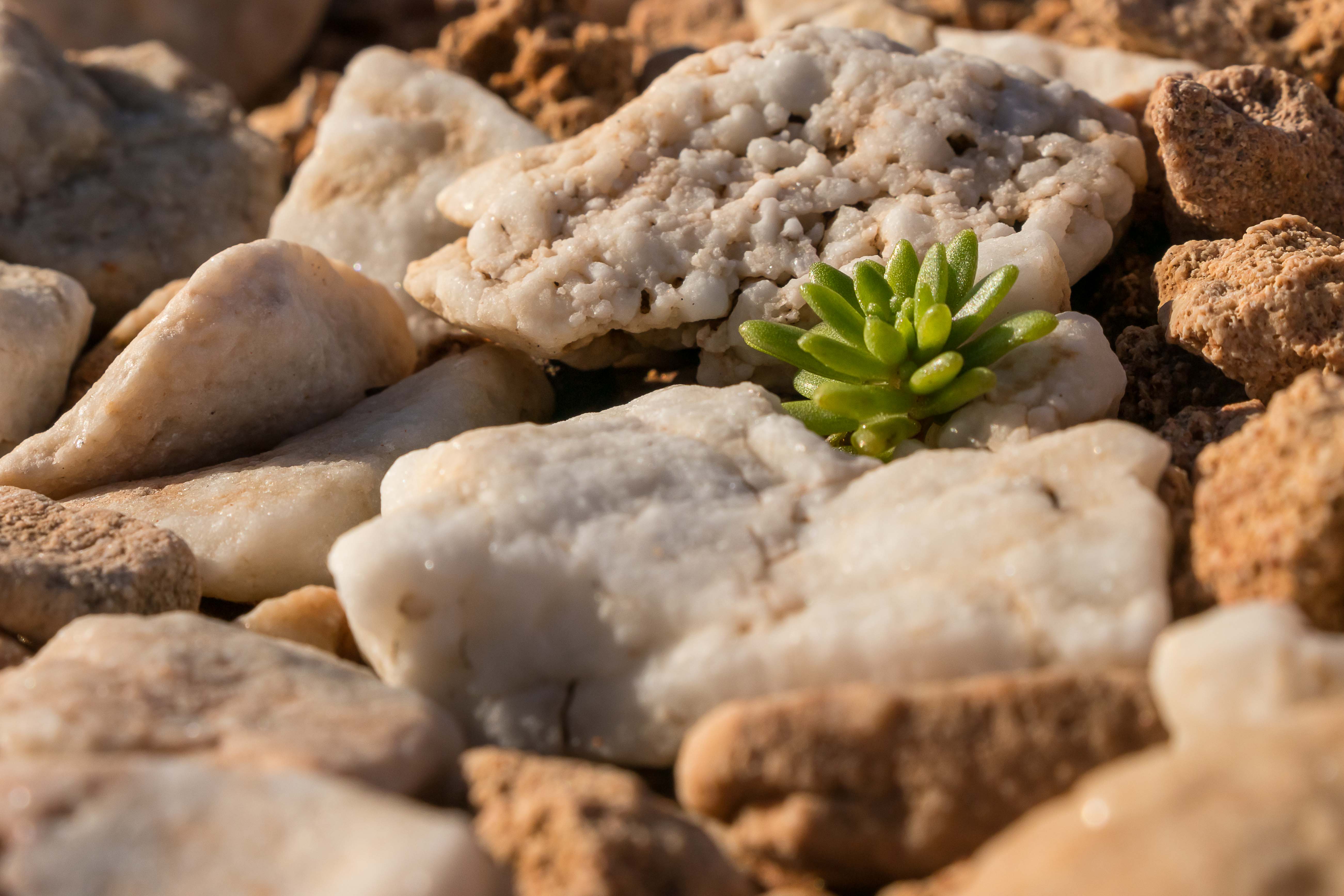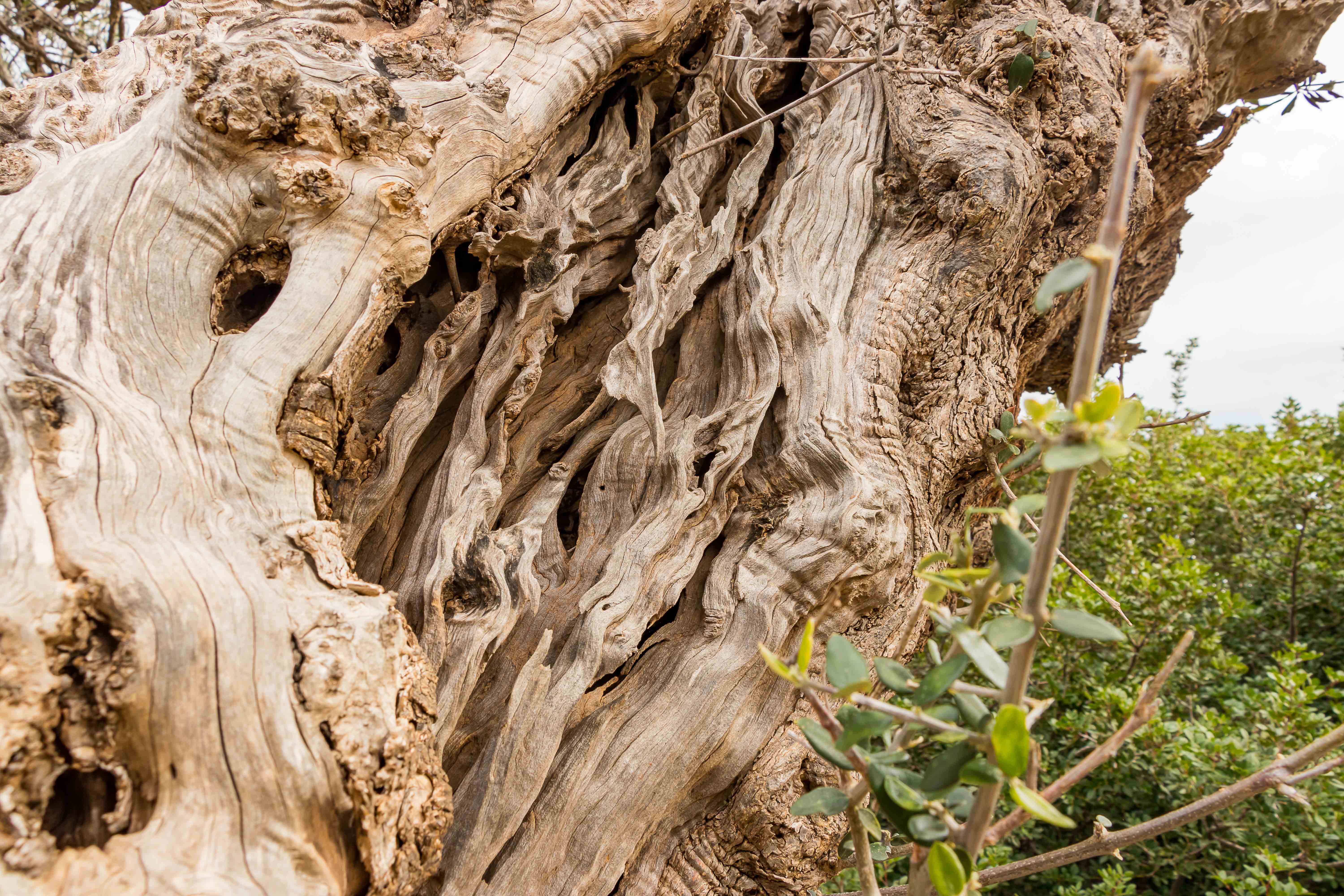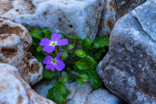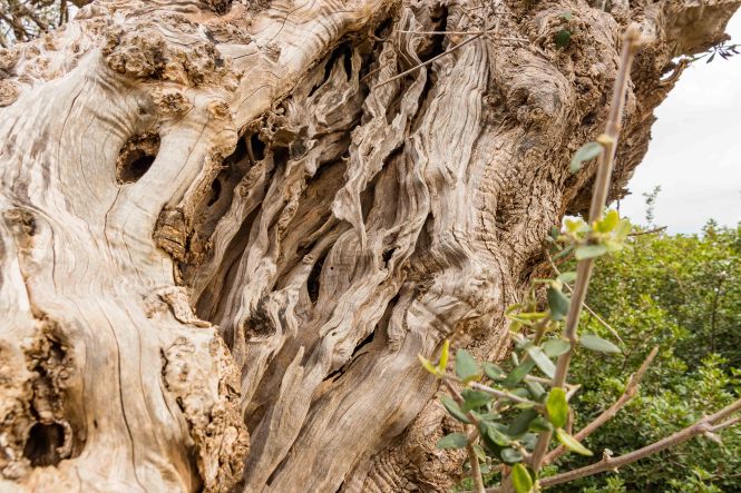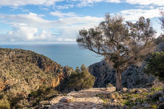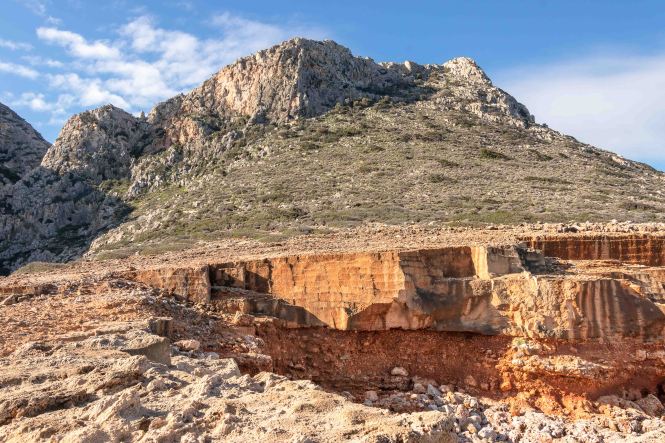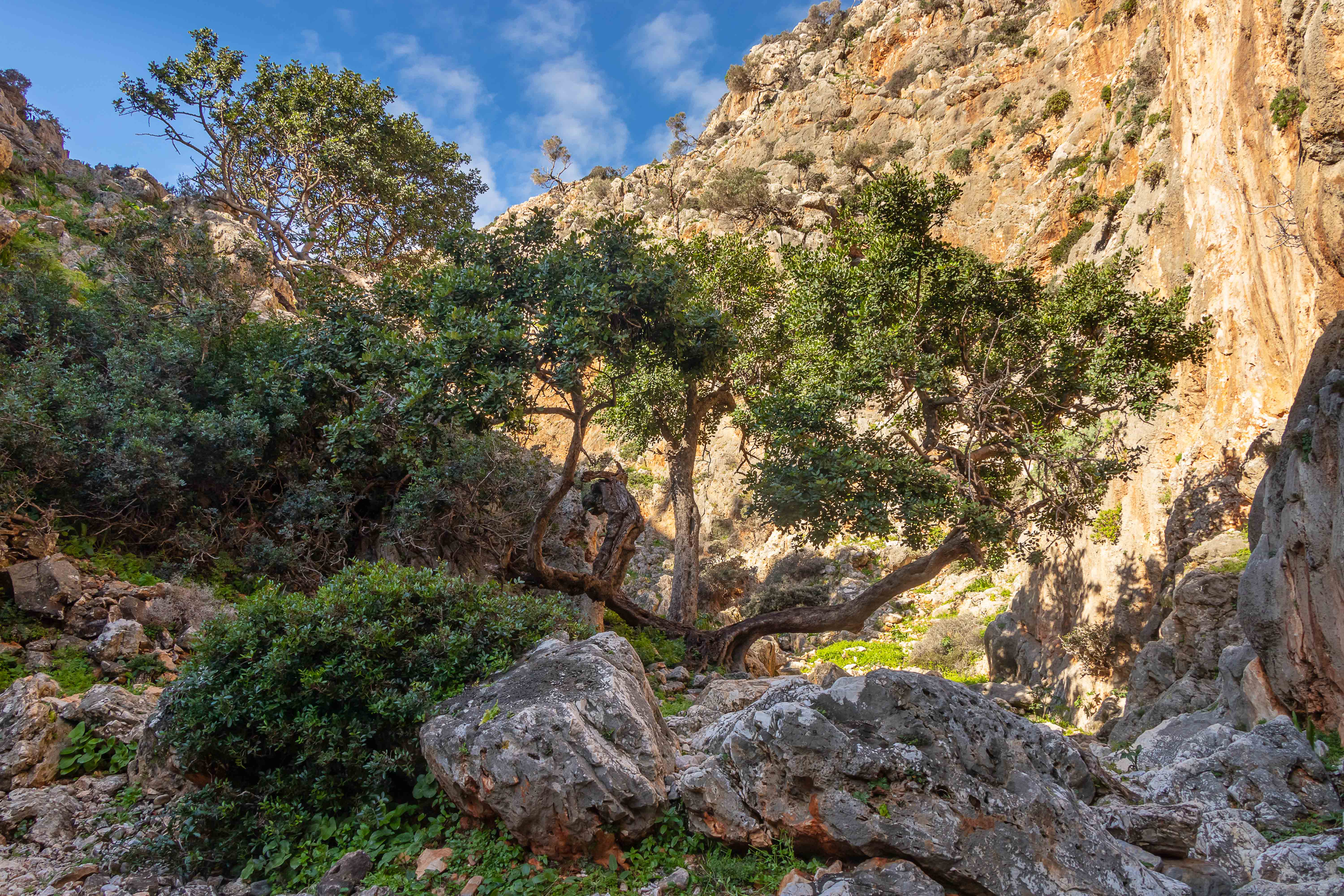 Über viele Steine führt der Pfad, gesäumt von bizarren Johannesbrotbäumen, hinunter an die Küste mit dem ehemaligen Hafen und alten Steinbrüchen. Erste Blüten recken schüchtern ihre Köpfe zwischen den Steinen in die Sonne.