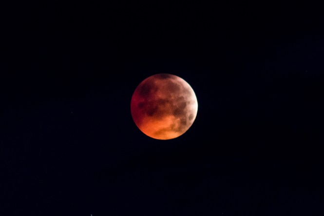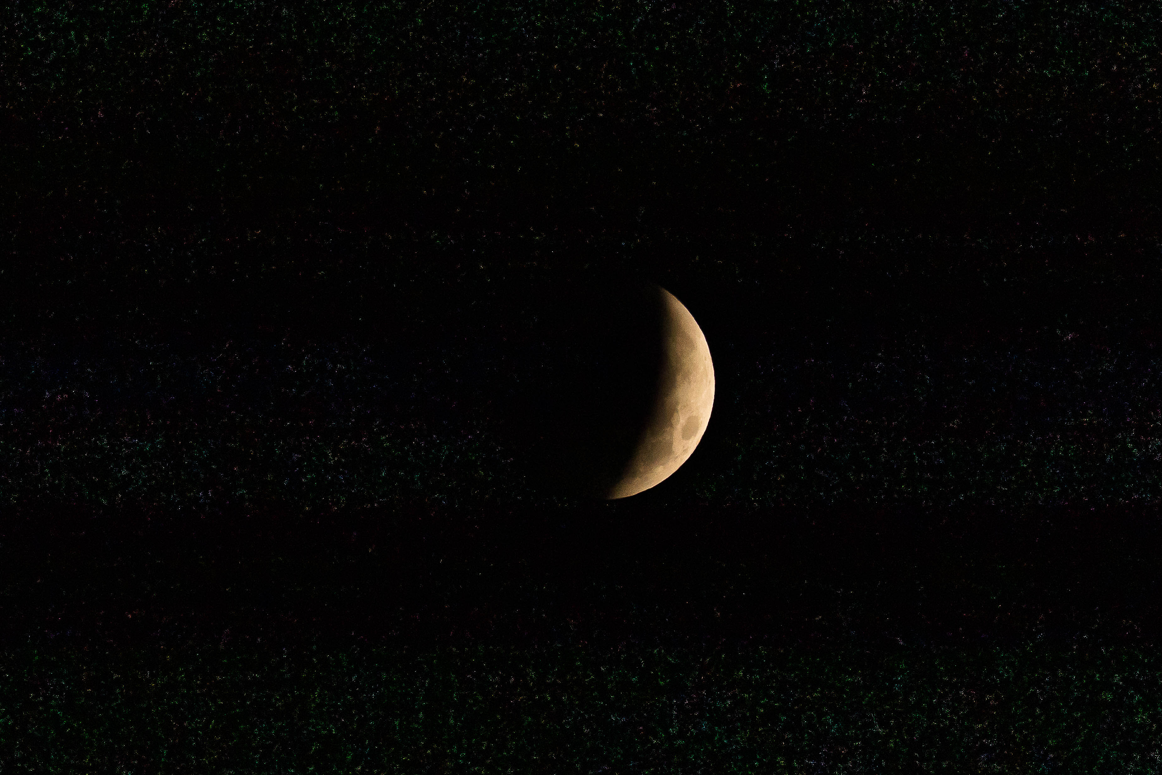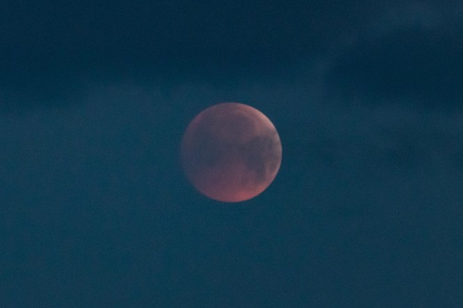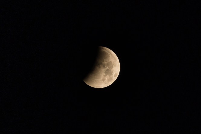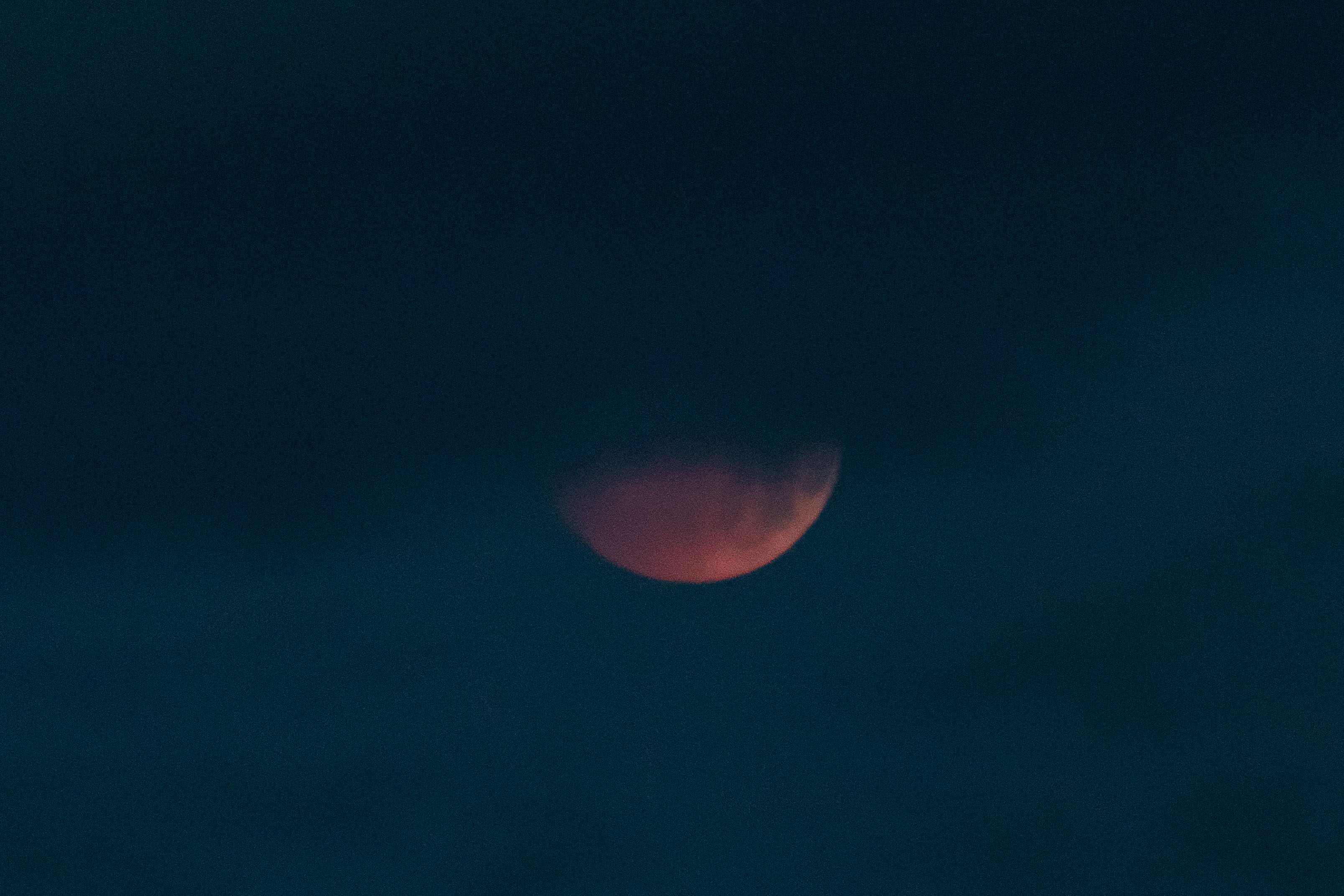 In der Nacht plätschert der Regen auf das Blech des Dicken, doch zur Mondfinsternis ist es sternenklar. Wir ziehen uns warm an und bestaunen das Schauspiel. Langsam schiebt sich der Schatten von links nach rechst über den Erdtrabanten, die linke Seite errötet langsam, während die rechte Seite noch von der Sonne angestrahlt wird. Leider lässt sich das mit dem Foto (zumindest von mir) nicht richtig einfangen. Doch als Sonne, Erde und Mond in einer Linie stehen, leuchtet der Blutmond rot auf. Der Himmel wird heller, die Sonne wirft ihr erstes Licht in den Tag und der Mond versteckt sich hinter einigen Schleierwolken.