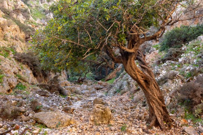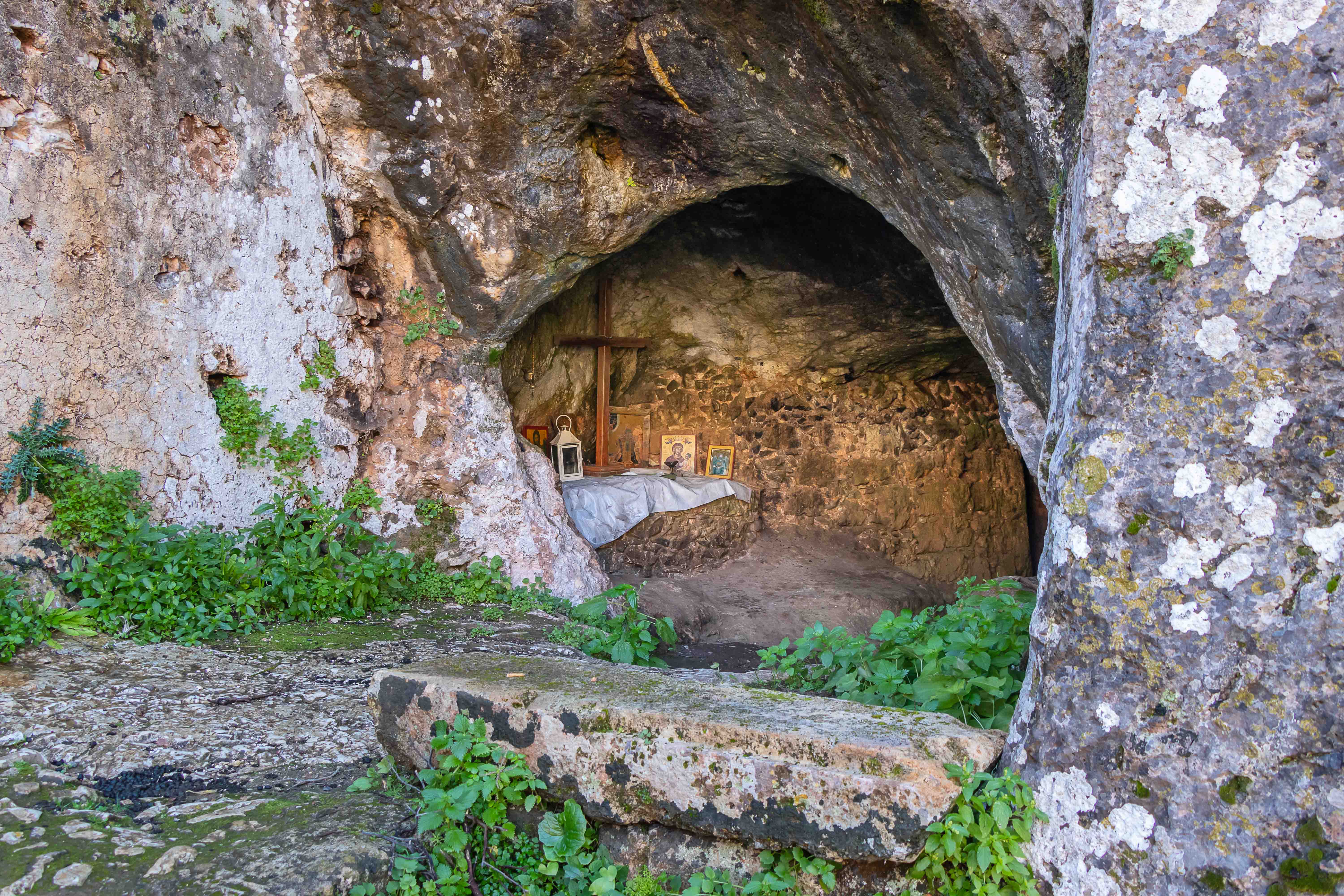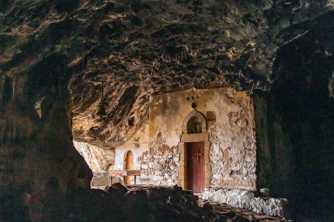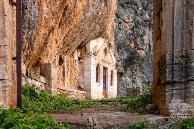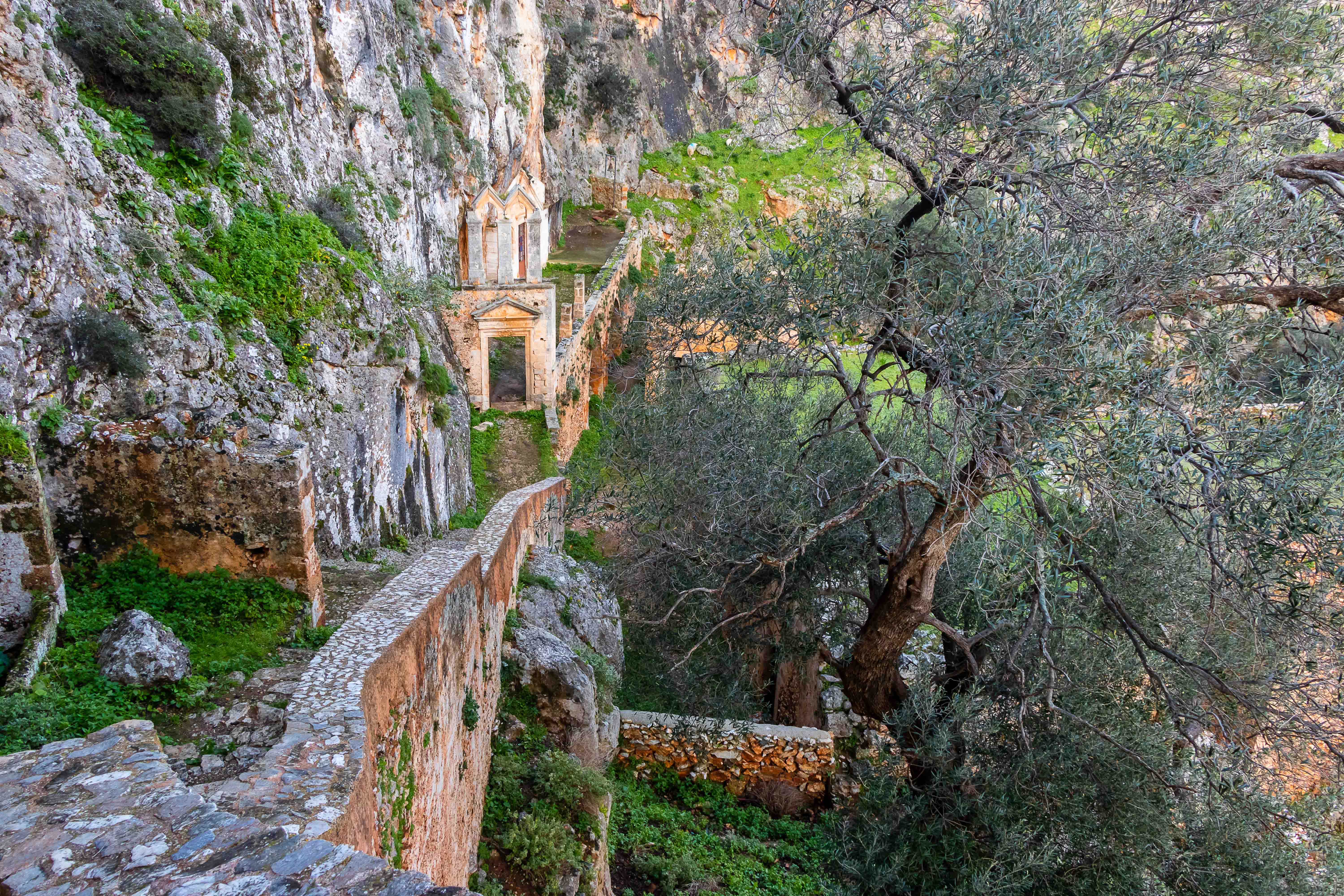 Nach ein paar Minuten kommen die Ruinen des KLOSTERS KATHOLIKÓ in Sicht. Noch kurz davor liegt die Höhle des Eremiten Johannes, der hier starb, nachdem ein Bauer in für ein Tier gehalten und angeschossen hat. Die Ruinen des häufig von Osmanen überfallen Klosters, deswegen wurde es auch verlassen, schmiegen sich an einen überhängende Felsen. Eine breite Brücke überspannt die hier beginnende GOVERNÉTO-SCHLUCHT.