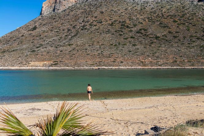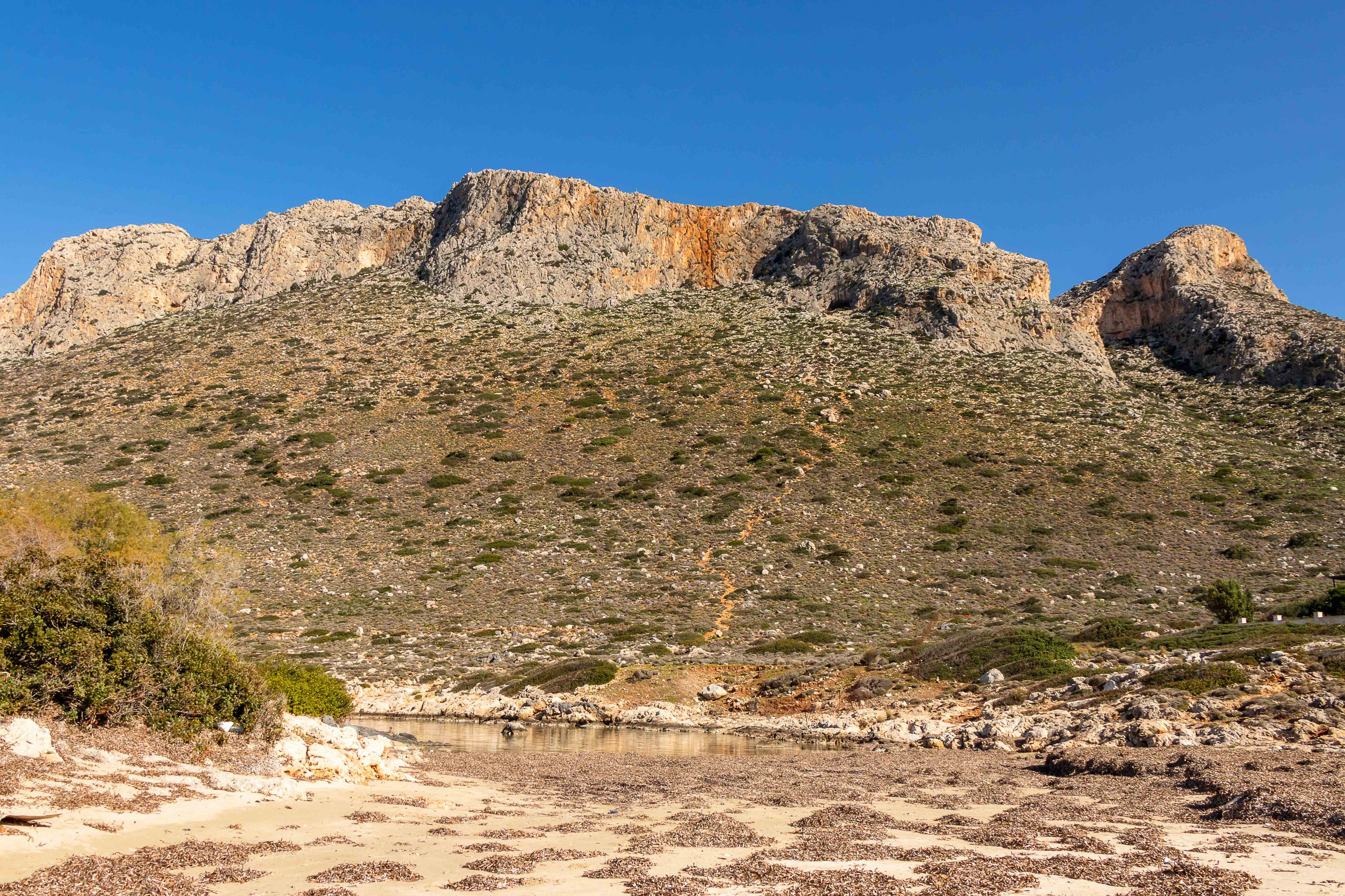 Nun ist es aber wieder einmal genug mit Kultur und Steine. In STAVRÓS können wir direkt an der kreisrunden Lagune einparken. Hier ist es ruhig, nur ein paar Einheimische kommen zum Flanieren, Baden oder Angeln vorbei. Der Südwind ist uns heute gnädig, er weht am Boden nur schwach, während er in der Höhe Lentis produziert, bringt uns frühlingshafte 18 Grad C (im Dicken sogar 25 Grad C) und blauen, fast wolkenlosen Himmel. Die Wäsche ist wieder einmal fällig und einige Reparaturen am Dicken sind zu erledigen. Beide springen wir ins frische, glasklare Wasser und lassen von einer zeitweise warmen Stranddusche verwöhnen. Peter steigt zu einer kleinen Höhle auf, die am Hang des VARDÍES liegt. Hier wurde die berühmte Schlussszene des Films Aléxis Zorbás gedreht, bei der die Transportseilbahn, die Bäume vom Berg herunter bringe sollte, wie ein Kartenhaus zusammenfiel. Der Kommentar von Zorbás dazu: „He Boss, hast Du jemals erlebt, dass etwas so bildschön zusammenkracht.“