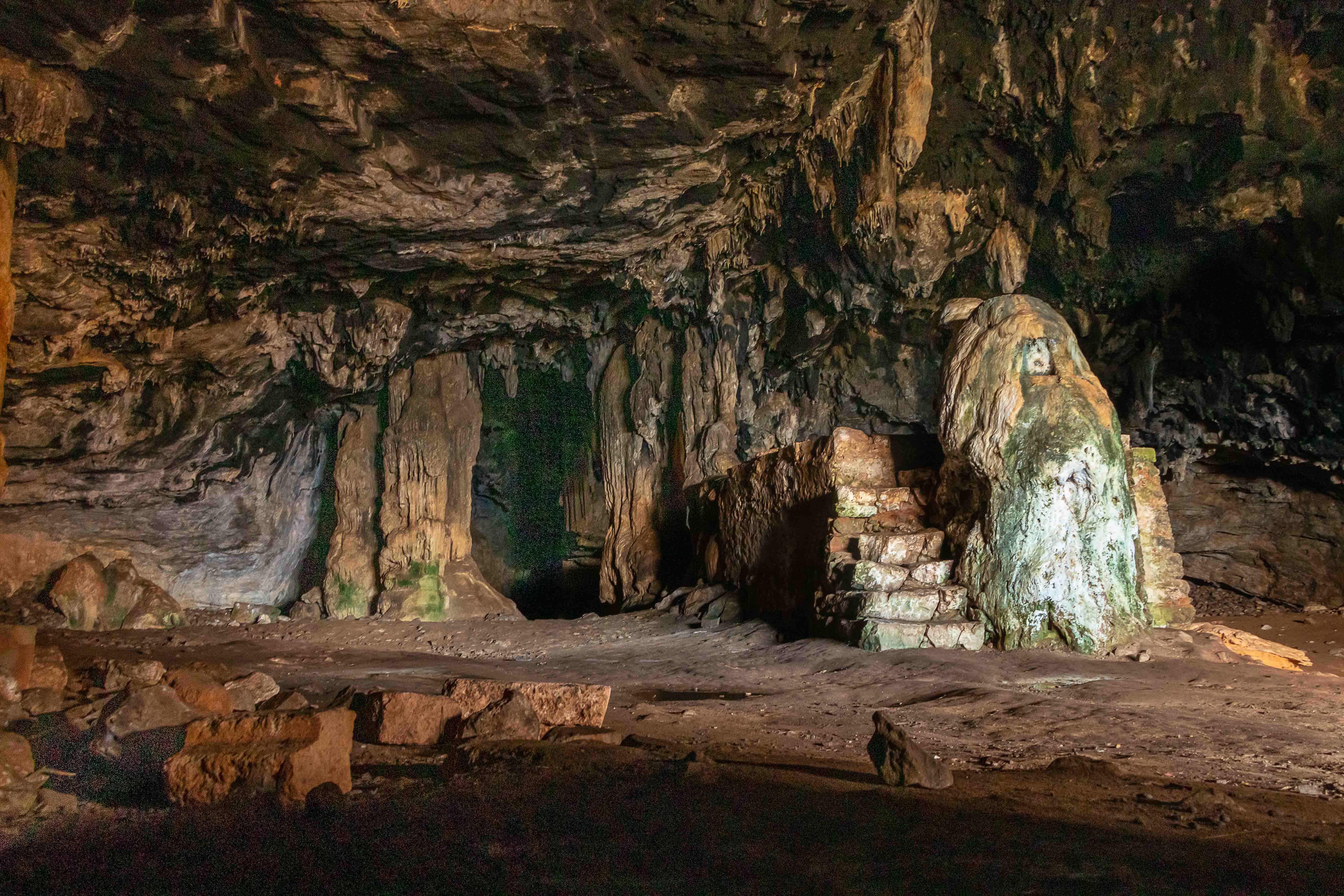 Über einen gepflasterten Weg geht es gemütlich weiter. Schon ist die ARKOUDIÓTISSA-HÖHLE, was BÄRENHÖHLE heißt, erreicht. In der Antike der Göttin Artemis geweiht, diente sie zur christlichen Zeit der Verehrung Marias. Sie soll einen aufdringlichen Bären, der den Einwohnern den Zugang zu einer Quelle verwehrte, zu Stein verwandelt haben. Nun ist er weiß angestrichen und lässt sich mit viel Fantasie als solchen erkennen.