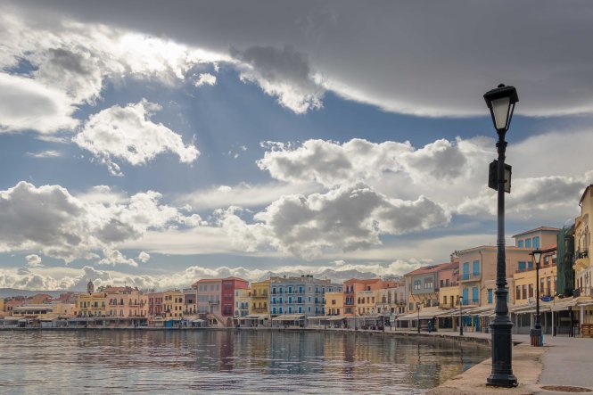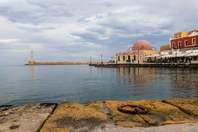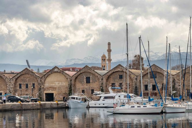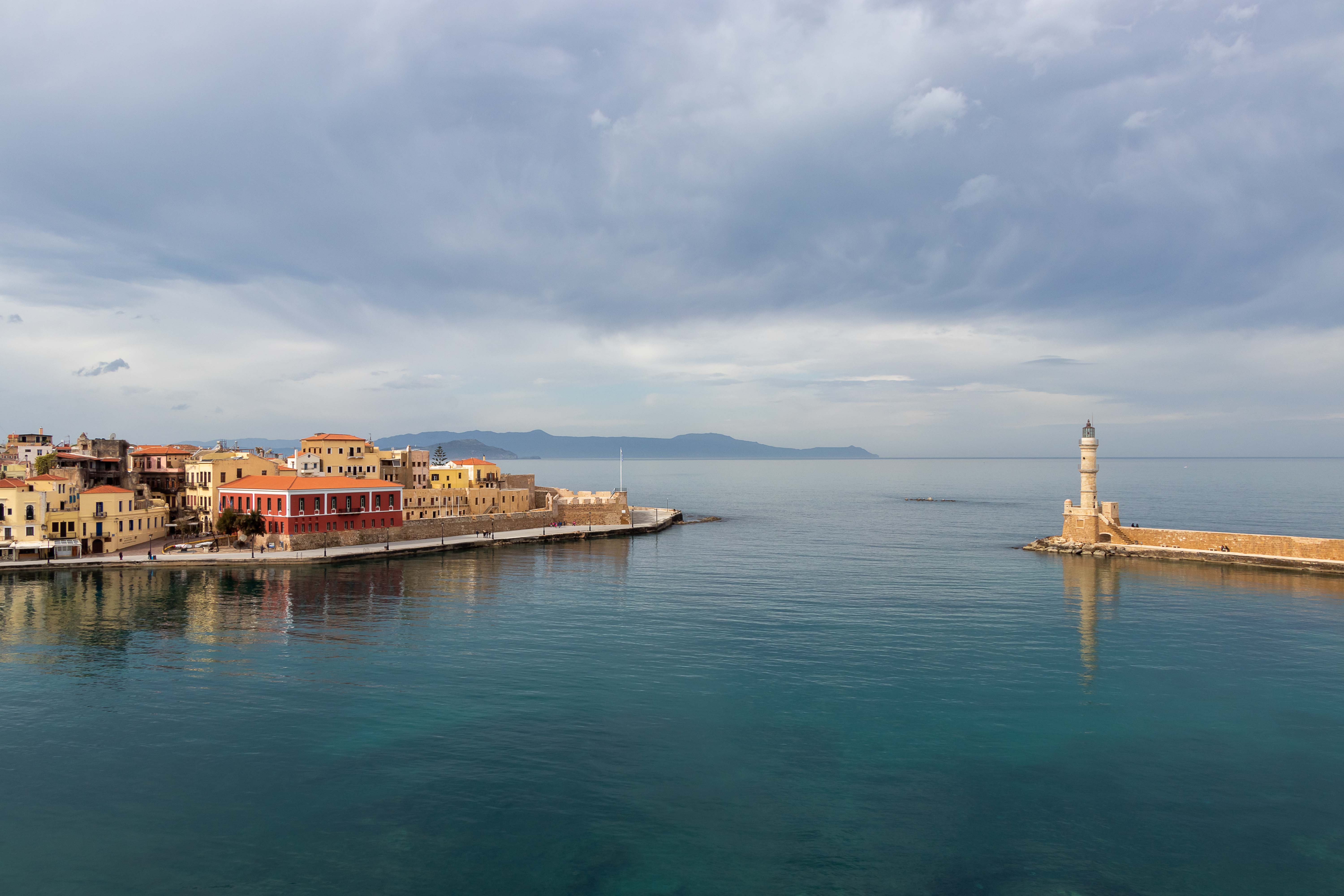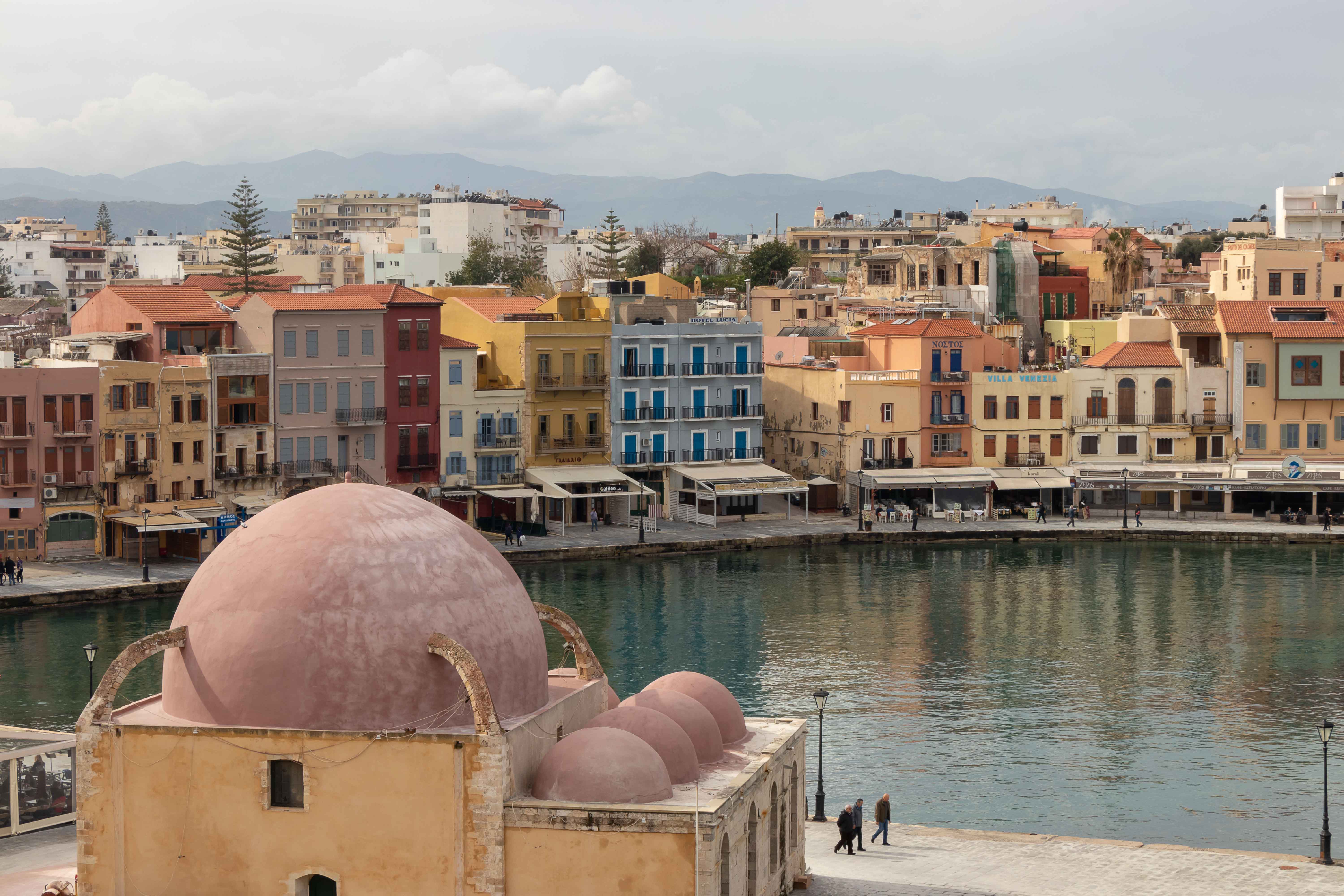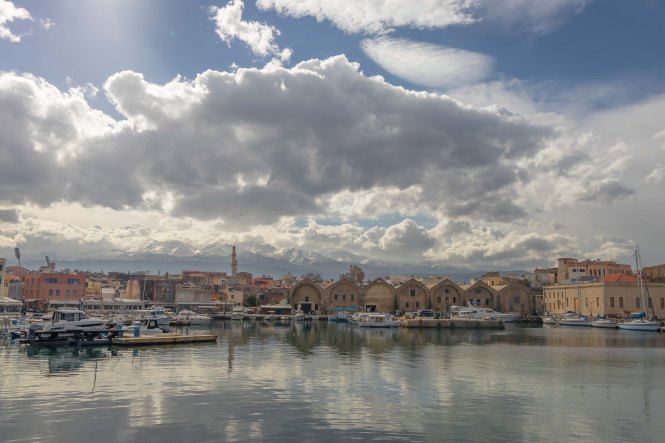 CHANIÁ wurde stark von den Venezianern geprägte und liegt malerisch an dem weiten Hafenbecken, darüber ragen die mächtigen WEISSEN BERGE in die hoch aufschießenden Wolken. Rechtzeitig zum Stadtbummel lässt die Sonne die pastellfarbenen Häuser an der Promenade aufleuchten. Eine Kindergartengruppe marschiert freudig singend durch die Gassen, Jugendliche sitzen schatzend in den Kaffees, Männer spazieren am langen Kai entlang und schielen nach den jungen Mädchen.