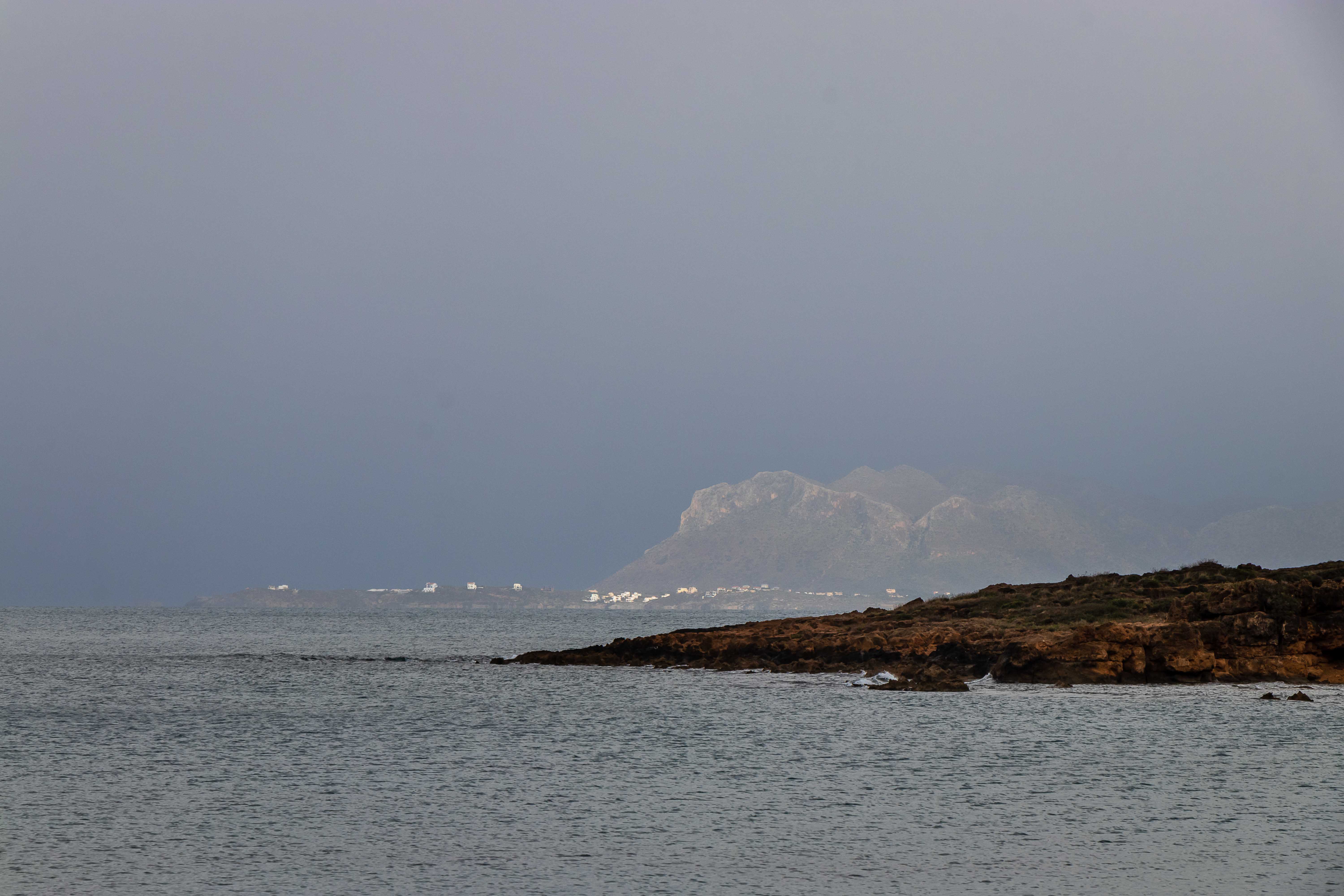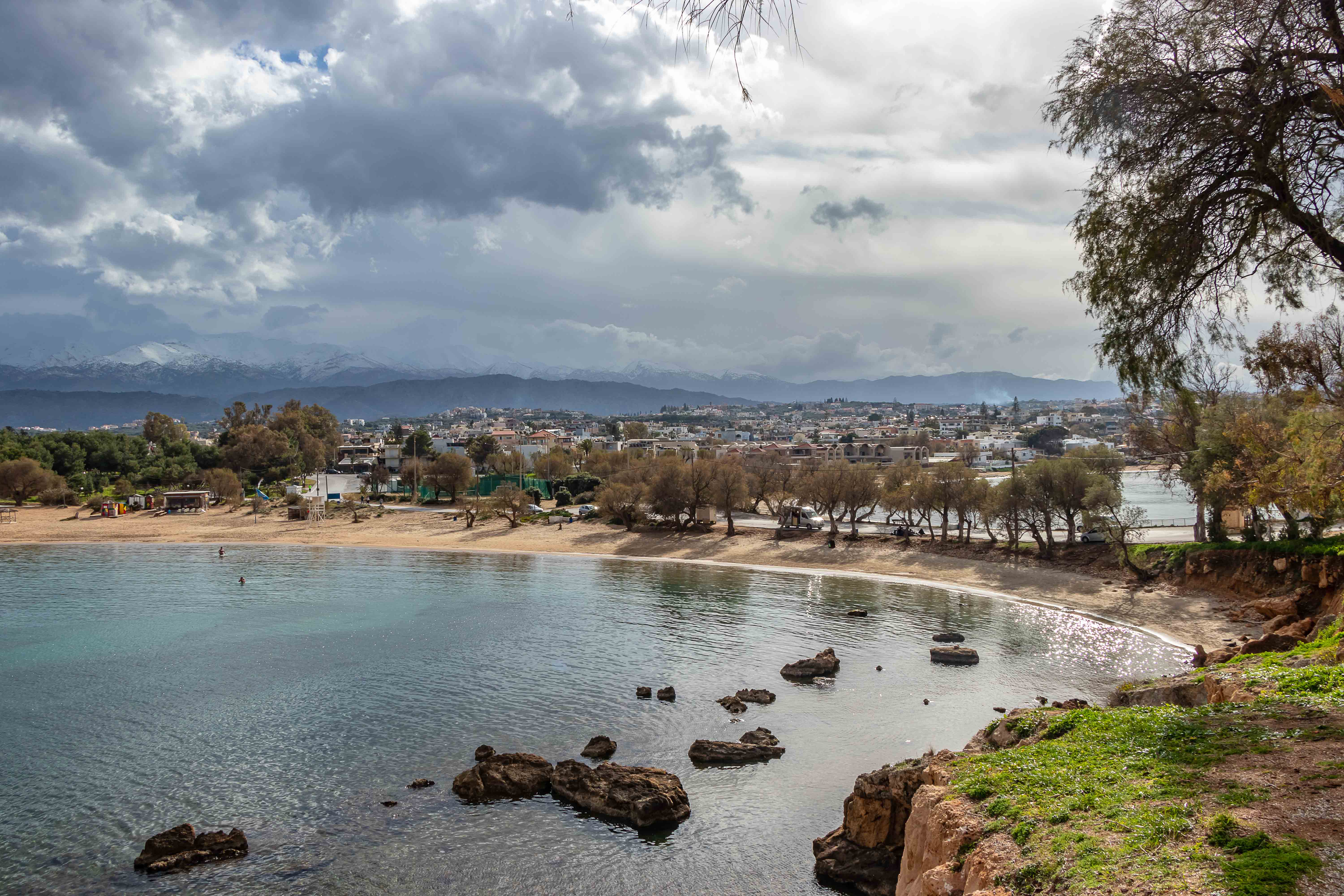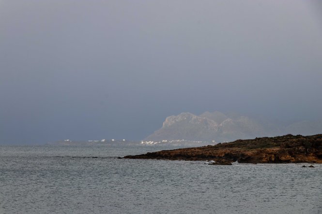 Dann begeben wir uns auf die Suche nach ein schönen Stellplatz, an dem wir ein paar geruhsame Tage bleiben können. Nur ein paar Kilometer weiter im Westen bietet sich die PARALÍA ÁGII APÓSTOLI dafür an. Es ist ein munteres Kommen und Gehen. Viele Kreter nutzen das warme und fast windstille Wetter, gehen am Strand spazieren oder schwimmen bereits vor Sonnenaufgang bis in die Nacht hinein ewig lang im flachen Wasser der beiden Buchten; eine Frau mit schickem Badehut bleibt über eine Stunde im kühlen Nass. Da kann Peter natürlich nicht zurückstehen, doch als Warmduscher ist er bereits nach zwei Minuten wieder an Land. Während der nächsten Tage zieht das abwechslungsreiche Wetter alle Register: der Südwind bringt Saharastaub und Regen, ab und zu reißt der Höhenwind Löcher in die Wolkendecke und schafft damit der Sonne Platz, in der Nacht zucken Blitz über den Himmel. Bis auf einige Böen, verursacht durch den ausfallenden Regen, ist es hier in der kleinen Bucht überraschenderweise fast windstill, die WEISSEN BERGE schützen uns vor dem Südwind. Die Wellen plätschern an den Strand wie am heimischen Brombachsee.