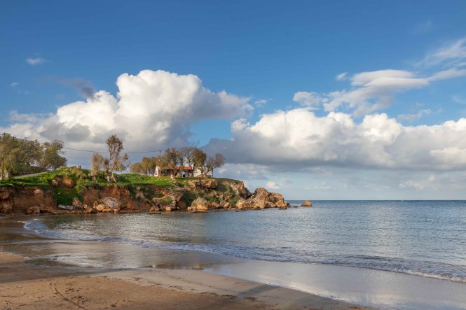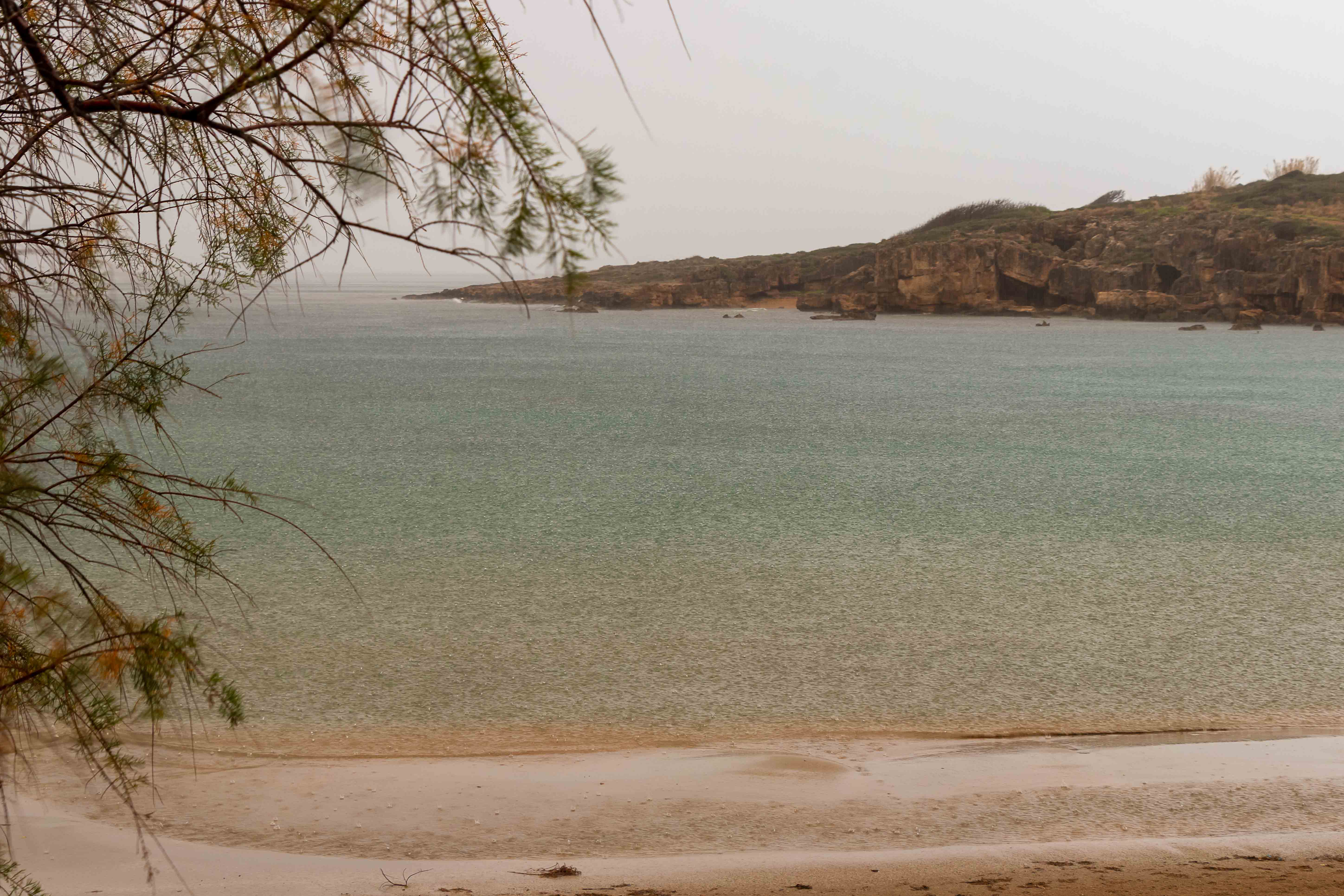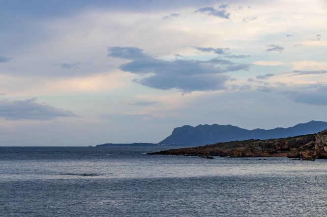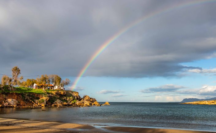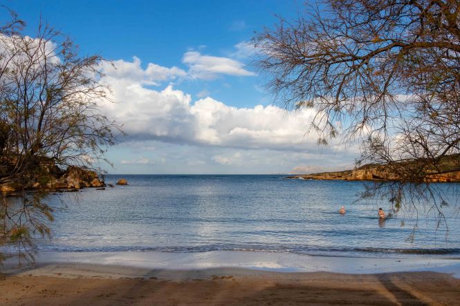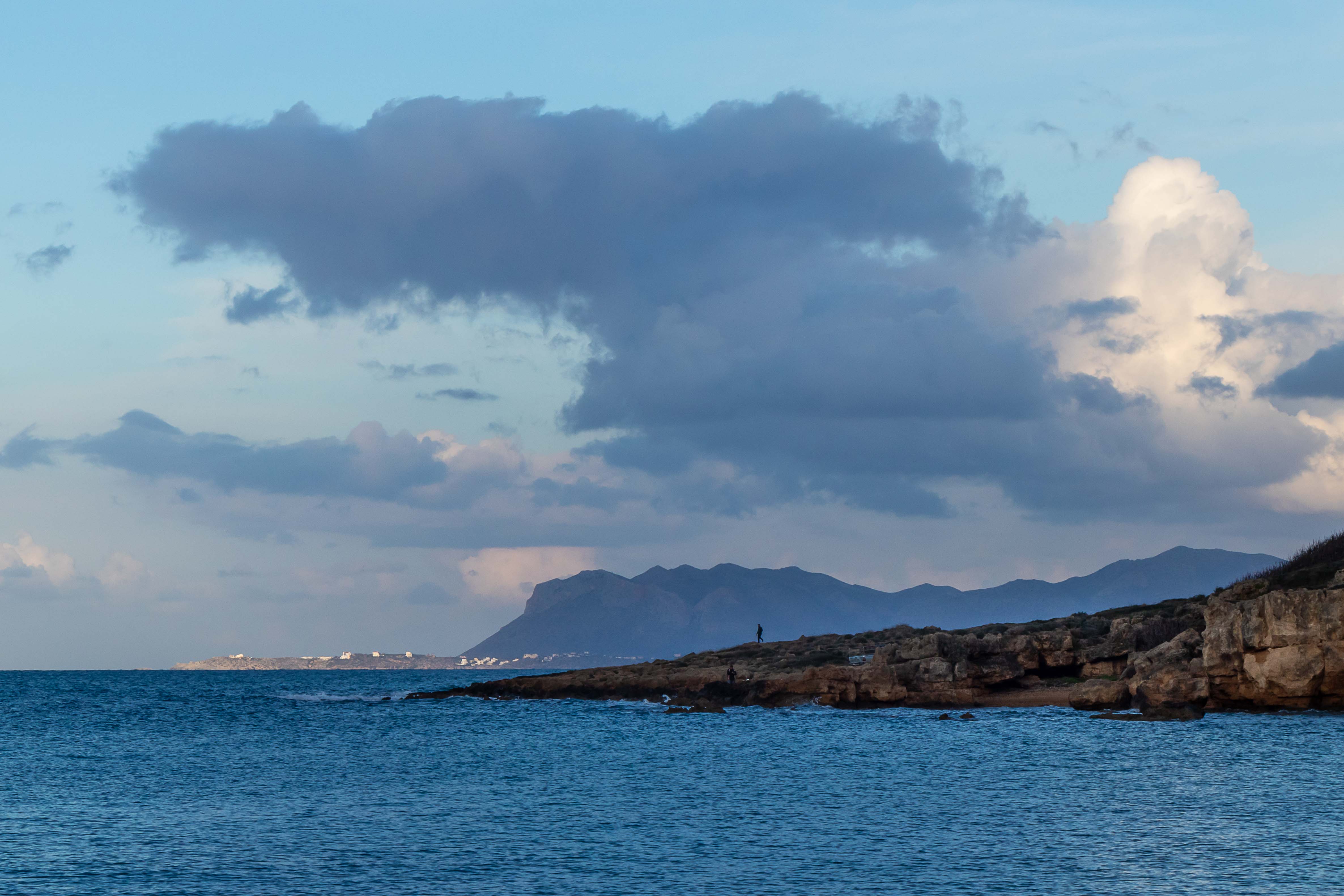 Dann begeben wir uns auf die Suche nach ein schönen Stellplatz, an dem wir ein paar geruhsame Tage bleiben können. Nur ein paar Kilometer weiter im Westen bietet sich die PARALÍA ÁGII APÓSTOLI dafür an. Es ist ein munteres Kommen und Gehen. Viele Kreter nutzen das warme und fast windstille Wetter, gehen am Strand spazieren oder schwimmen bereits vor Sonnenaufgang bis in die Nacht hinein ewig lang im flachen Wasser der beiden Buchten; eine Frau mit schickem Badehut bleibt über eine Stunde im kühlen Nass. Da kann Peter natürlich nicht zurückstehen, doch als Warmduscher ist er bereits nach zwei Minuten wieder an Land. Während der nächsten Tage zieht das abwechslungsreiche Wetter alle Register: der Südwind bringt Saharastaub und Regen, ab und zu reißt der Höhenwind Löcher in die Wolkendecke und schafft damit der Sonne Platz, in der Nacht zucken Blitz über den Himmel. Bis auf einige Böen, verursacht durch den ausfallenden Regen, ist es hier in der kleinen Bucht überraschenderweise fast windstill, die WEISSEN BERGE schützen uns vor dem Südwind. Die Wellen plätschern an den Strand wie am heimischen Brombachsee.