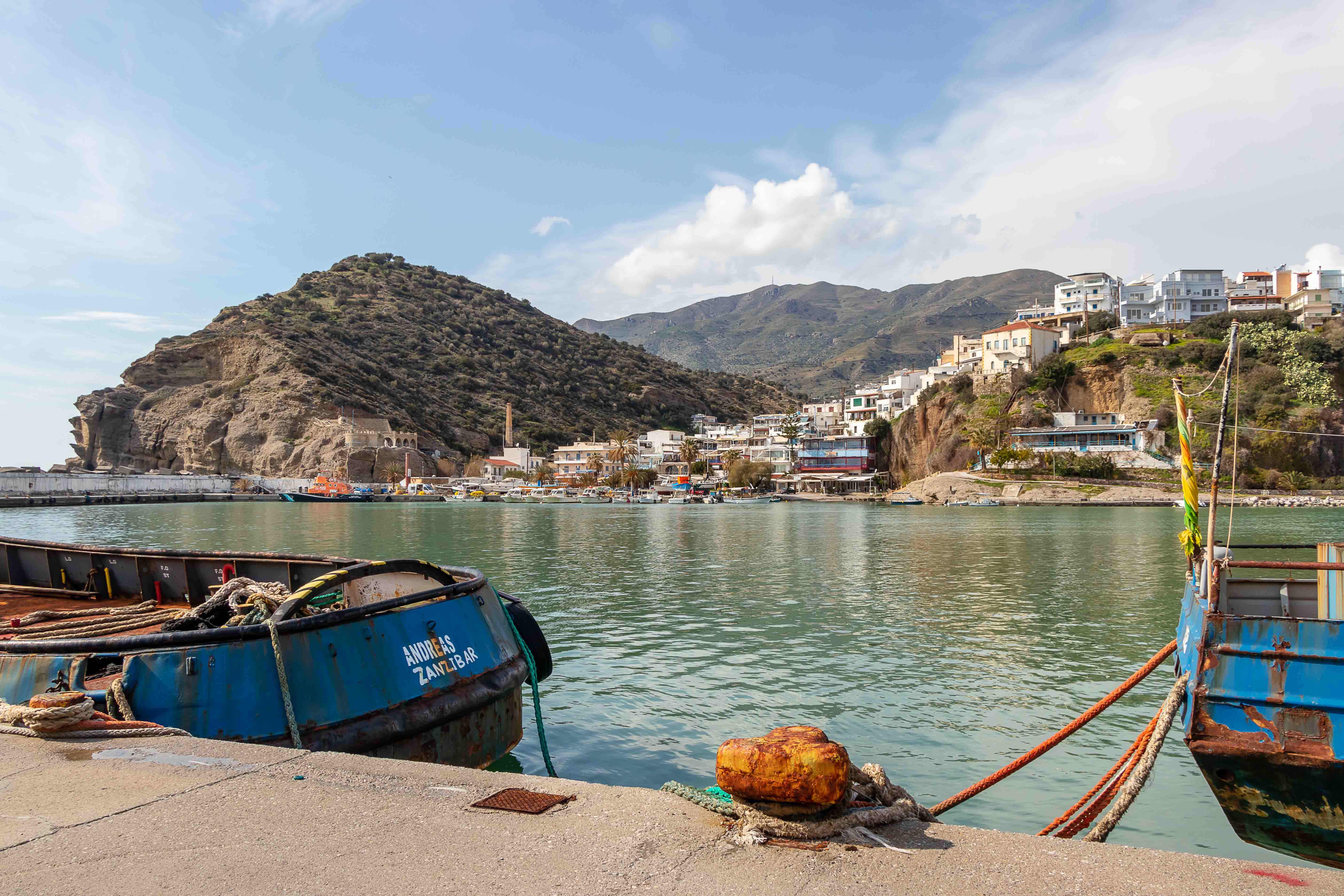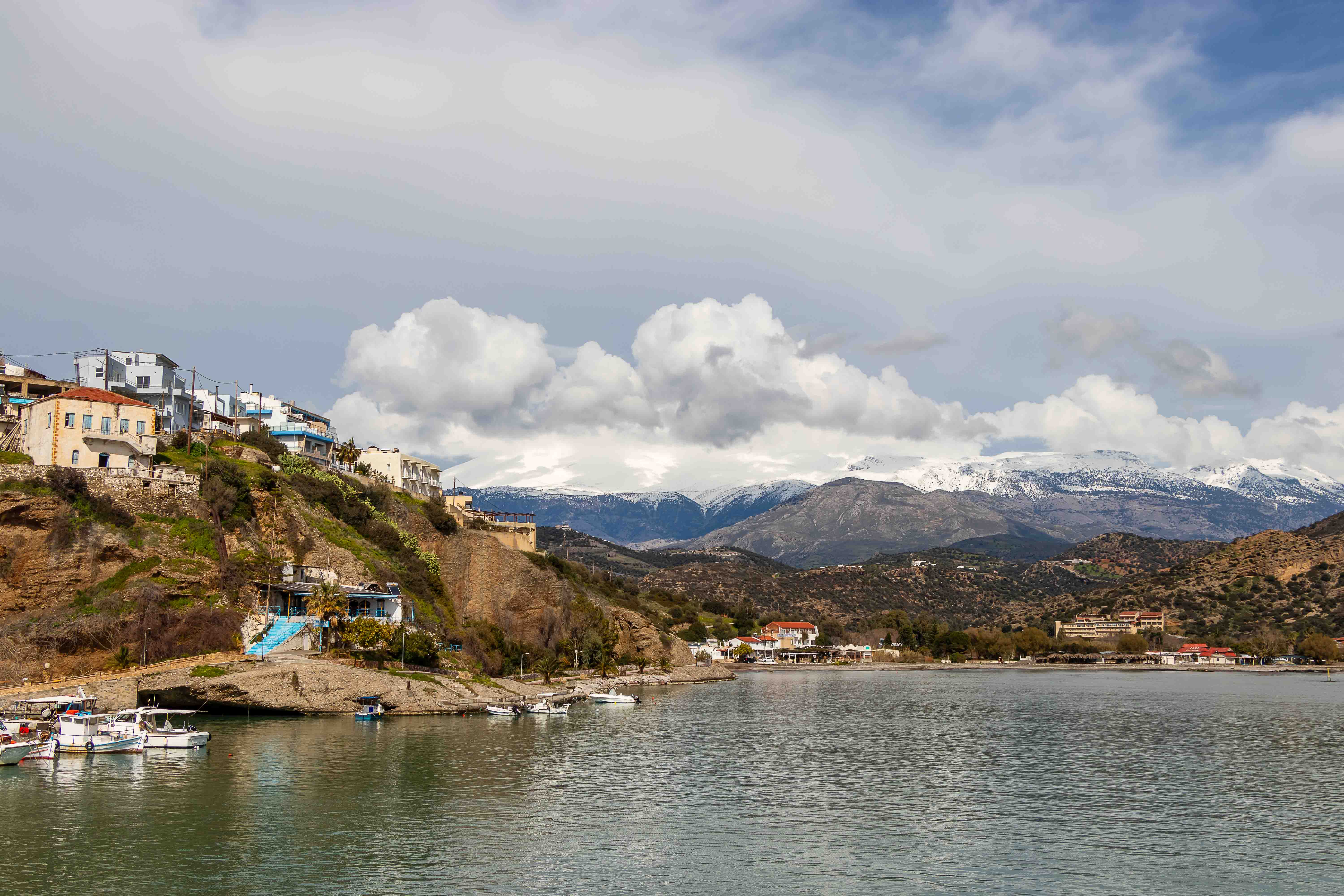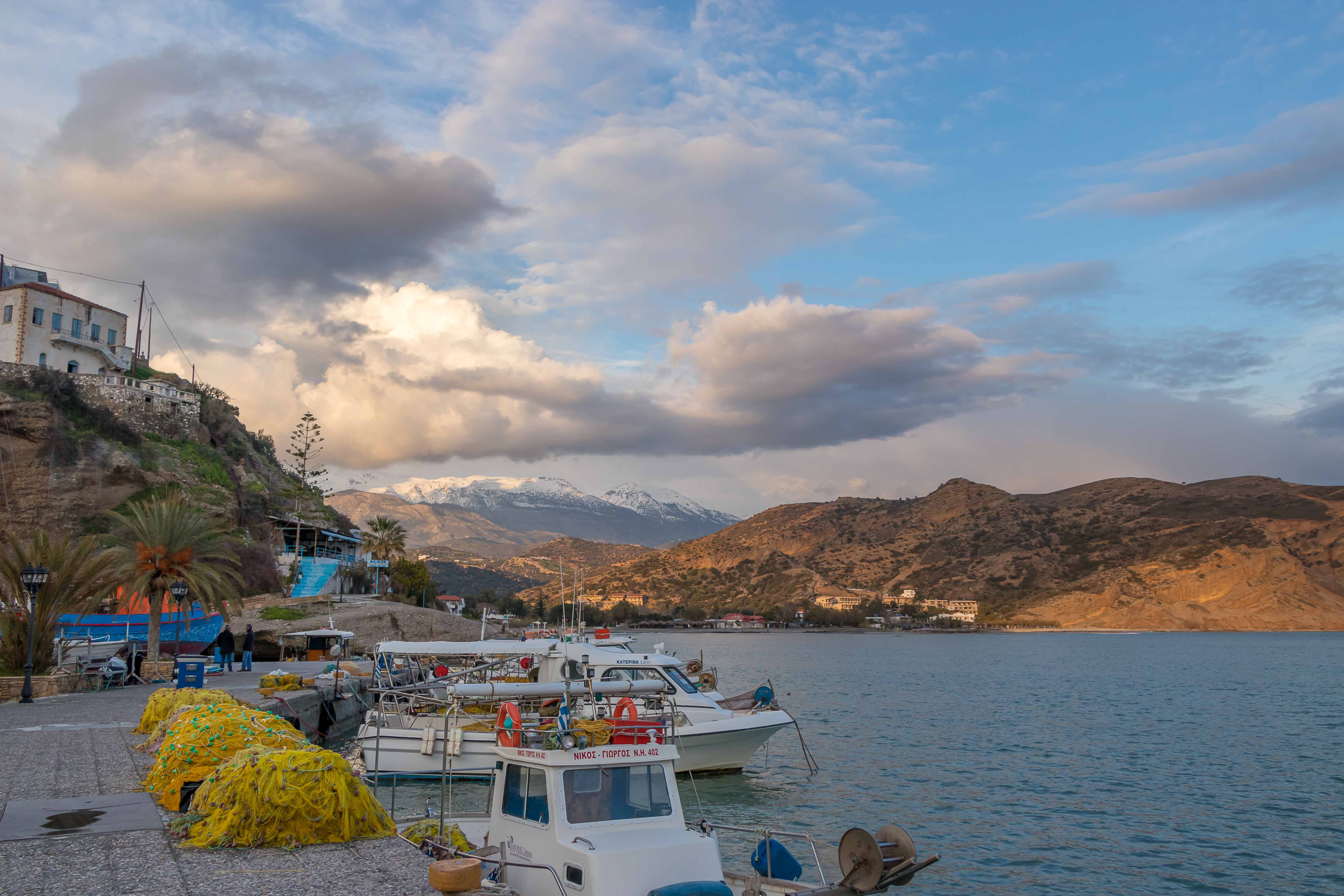 Auf dem weiteren Weg gießt es aus den tief hängenden Wolken. Entweder regnet es immer in AGÍA GALINÍ oder wir fahren nur bei schlechtem Wetter in die alte Hafenstadt. Doch die straft uns Lügen: immer mehr hellt sich der Himmel über uns auf und es scheint stundenlang die Sonne, sogar die weißen Berge des PSILORÍTIS-GEBIRGES lassen sich unter hoch aufschießenden Wolken blicken.