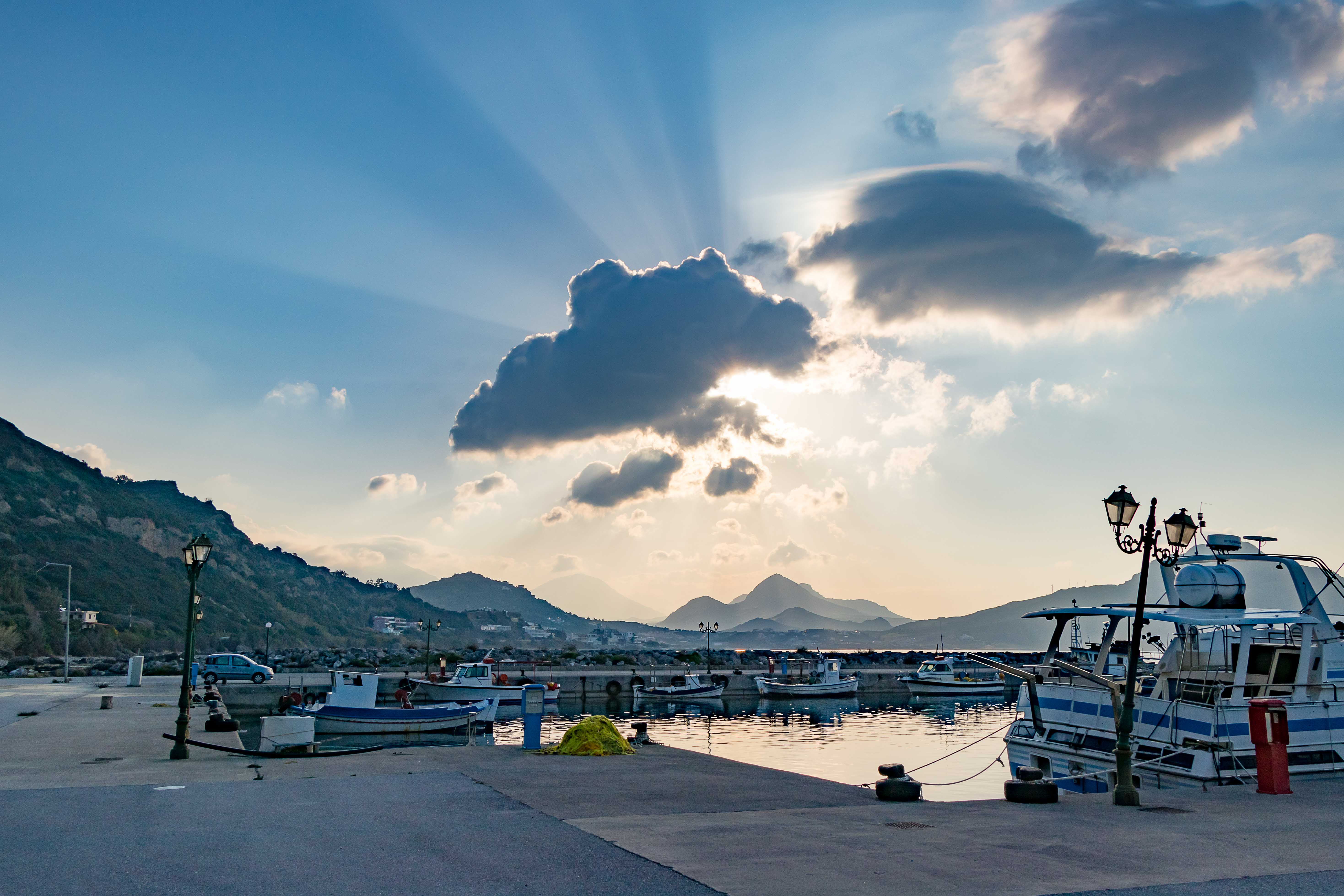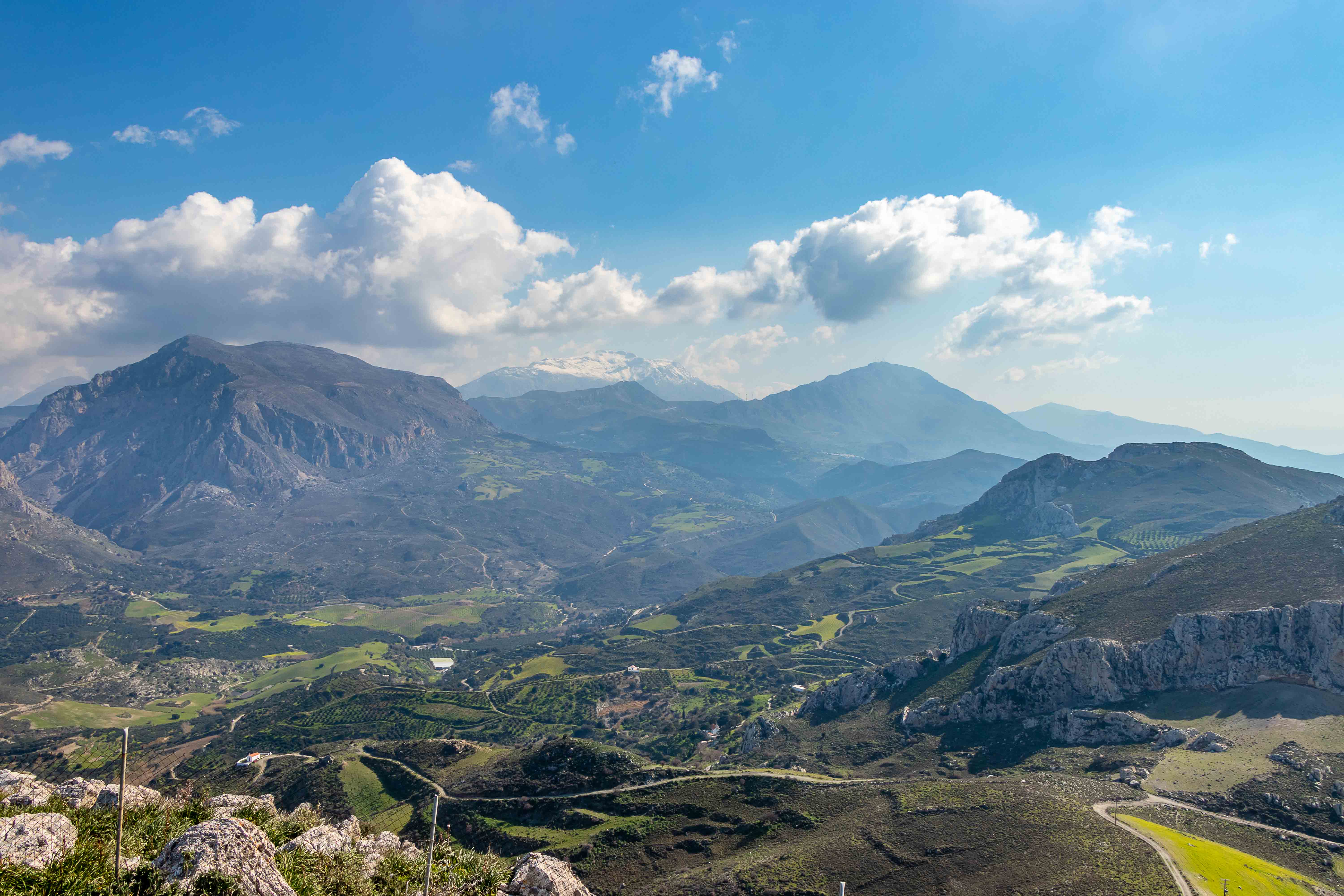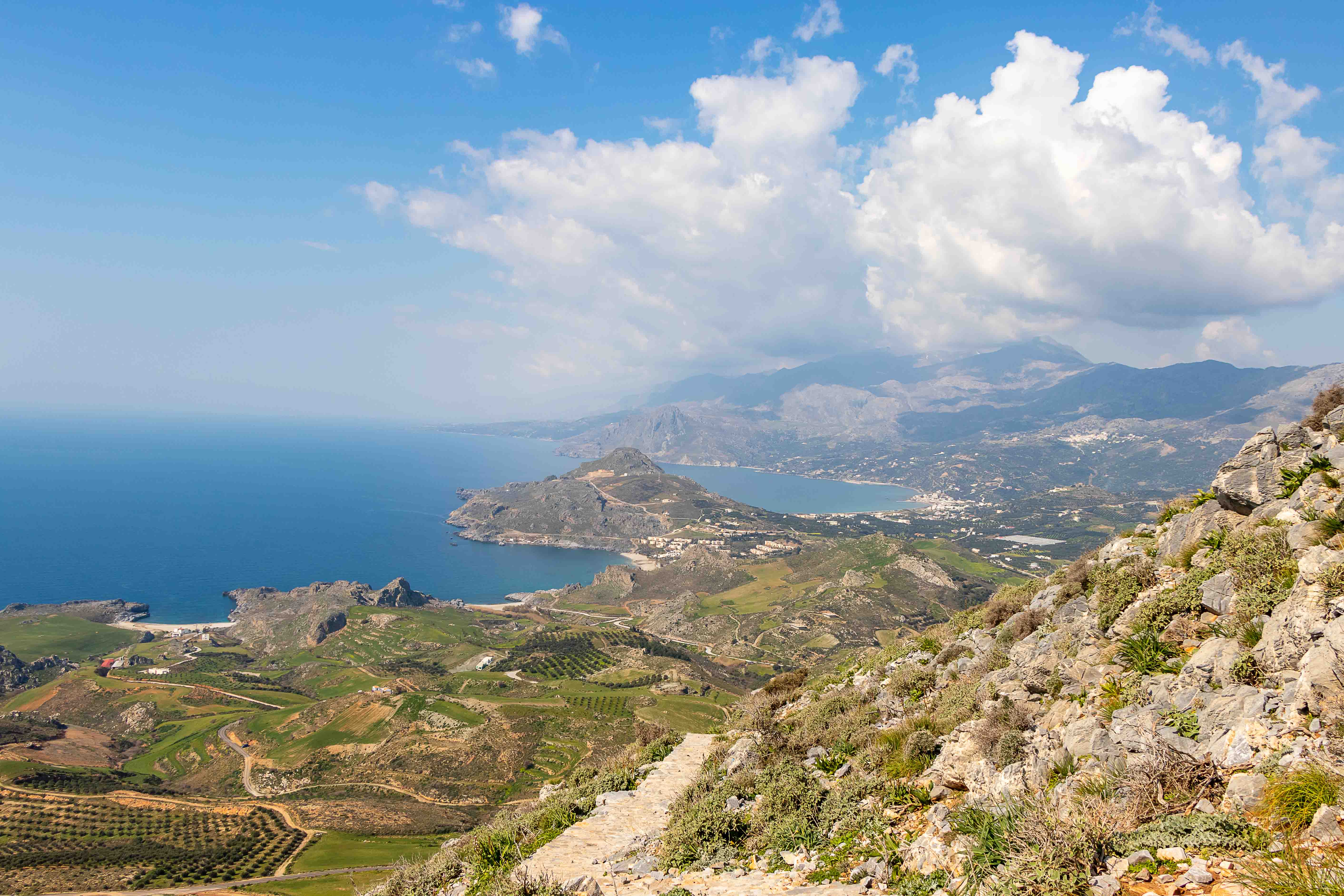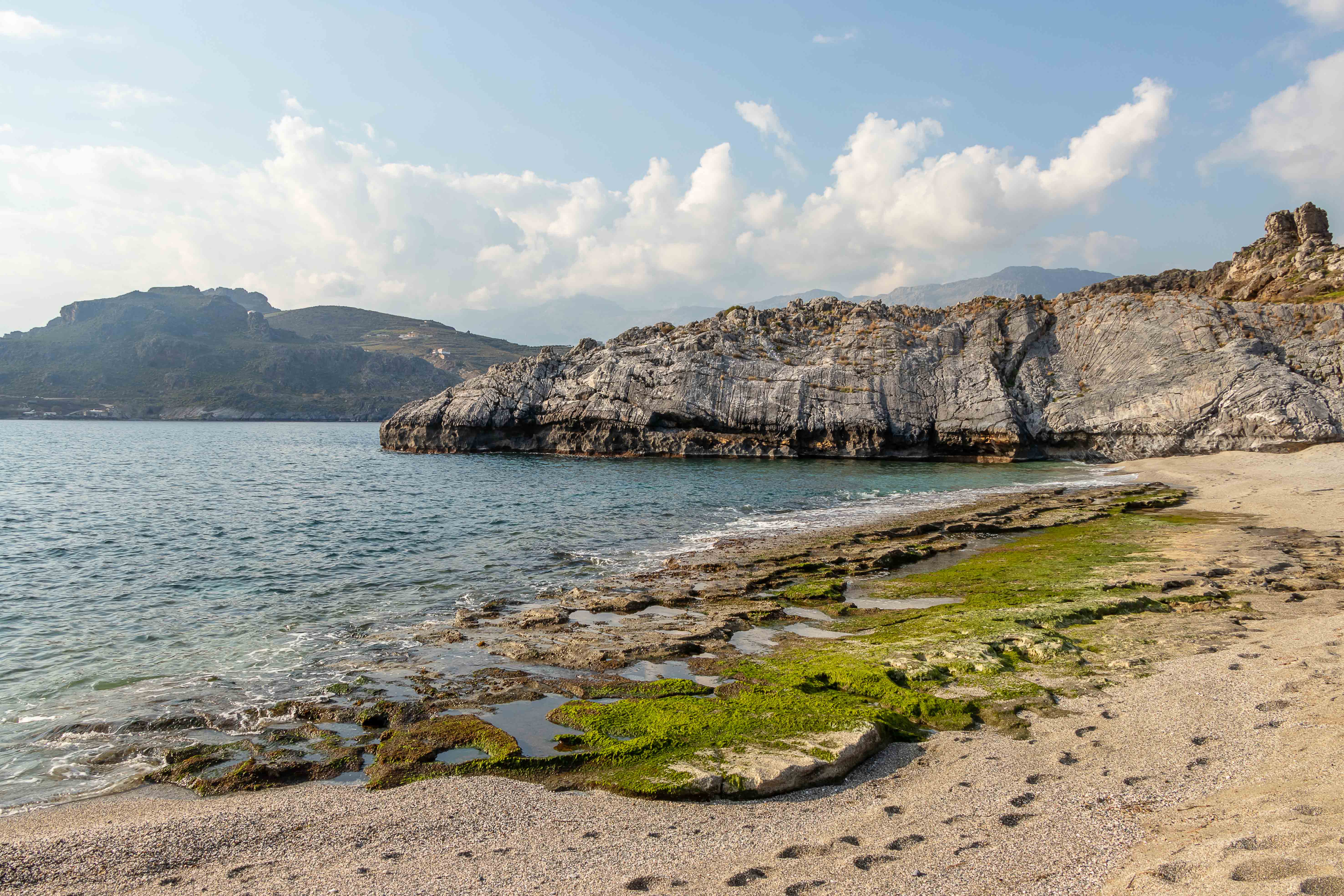 Auf dem weiteren Weg gießt es aus den tief hängenden Wolken. Entweder regnet es immer in AGÍA GALINÍ oder wir fahren nur bei schlechtem Wetter in die alte Hafenstadt. Doch die straft uns Lügen: immer mehr hellt sich der Himmel über uns auf und es scheint stundenlang die Sonne, sogar die weißen Berge des PSILORÍTIS-GEBIRGES lassen sich unter hoch aufschießenden Wolken blicken.
