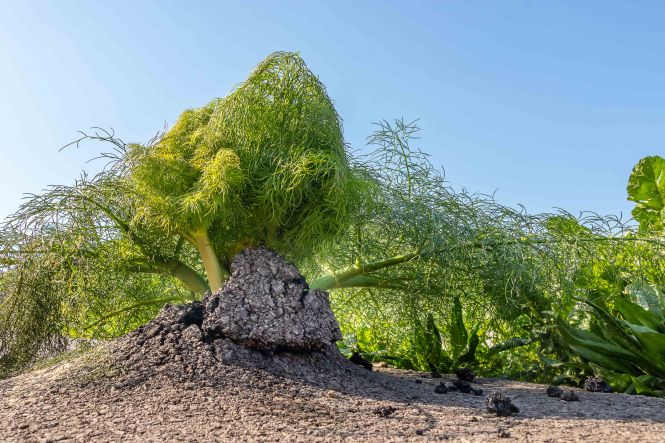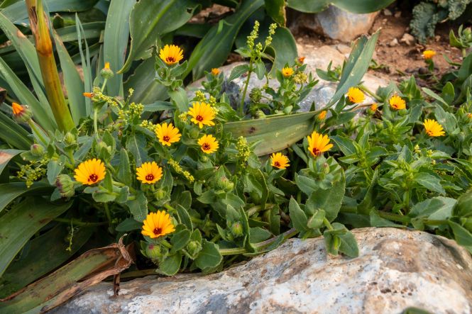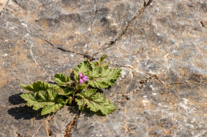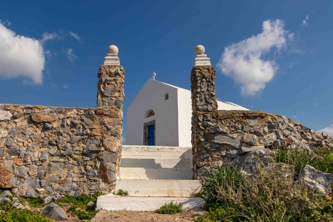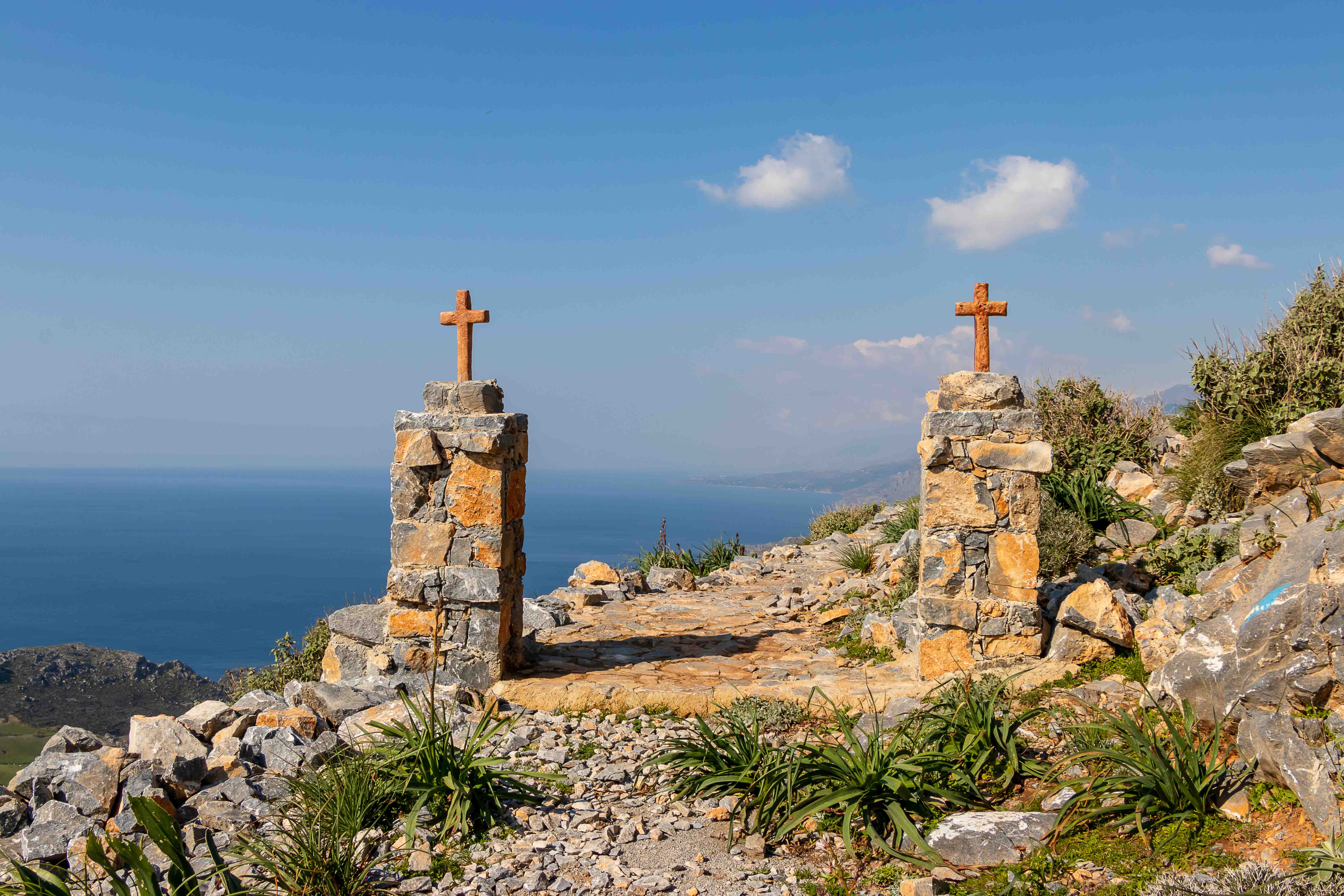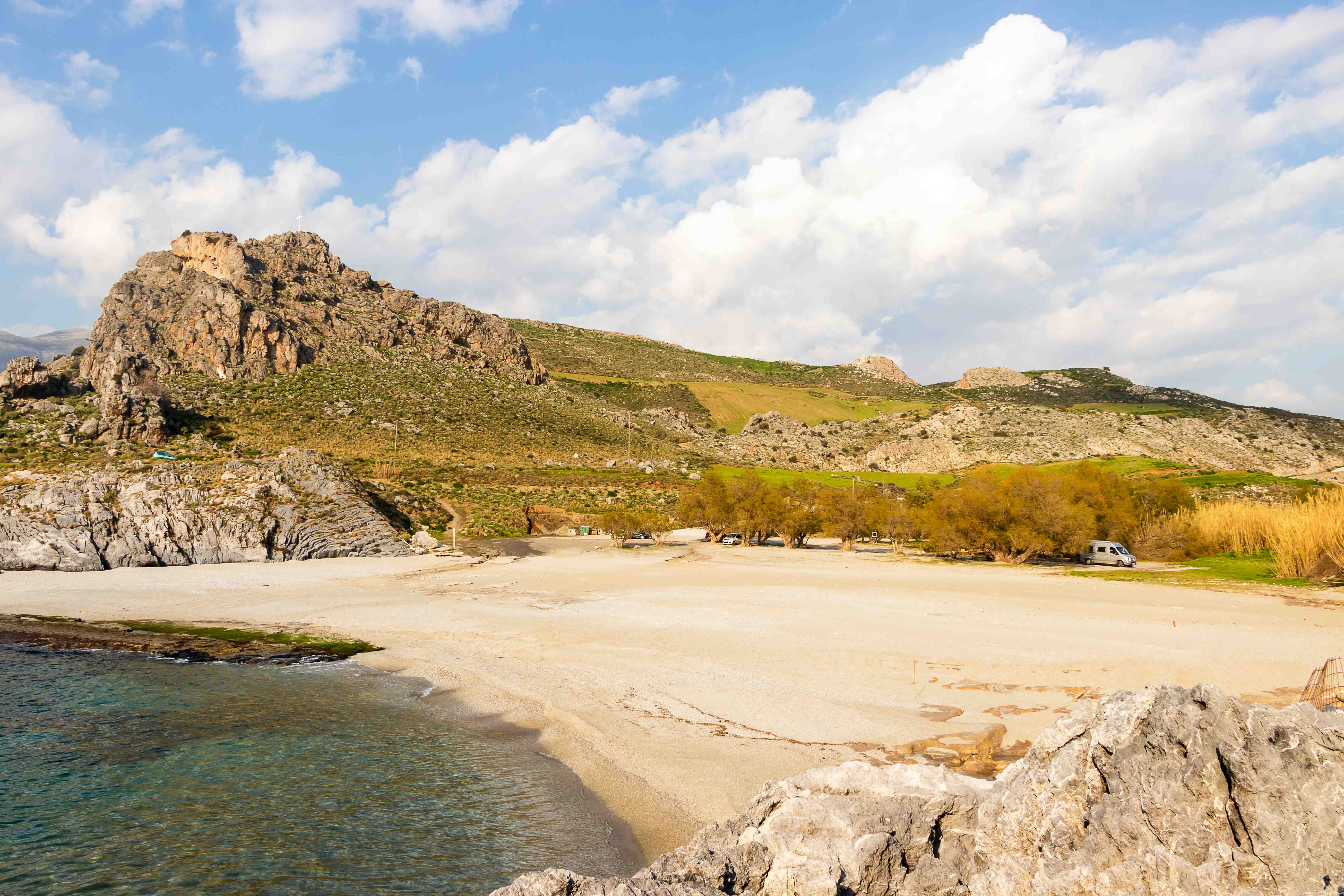 Dann lockte da bei der Herfahrt vor etwa sechs Wochen noch ein kugeliger Berg, natürlich von einer kleinen weißen Kirche gekrönt. Heute ist es sonnig und warm, ideales Wanderwetter. Wir parken den Dicken hinter dem Weiler LEFKÓGIA an einem Olivenhain, durch den der Weg auf einer Piste beginnt. In einem ehemaligen Waschhaus plätschert munter der Brunnen, kein Wunder nach dem vielen Regen. Weiter geht es auf einer neu asphaltierten Straße, durch den aber schon wieder frisches Grün drängt. Auch sonst ist der Frühling stark am Arbeiten, zwischen den stacheligen Igelpolstern blüht es überall. Die Teerstraße geht in eine Piste über, in einen gepflasterten Weg und schließlich in einen kleinen Steig. Nach einer Stunde und runden 300 Höhenmetern stehe ich oben bei der kleinen Kirche. Im Windschatten an die weiße Wand gelehnt ist es wunderbar warm. Fantastisch ist der Rundblick: die mächtigen Berge der LEFKÁ ÓRI und des PSILORÍTIS-GEBIRGES sind im Dunst zu sehen, mir zu Füßen liegt das weite Rund von PLAKIÁS und unsere heutige kleine Übernachtungsbucht AMMOÚDI. Hinunter geht es natürlich schneller, zumal ich nun Abkürzer entdecke und nicht nur auf der breiten Straße laufen muss. Schnell sind wir in der kleinen Bucht. Ein paar Sonnenhungrige kommen noch vorbei, doch dann gehört uns dieses kleine Paradies ganz alleine.