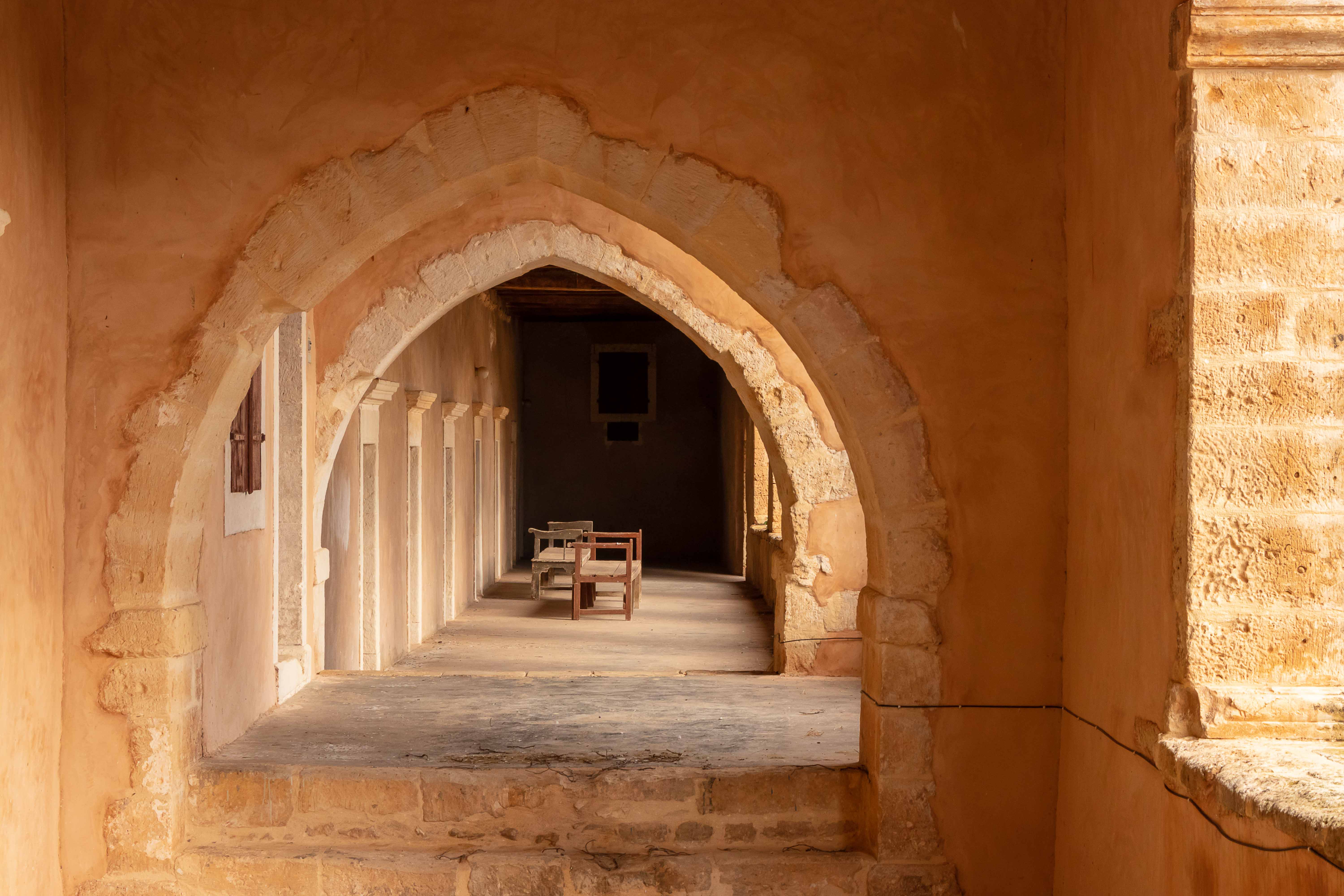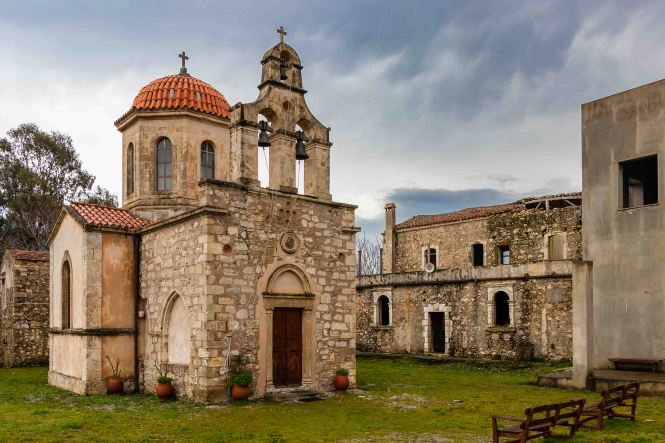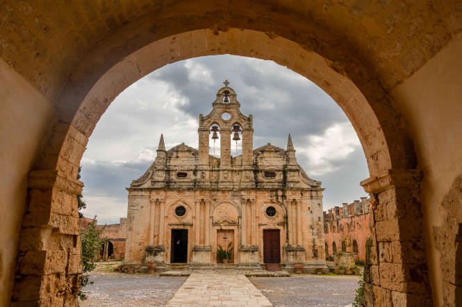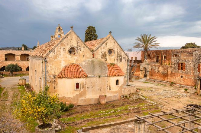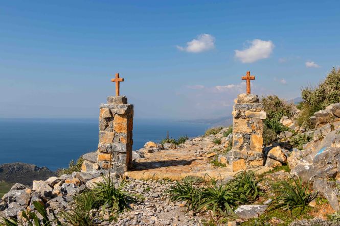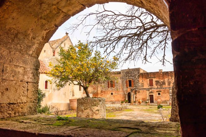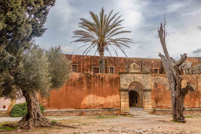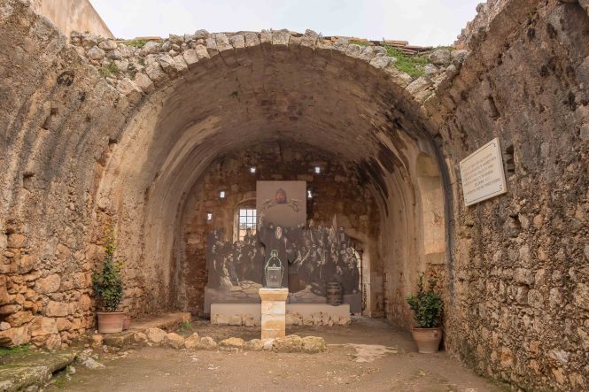 Unseren ersten Stopp machen wir beim MONÍ ARKADÍ, das für die Kreter ein wichtiges Symbol ihres Freiheitswillens ist. Den Abt Gavriíl wählten die Aufständischen von Réthimnon zu ihrem Führer. Am 7. November 1866 stehen 15 000 Türken mit 25 Kanonen und 2 Haubitzen vor den Toren des Klosters. Denen stehen 964 Menschen, davon nur 325 Männer gegenüber, diese nur mit Vorderladern bewaffnet. Zwei Tag später beginnt die entscheidende Schlacht. Als die Türken das Kloster stürmen, versammeln sich alle Überlebenden in der Pulverkammer. Mit einer seiner letzten Patronen schießt Kóstas Giampoudákis, der Bürgermeister des nahen Örtchens Ádele, in die Pulverfässer. Das Arsenal fliegt in die Luft und reißt die verzweifelten Kreter und mit ihnen Dutzende von Türken in den Tod. Am Abend sind 750 Kreter und 1500 Türken gefallen. Am 8. November, dem Nationalfeiertag der Kreter, zieht eine große Prozession hinauf zum Kloster, um diesen Geschehen zu gedenken. Als wir so durch die Anlage schlendern, fühlen wir uns in einen Western versetzt; im Ohr hören wir die Mundharmonika vom „Spiel mir das Lied vom Tod.“ Das ist jetzt an diesem Ort vielleicht ein wenig makaber.