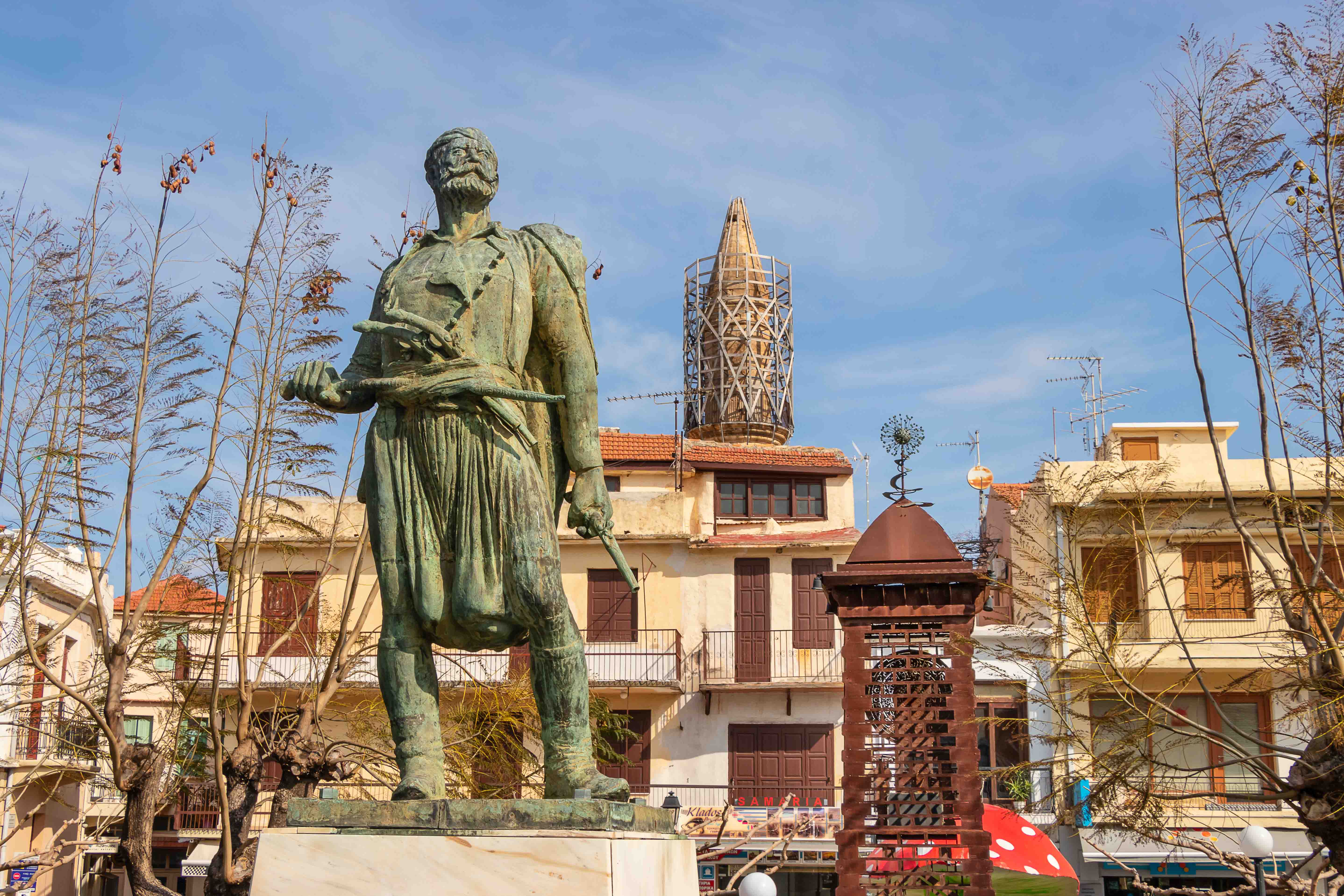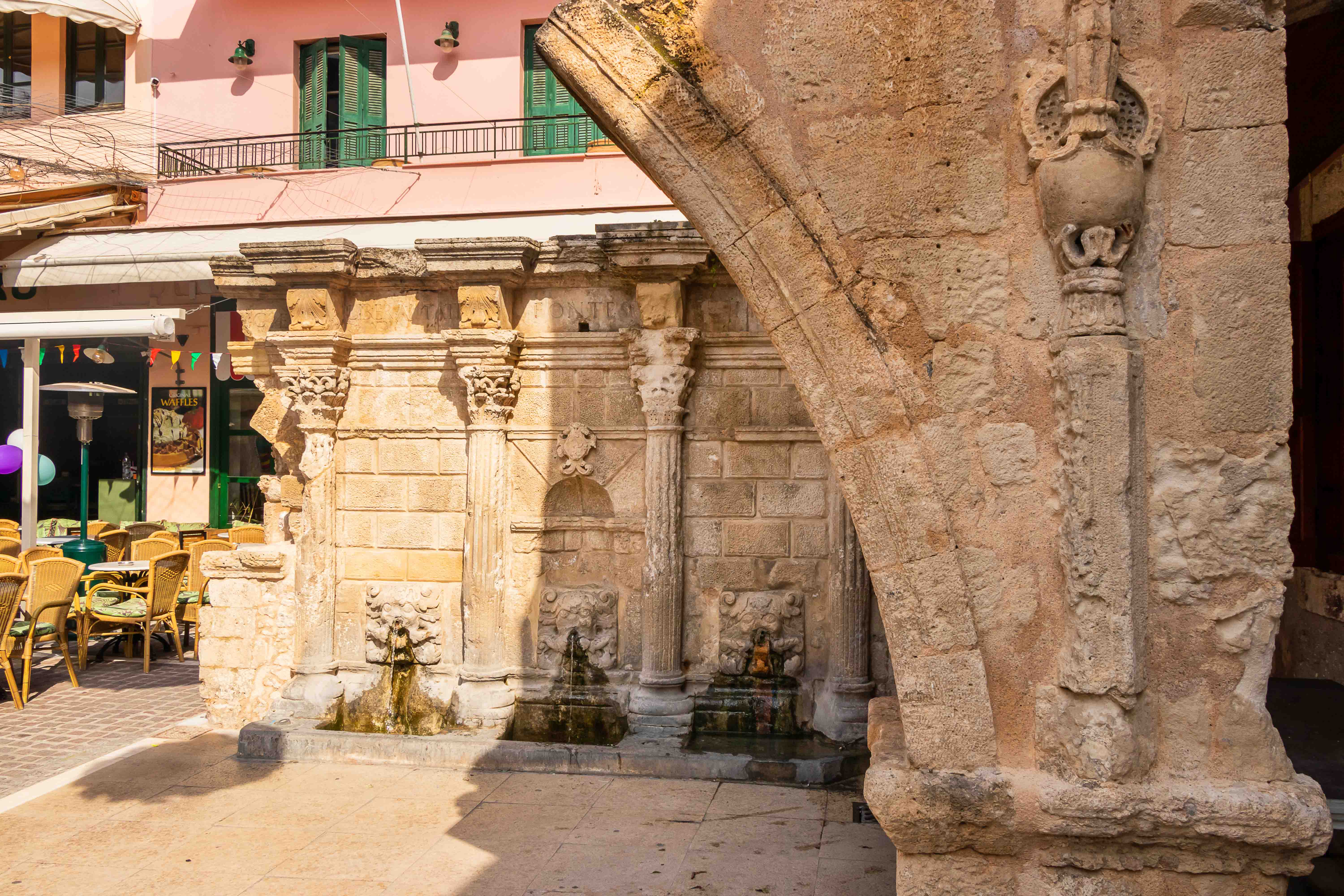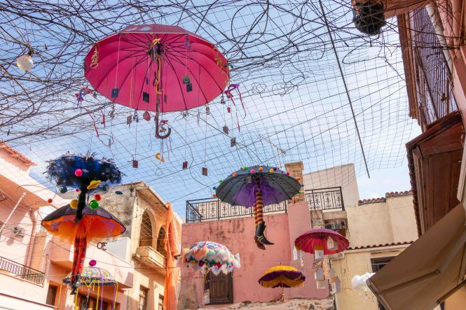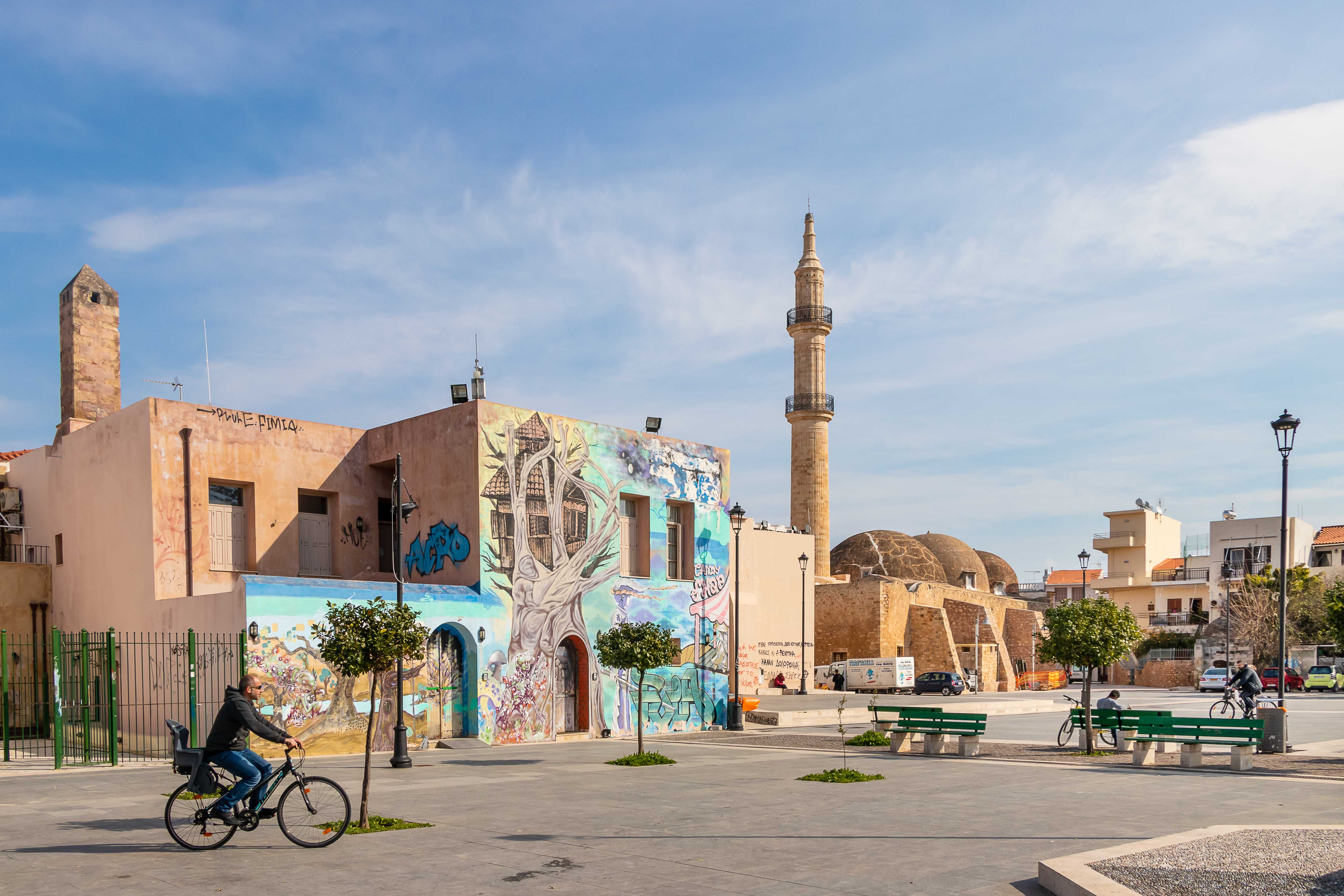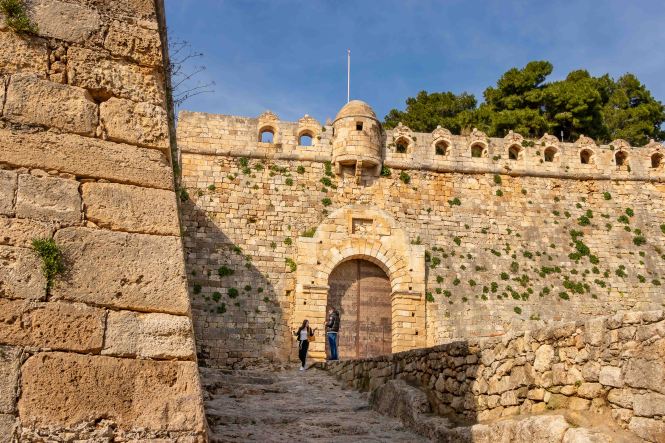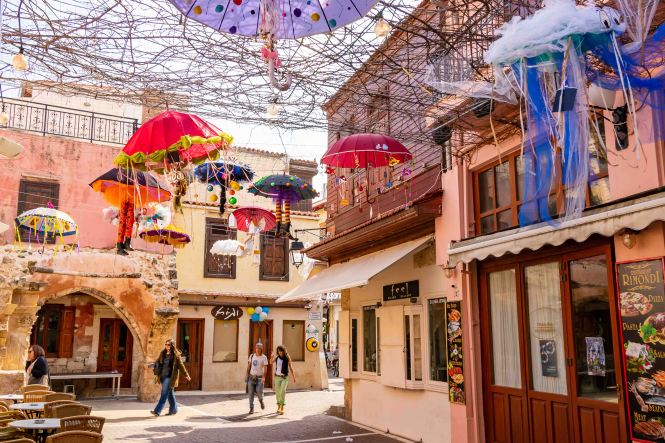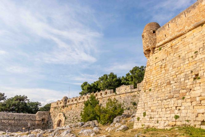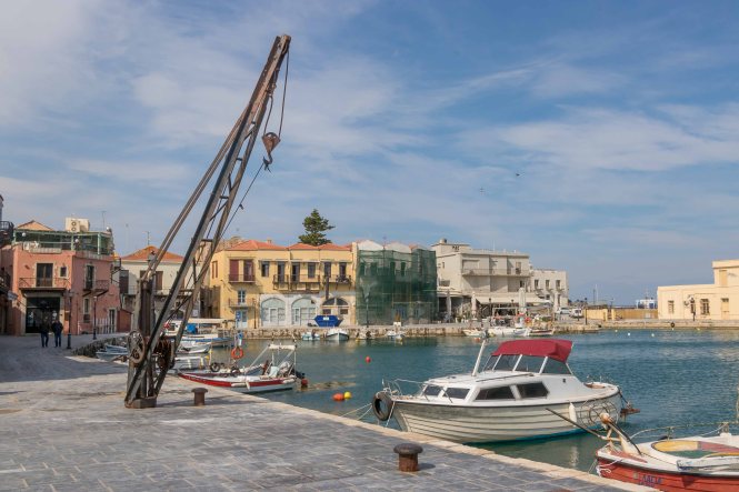 Am Morgen klopfen ein paar Regentropfen auf unser Dach. Von Süden schiebt der Wind dicke schwarze Wolken heran, es ist wieder einmal Zeit nach Norden zu fahren. Auf schon bekannten Wegen fahren wir auf breiter und komfortabler Straße durch die enge KOURTALÍOTIS-SCHLUCHT. Doch heute biegen wir nicht nach SPÍLI ab, sondern fahren geradeaus nach RÉTHIMNON. Vorbei am quirligen Wochenmarkt finden wir unterhalb der mächtigen venezianischen Fortezza direkt am Meer einen freien Parkplatz. Schnell machen wir uns auf zu einer kleinen Stadtrunde. Leider ist die Burg verschlossen. In viele Häuser haben sich Tavernen eingenistet, die nun meist alle geschlossen sind. Daher wirken die eigentlich schönen Gassen etwas trist. Auch verfallen recht viele der einst prunkvollen, wohl meist ursprünglich türkischen, Wohnhäuser. Seltsamerweise sind einige Moscheen erhalten geblieben, deren schlanke Minarette gut restauriert in den blauen Himmel ragen. Die Stadt scheint sich auf den Fasching vorzubereiten. In den Gassen rund um den alten RIMONDI-BRUNNEN hängen bunte Schirme, weit verstreut stehen Pappmaschee-Figuren.