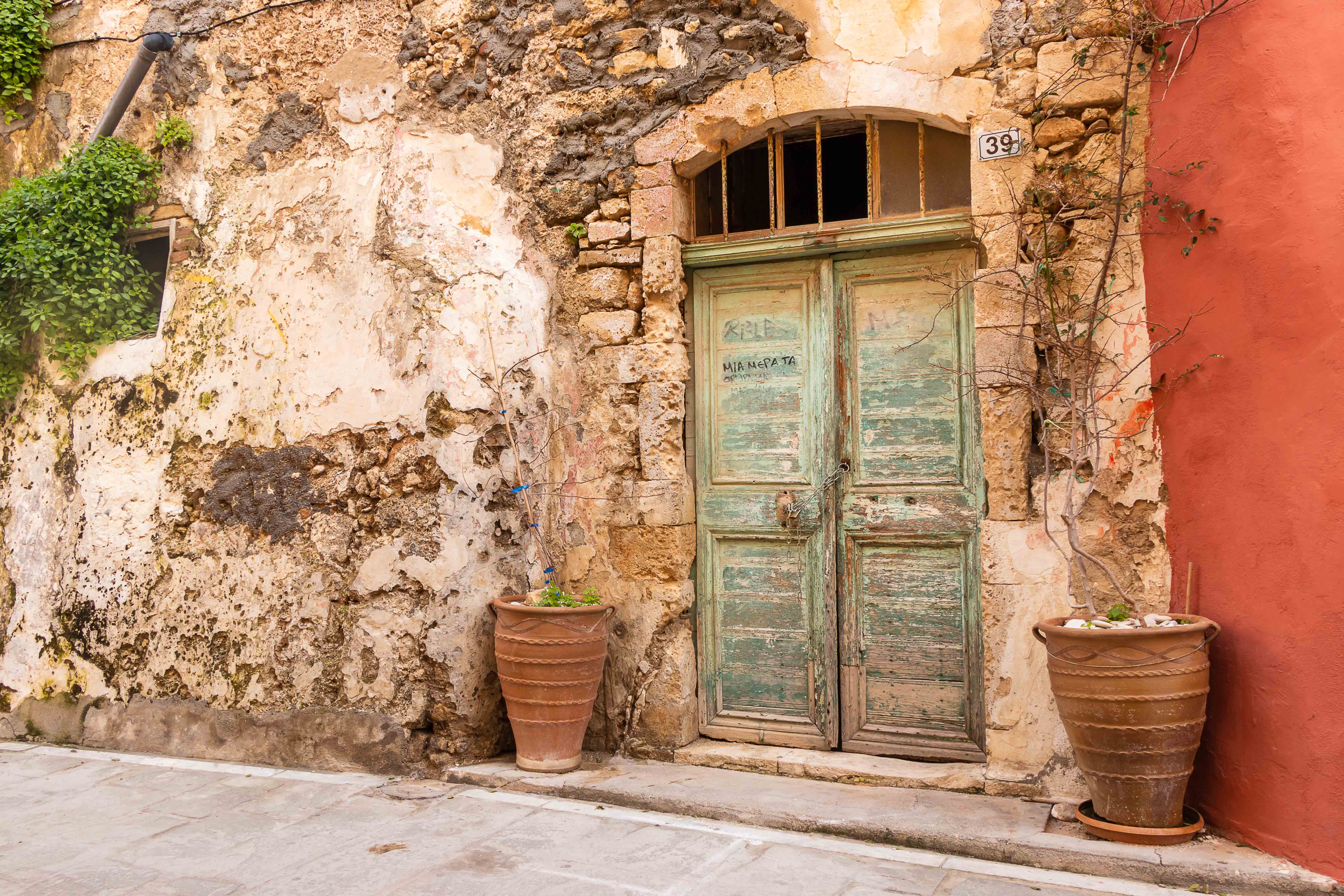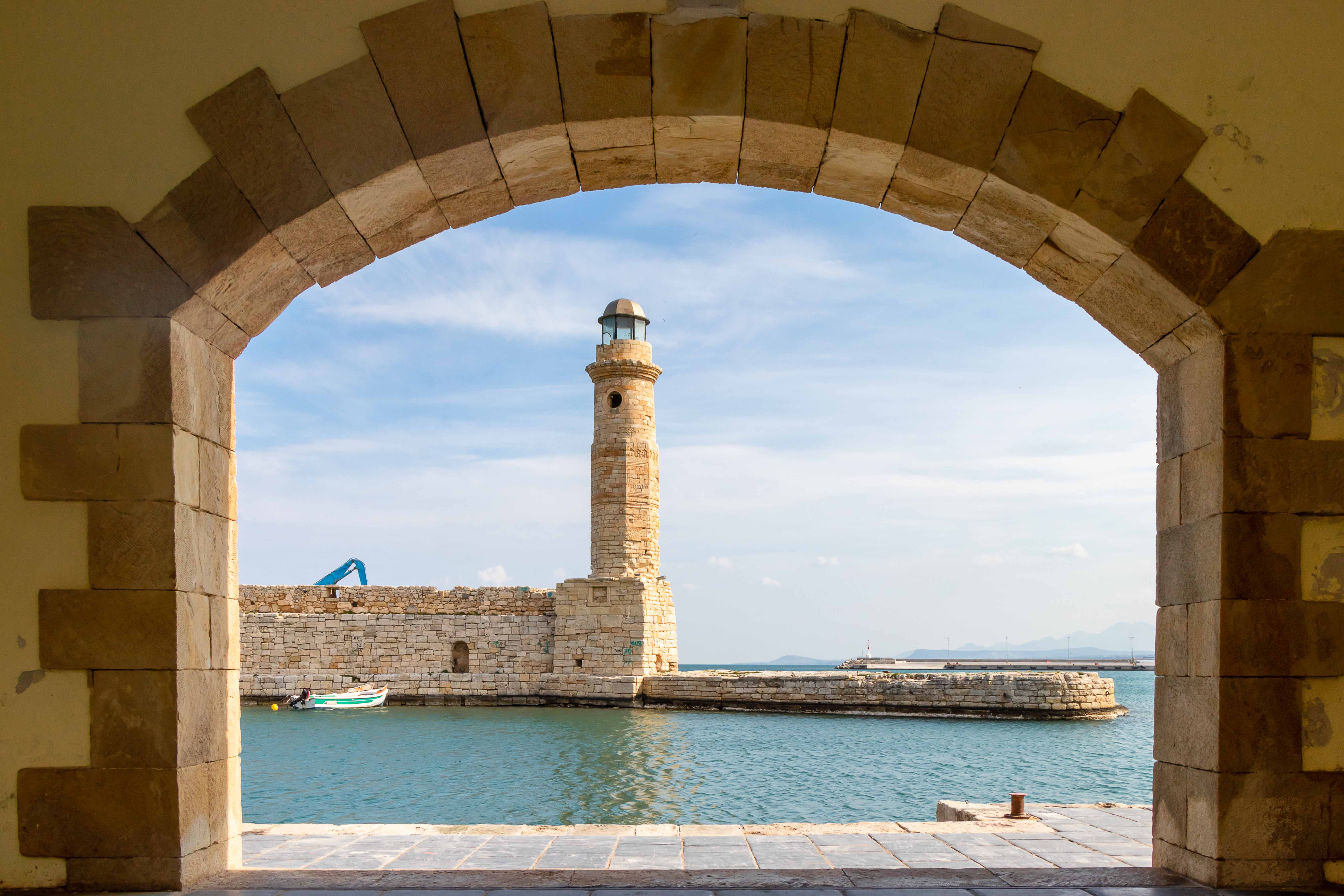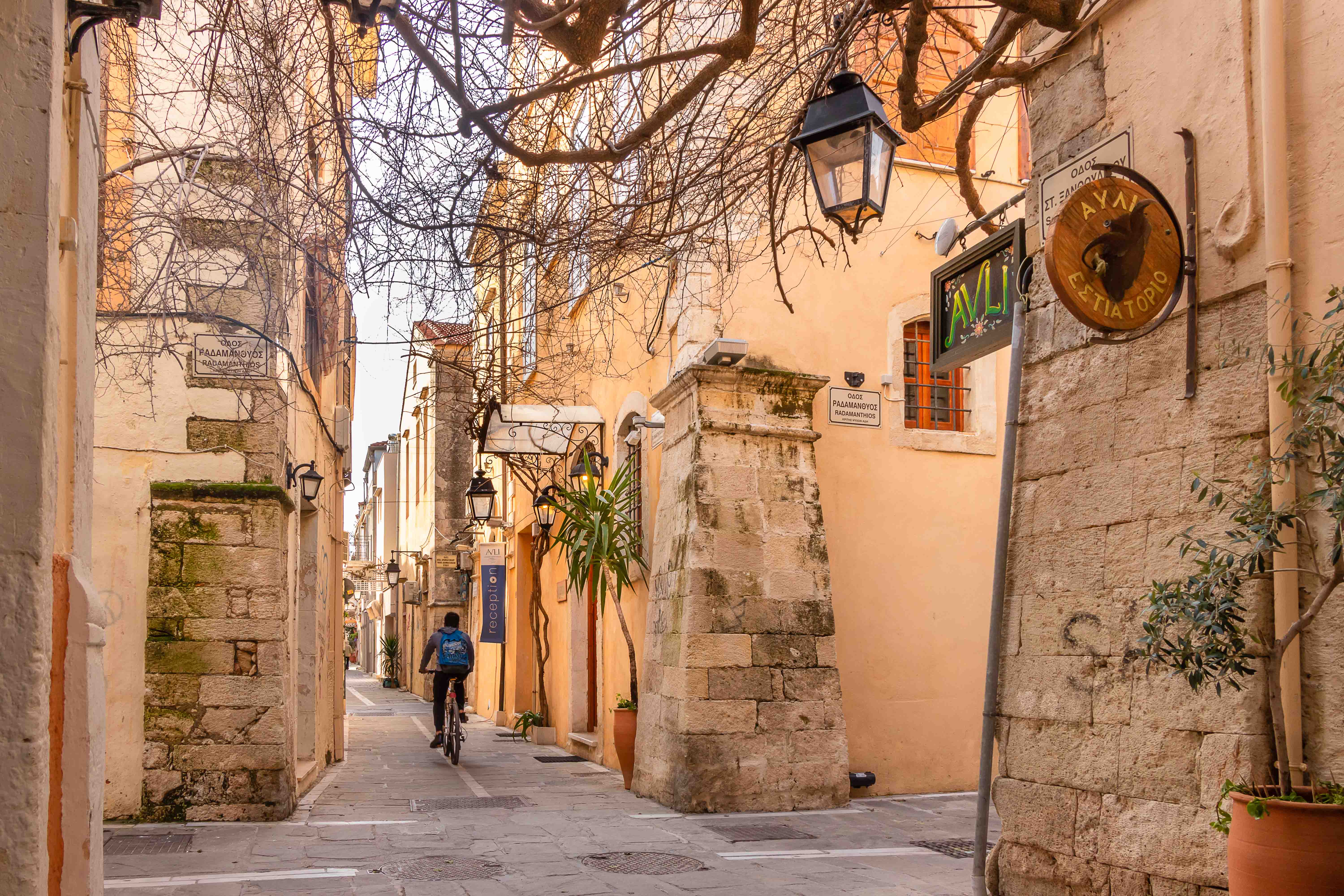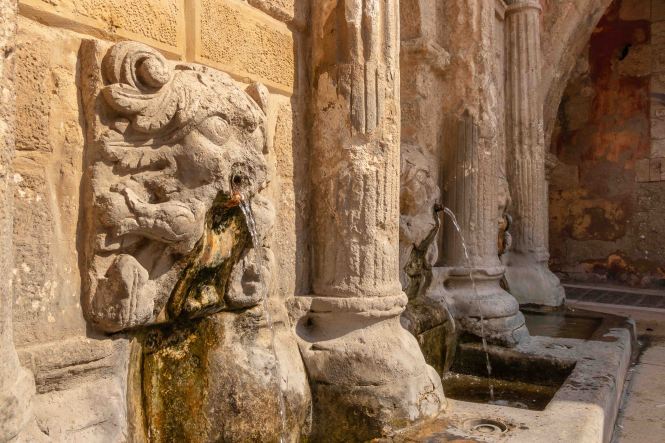 Am Morgen klopfen ein paar Regentropfen auf unser Dach. Von Süden schiebt der Wind dicke schwarze Wolken heran, es ist wieder einmal Zeit nach Norden zu fahren. Auf schon bekannten Wegen fahren wir auf breiter und komfortabler Straße durch die enge KOURTALÍOTIS-SCHLUCHT. Doch heute biegen wir nicht nach SPÍLI ab, sondern fahren geradeaus nach RÉTHIMNON. Vorbei am quirligen Wochenmarkt finden wir unterhalb der mächtigen venezianischen Fortezza direkt am Meer einen freien Parkplatz. Schnell machen wir uns auf zu einer kleinen Stadtrunde. Leider ist die Burg verschlossen. In viele Häuser haben sich Tavernen eingenistet, die nun meist alle geschlossen sind. Daher wirken die eigentlich schönen Gassen etwas trist. Auch verfallen recht viele der einst prunkvollen, wohl meist ursprünglich türkischen, Wohnhäuser. Seltsamerweise sind einige Moscheen erhalten geblieben, deren schlanke Minarette gut restauriert in den blauen Himmel ragen. Die Stadt scheint sich auf den Fasching vorzubereiten. In den Gassen rund um den alten RIMONDI-BRUNNEN hängen bunte Schirme, weit verstreut stehen Pappmaschee-Figuren.