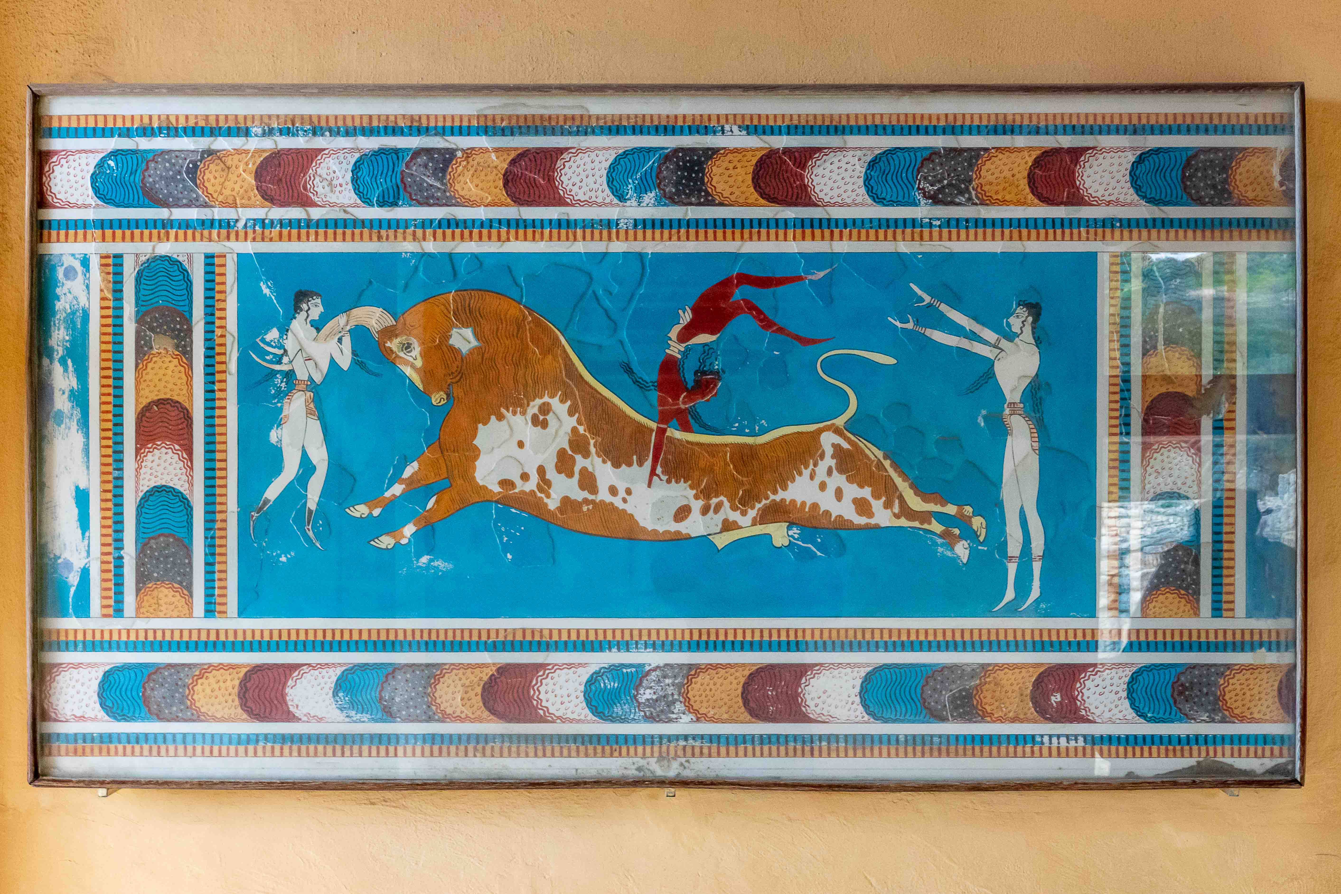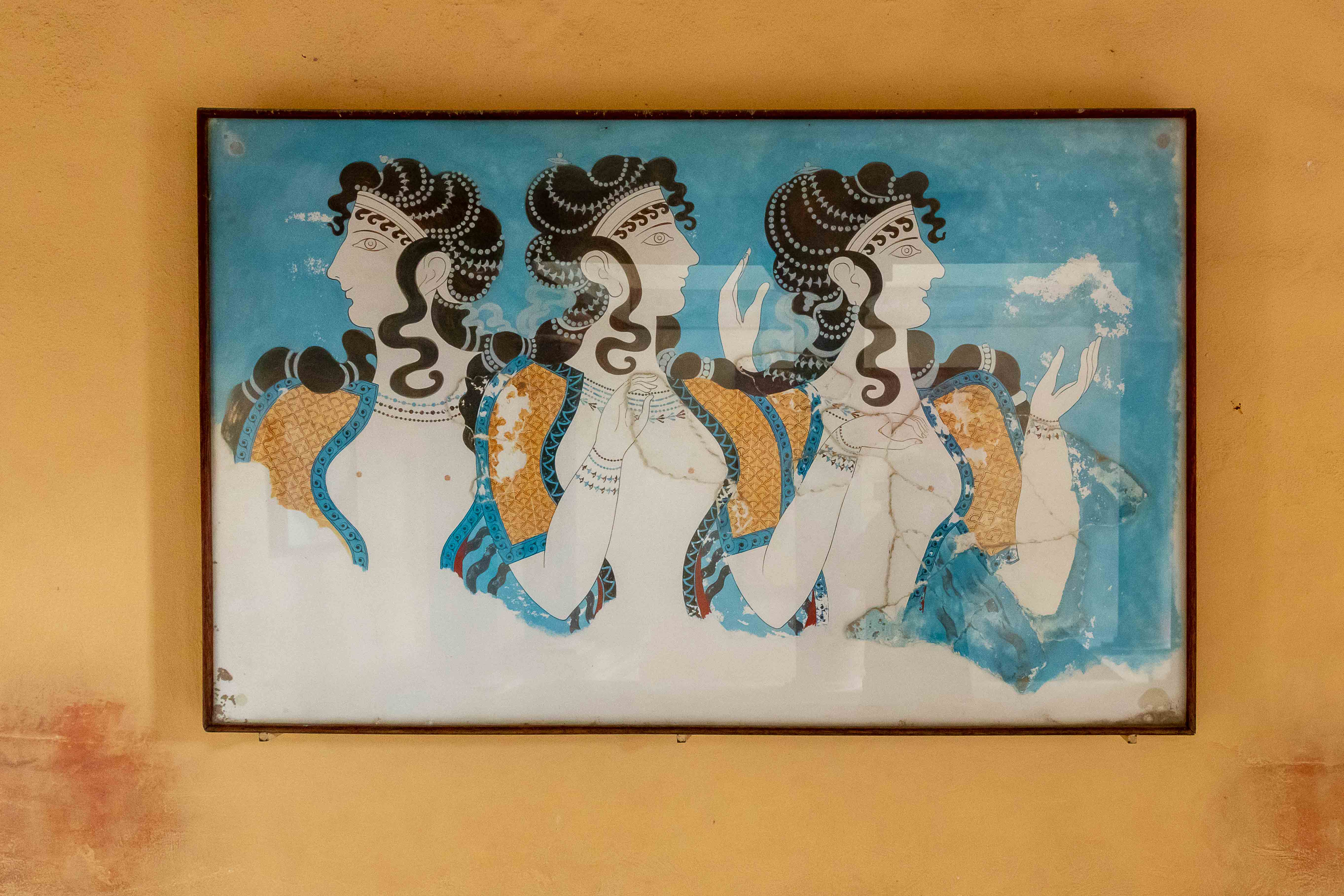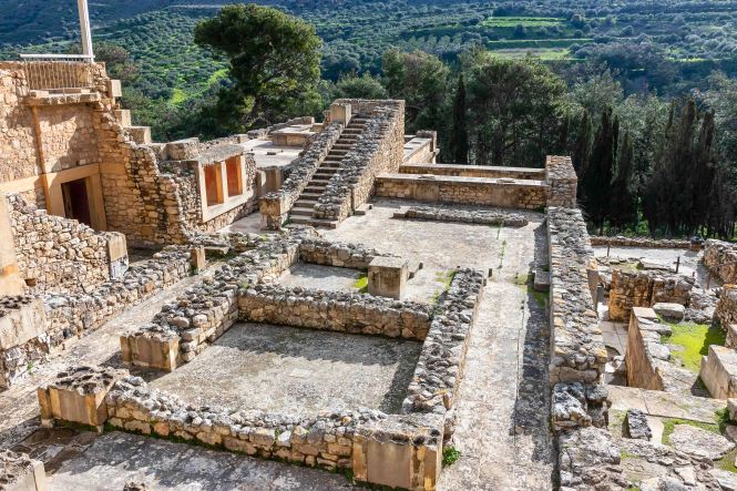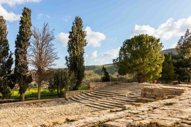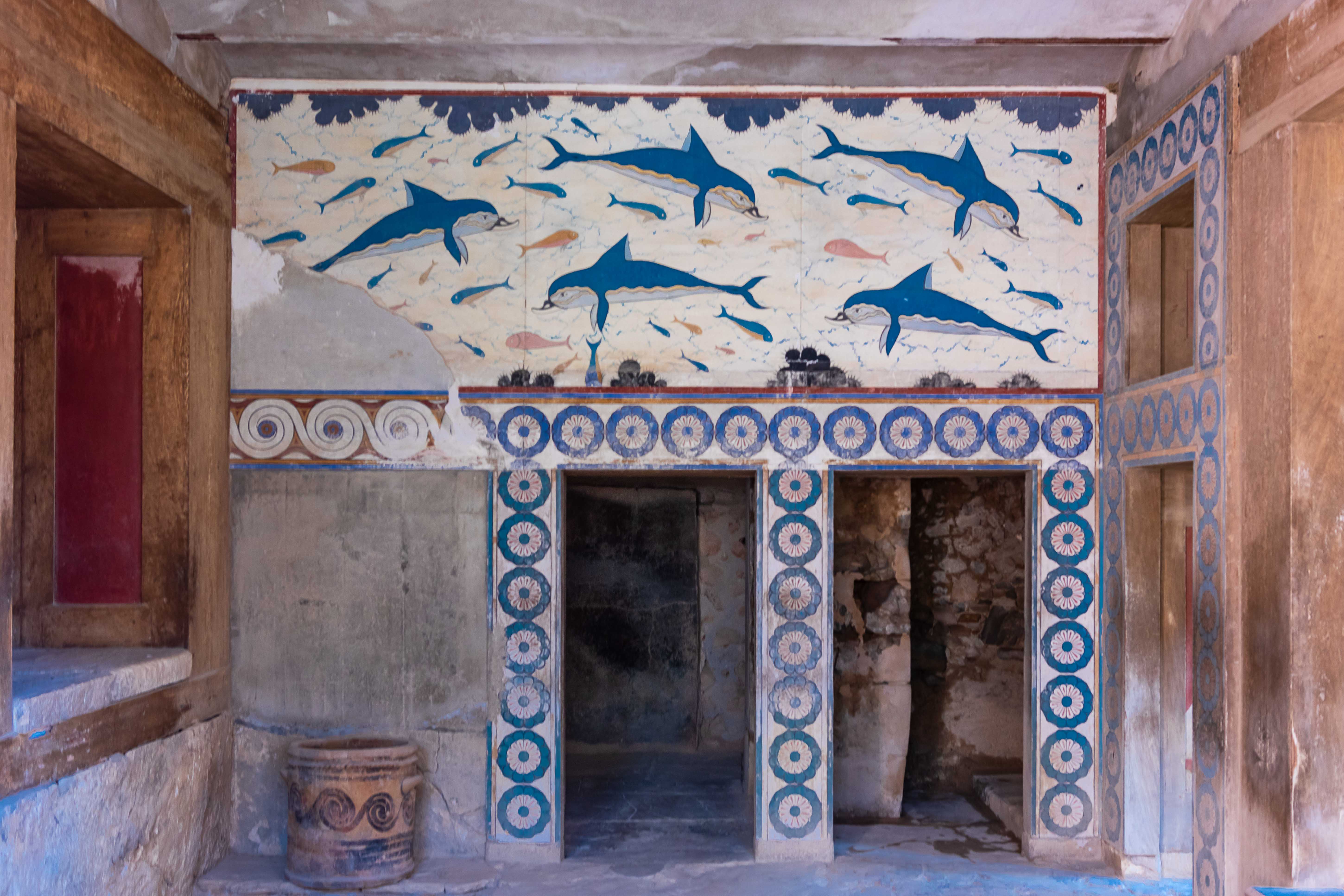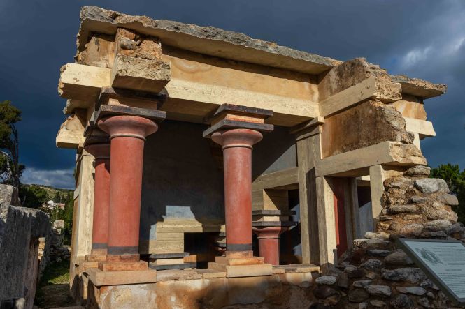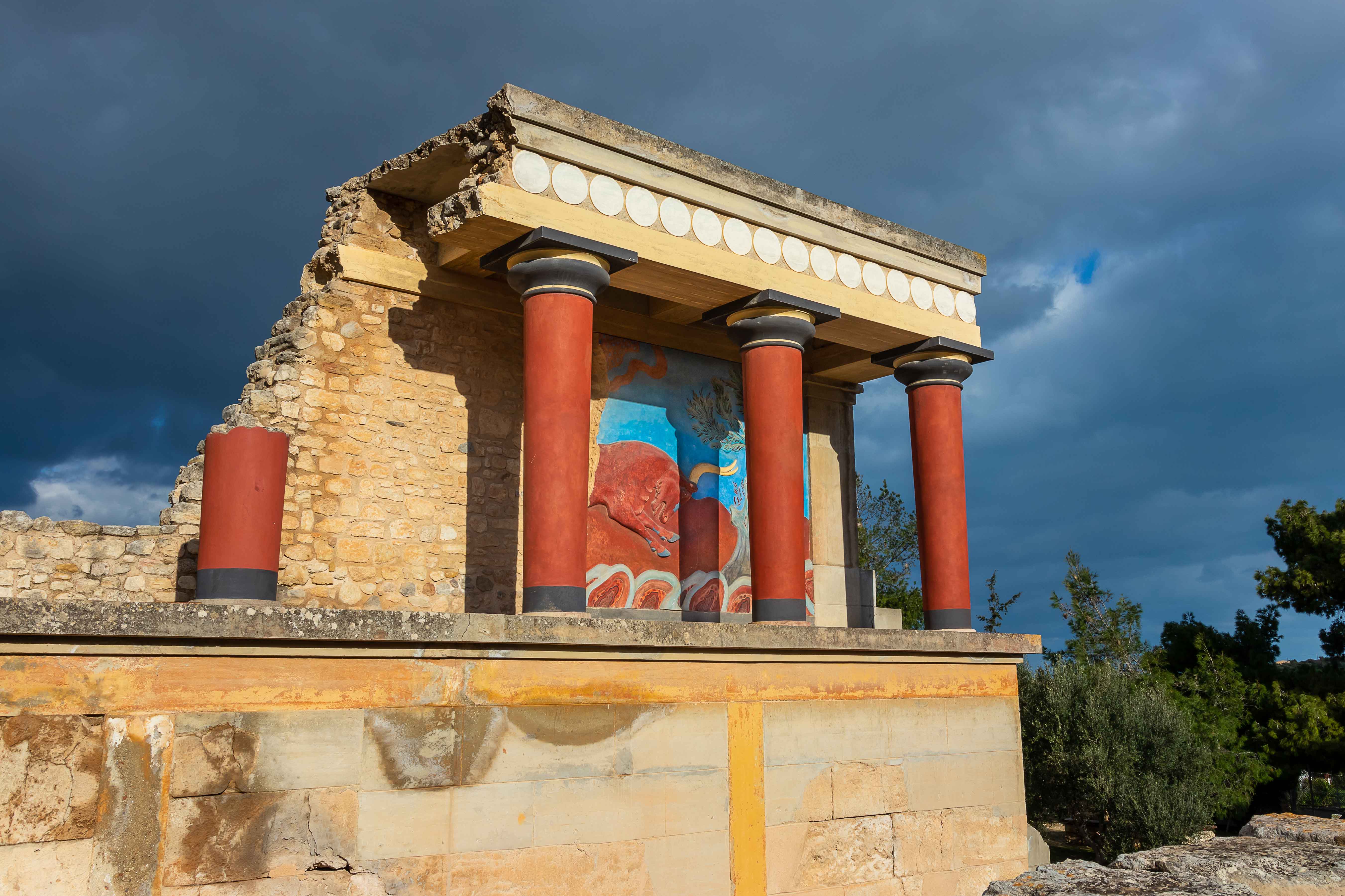 Nun sind wir bereits 11 Wochen auf dieser wunderbaren Insel und haben fast alles gesehen, was uns interessierte. So langsam wird der Wunsch wach, wieder aufs Festland überzusetzen. Wir befragen die Windy-App und sehen für die Nacht von Donnerstag auf Freitag ein Phase mit relativ wenig Wind und Wellen. So verlassen wir bei schönstem Sonnenschein den kleinen gemütlichen Hafen und fahren nach IRÁKLION. Doch je näher wir der Großstadt kommen, desto mehr überzieht sich der Himmel mit schwarzen Wolken und es fängt an zu regnen. So bleiben wir vorerst am großen aber jetzt ruhigen Parkplatz von KNOSSÓS. Am nächsten Morgen weht ein frischer Nordwind, der die Wolken vertreibt und uns zeitweise ein paar wärmende Sonnenstrahlen verschafft. So raffen wir uns auf, um KNOSSÓS zu besichtigen. Gottseidank gelten noch die Winterpreise, doch auch 8,- €, im Sommer 15,- €, ist schon ein stolzer Preis. Der englische Hobbyarchäologe Arthur Evans kaufte 1886 das Gelände, dem Deutschen Heinrich Schliemann war es zu teuer, und fand unter dem Hügel den alten Palast der sagenhaften minoischen Könige. Dies war eine Sensation, war über diese Kultur bisher nur wenig bekannt; und jetzt steht da ein Palast mit 1200 Räumen. Evans gräbt nicht nur und dokumentiert, sondern lässt seiner Phantasie freien Lauf. Dabei ersetz er die vielen verbrannten und vermoderten Holzbalken durch Beton und „rekonstruiert“ nach seinen Vorstellungen die Anlage. Stellt da eine Säule auf und malt dort einen Raum aus. Ein Zimmer mit einer Steinwanne wir zum Bad erklärt, ein Raum mit einem Stuhl zum Thronsaal. So entstand ein „Disneyland“ der Archäologie, das bei den Besuchern durchaus beliebt ist, zeigt es denn mehr als nur einen Steinhaufen.