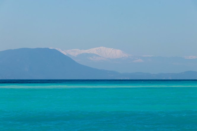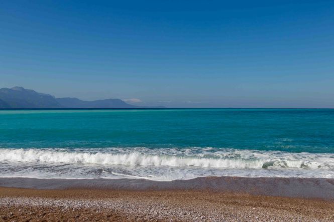 Nach einigen ersten Schlägen, wie wenn unser Schiff über ein Tau fahren würde, wie sie es gerne in Portugal über die Straße legen, ist die Überfahrt ruhig. Alleine die dauernd rauschende Klimaanlage mit der trockenen Luft stört. Fünf Minuten vor 6 Uhr werden wir wach, das erste Licht erscheint am Horizont und wir laufen in den Hafen von PIRÄUS ein. Unser Dicker ist hilflos von dicken Anhängern zugeparkt. Doch der unaufgeregte Einweiser lotst uns in aller Ruhe von Deck. Wir trinken im Hafen noch einen ersten Kaffee und fahren dann weiter an den uns schon bekannten Strand von PSATHA. Hellblau ist das Wasser weit hinaus in den GOLF VON KORINTH, die Wellen haben sich vom letzten Sturm noch nicht ganz erholt und schlagen heftig an den Kiesstrand. Über uns strahlt wieder einmal ein blauer Himmel, es weht nur ein leichtes Lüftchen und die Sonne wärmt wunderbar.