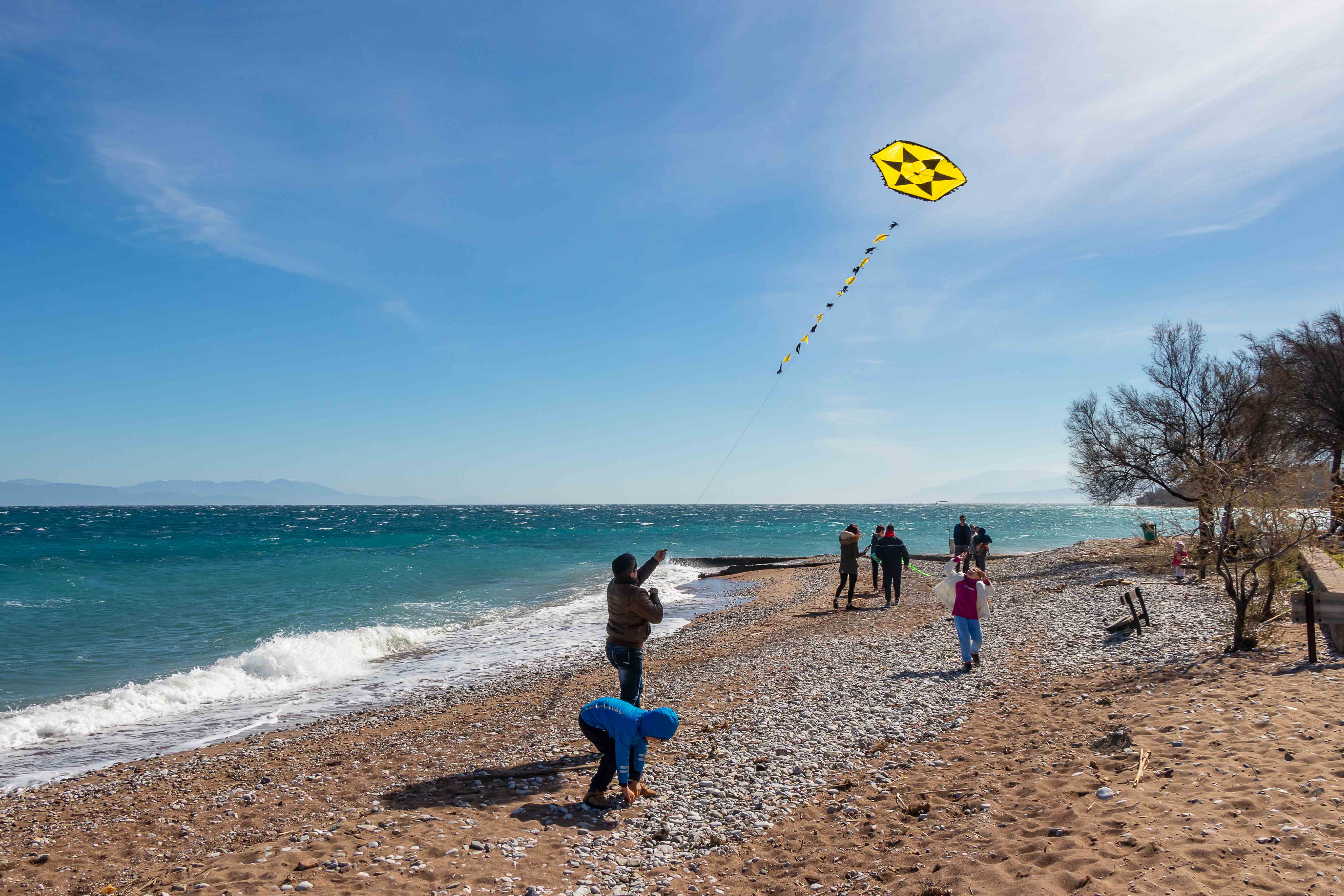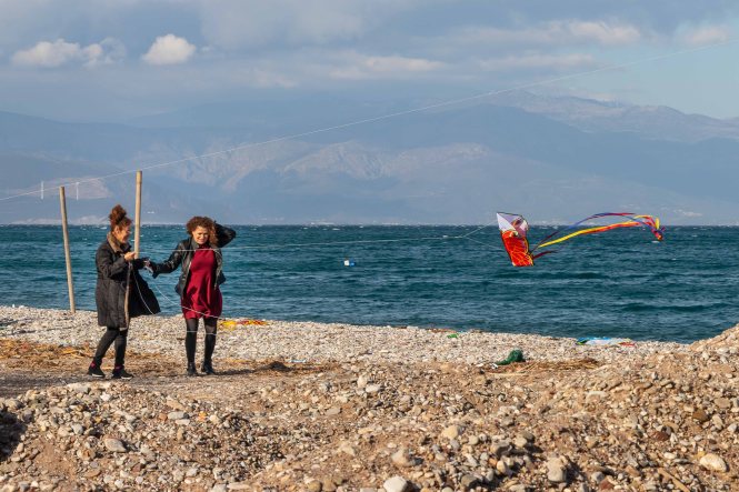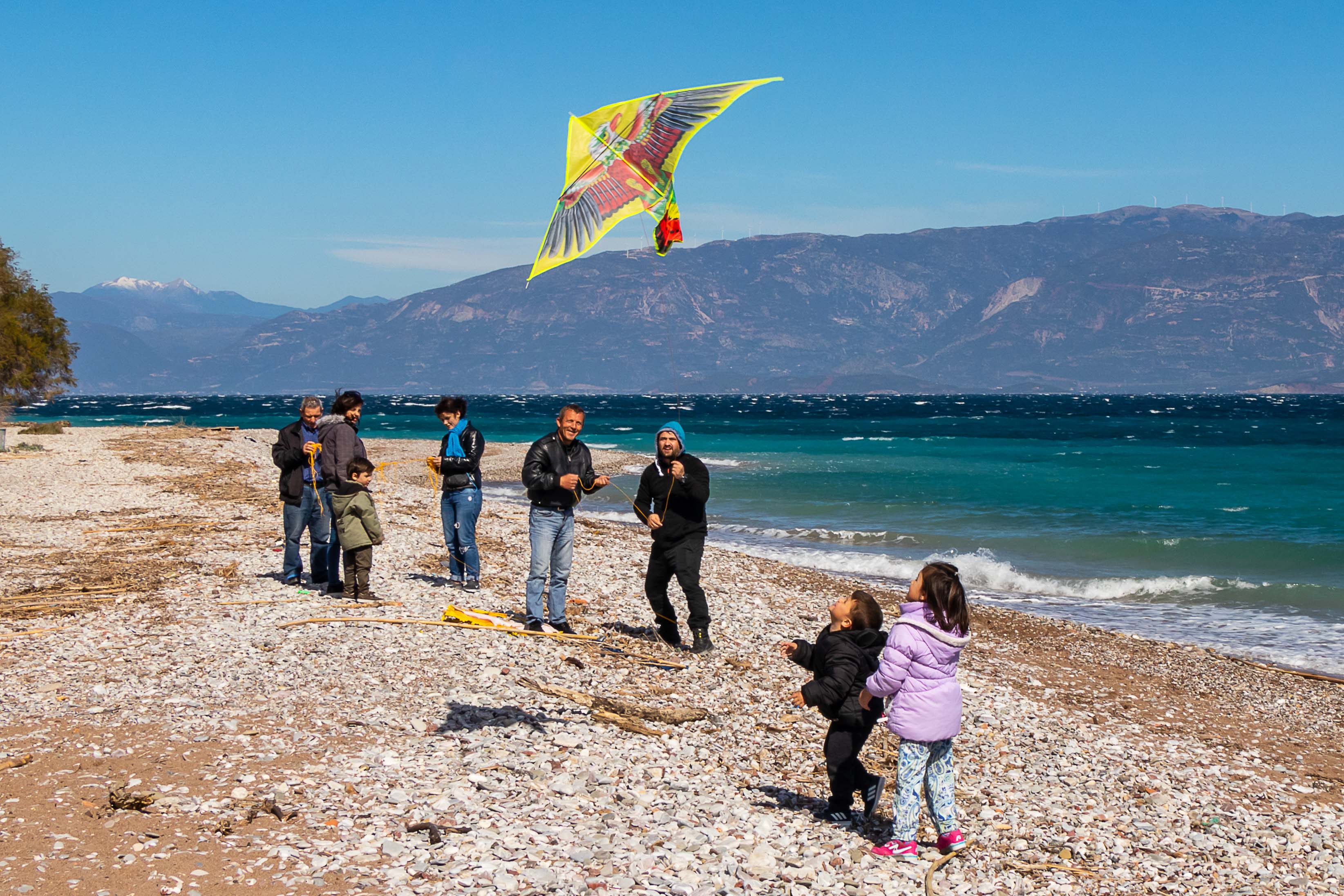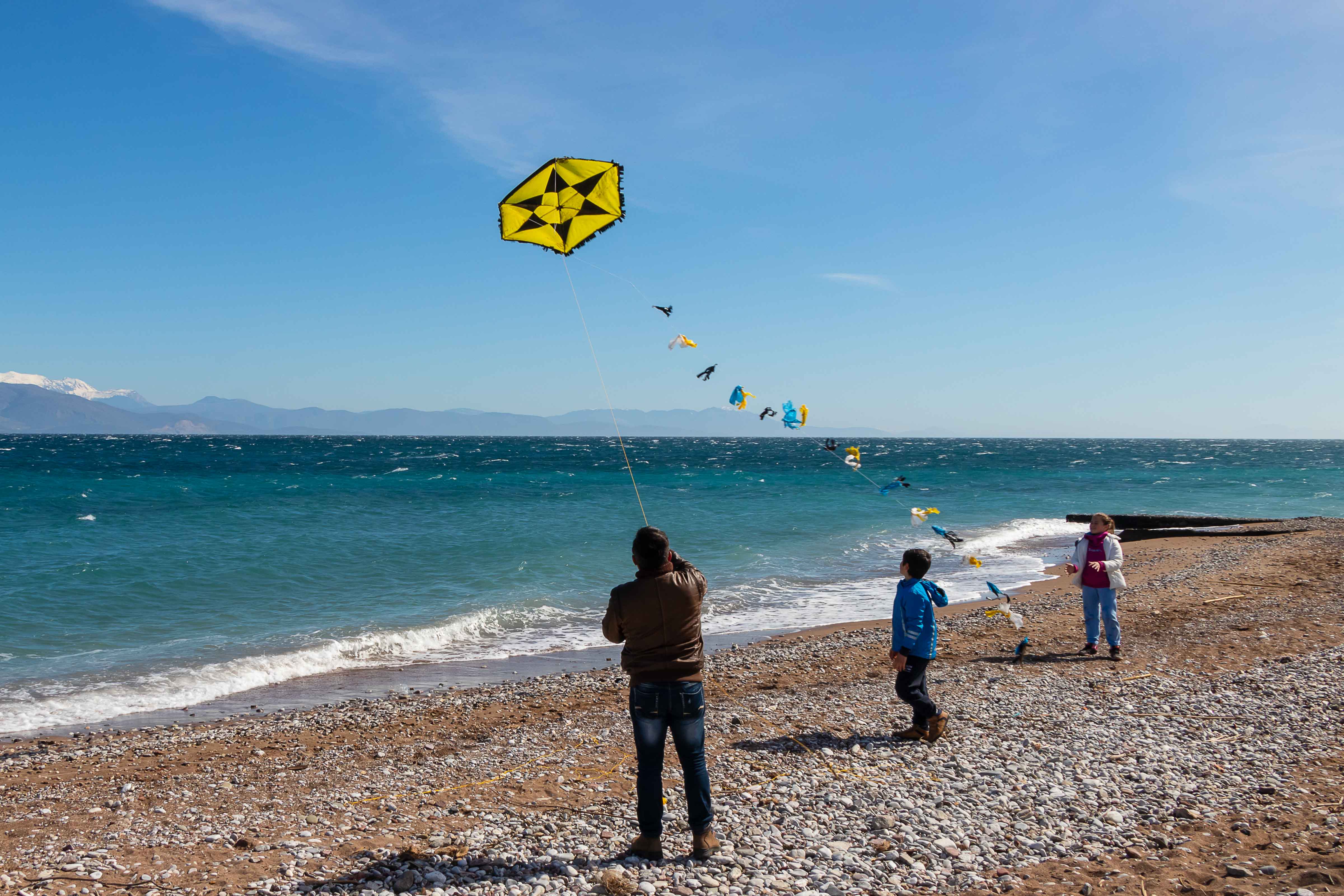 Am Rosenmontag (der Julianische Kalender ist in diesem Jahr ein Woche hinter unserem Gregorianischen Kalender) lassen die Griechen Drachen steigen. So haben sich an den Stränden viele Familien eingefunden, es ist wahrscheinlich auch ein arbeitsfreier Tag. Meist sind es dann die Väter, die mit mehr oder weniger Glück versuchen, die Drachen in die turbulente Luft zu bringen. Mit viel Eifer ziehen sie immer wieder an der Schnur, doch so mancher Drachen will nicht steigen und ist schon nach den ersten Versuchen ganz zerfleddert. Einige stehen hoch im Wind, bis der starke Westwind die Schnur zum Reißen bringt und der Drachen über das Wasser davon fliegt, andere landen in den Bäumen und lassen sich nicht mehr bergen. Jedenfalls haben die meisten viel Spaß, auch wenn mancher Vater ob seiner fehlgeschlagenen Versuche seine Laune am Sohn auslässt. Am Abend ist der Strand übersät mit den traurigen Gerippen der Drachen.