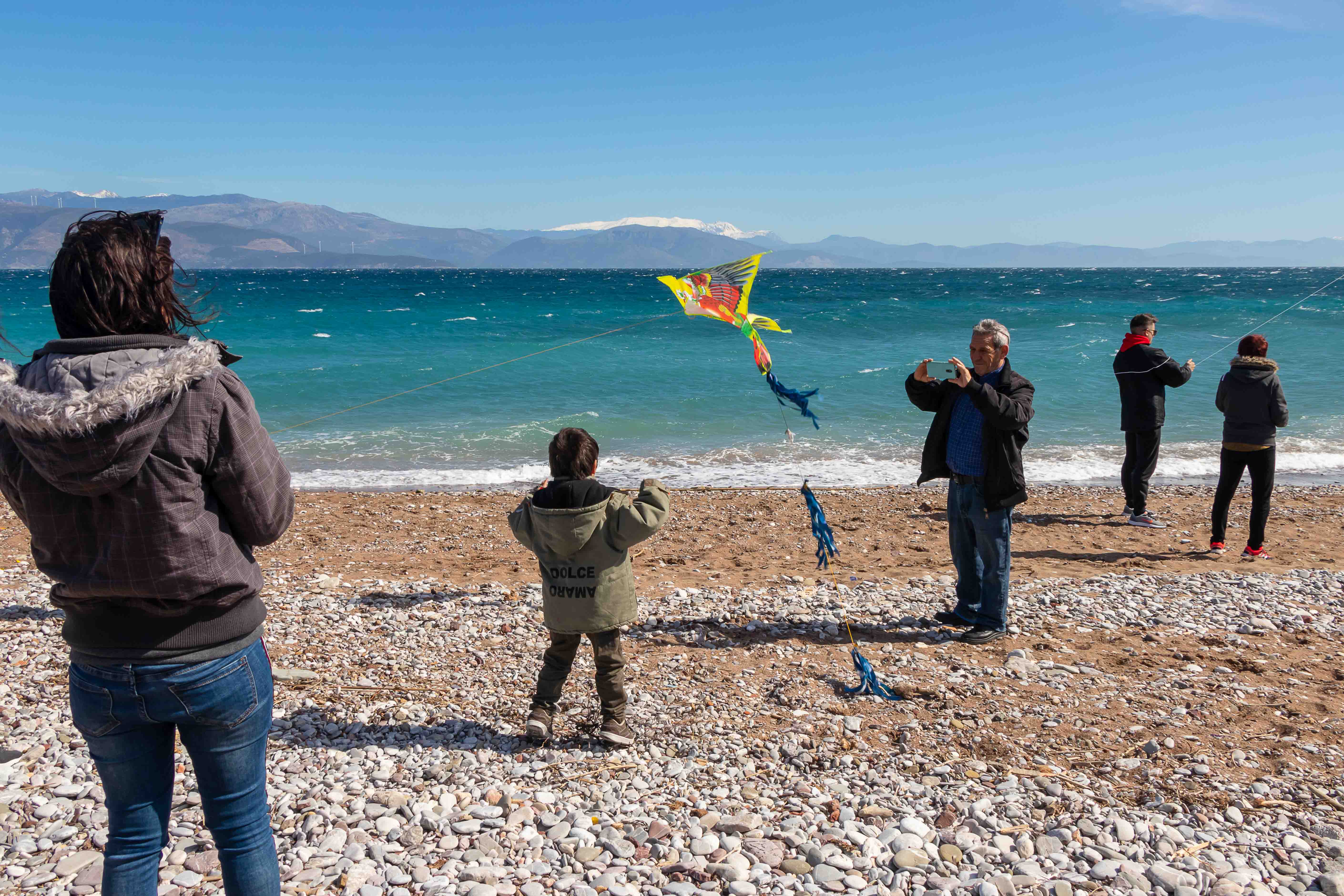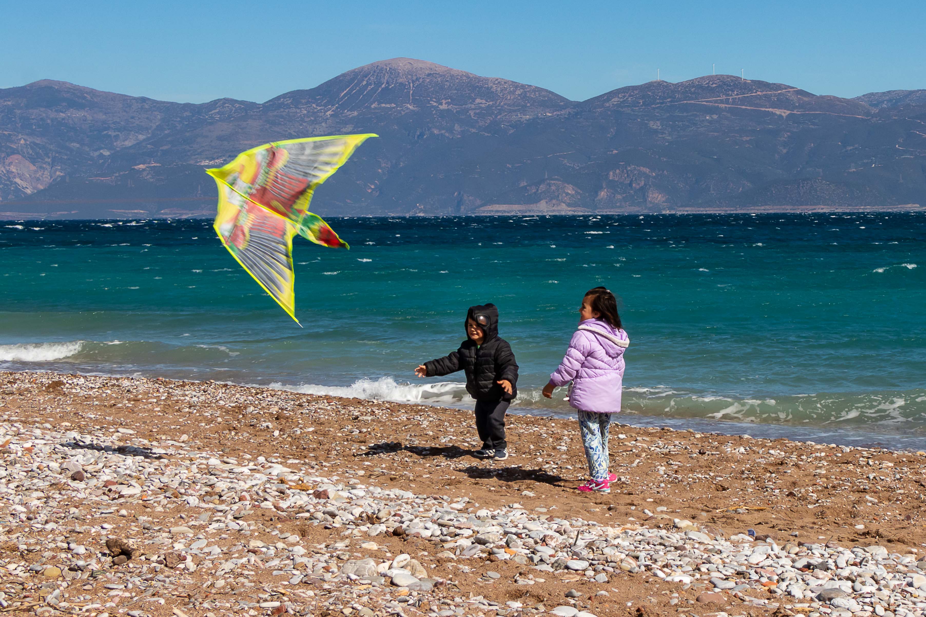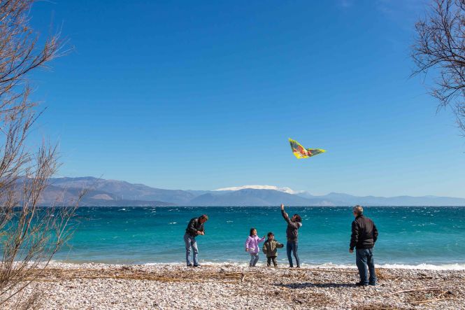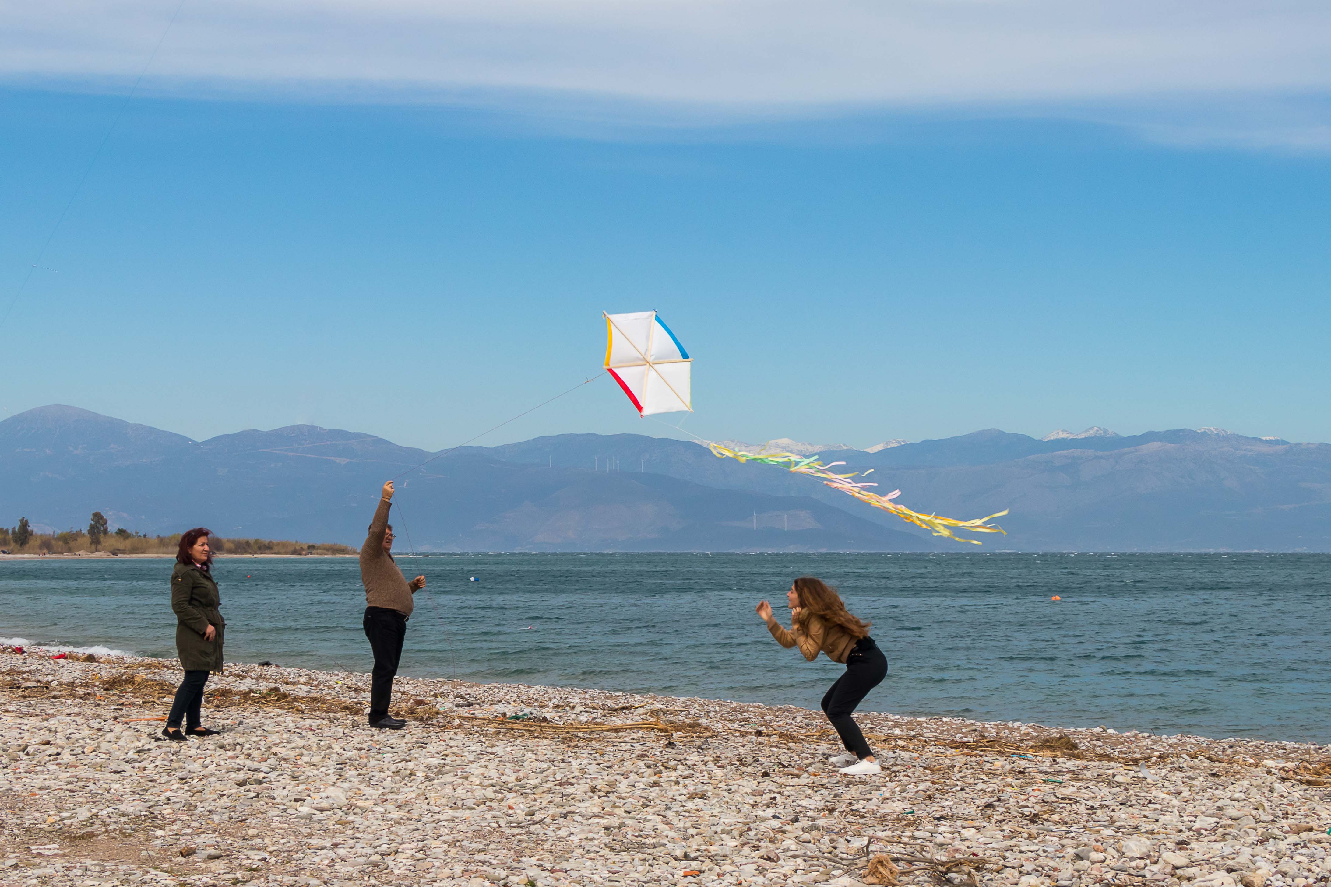 Am Rosenmontag (der Julianische Kalender ist in diesem Jahr ein Woche hinter unserem Gregorianischen Kalender) lassen die Griechen Drachen steigen. So haben sich an den Stränden viele Familien eingefunden, es ist wahrscheinlich auch ein arbeitsfreier Tag. Meist sind es dann die Väter, die mit mehr oder weniger Glück versuchen, die Drachen in die turbulente Luft zu bringen. Mit viel Eifer ziehen sie immer wieder an der Schnur, doch so mancher Drachen will nicht steigen und ist schon nach den ersten Versuchen ganz zerfleddert. Einige stehen hoch im Wind, bis der starke Westwind die Schnur zum Reißen bringt und der Drachen über das Wasser davon fliegt, andere landen in den Bäumen und lassen sich nicht mehr bergen. Jedenfalls haben die meisten viel Spaß, auch wenn mancher Vater ob seiner fehlgeschlagenen Versuche seine Laune am Sohn auslässt. Am Abend ist der Strand übersät mit den traurigen Gerippen der Drachen.