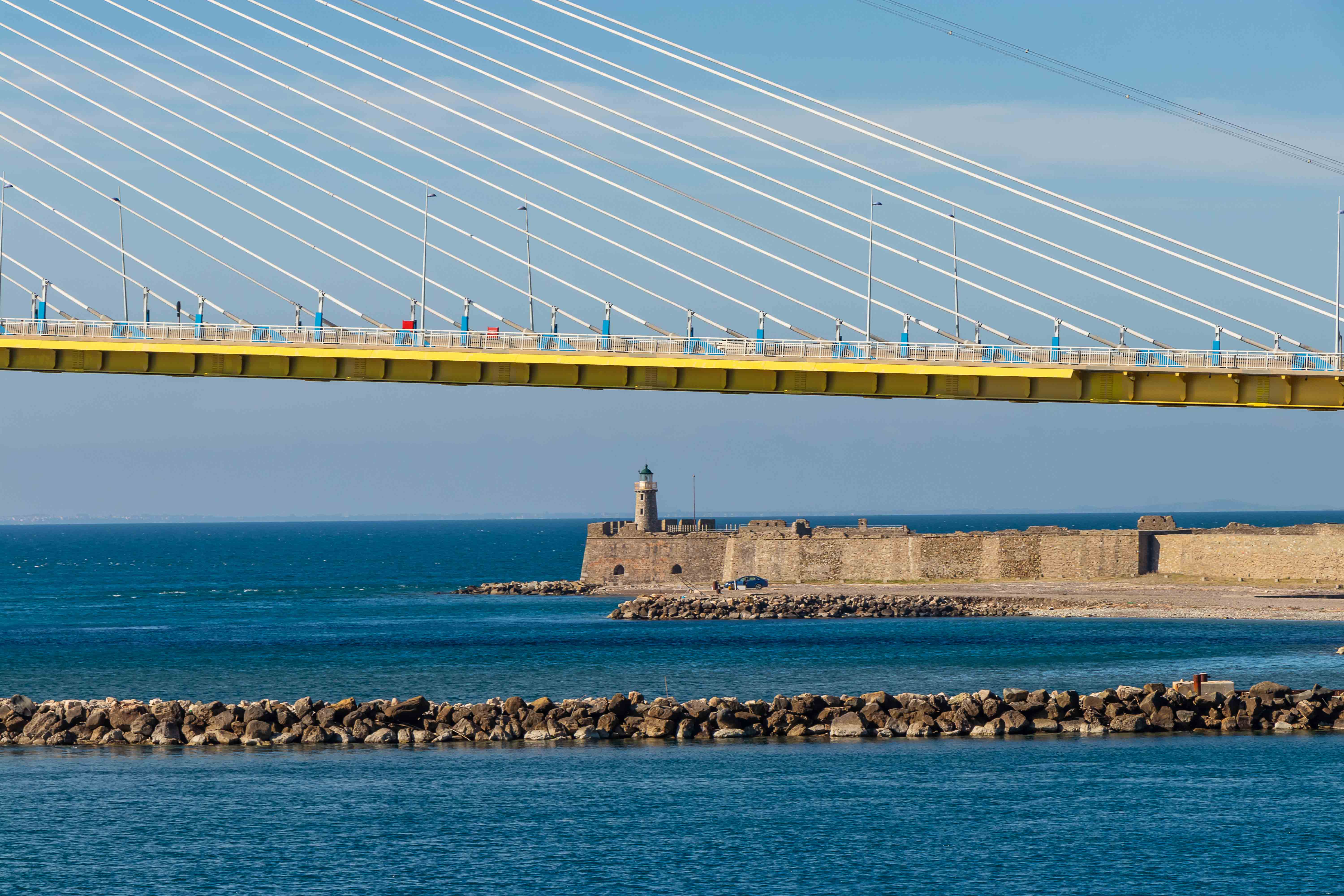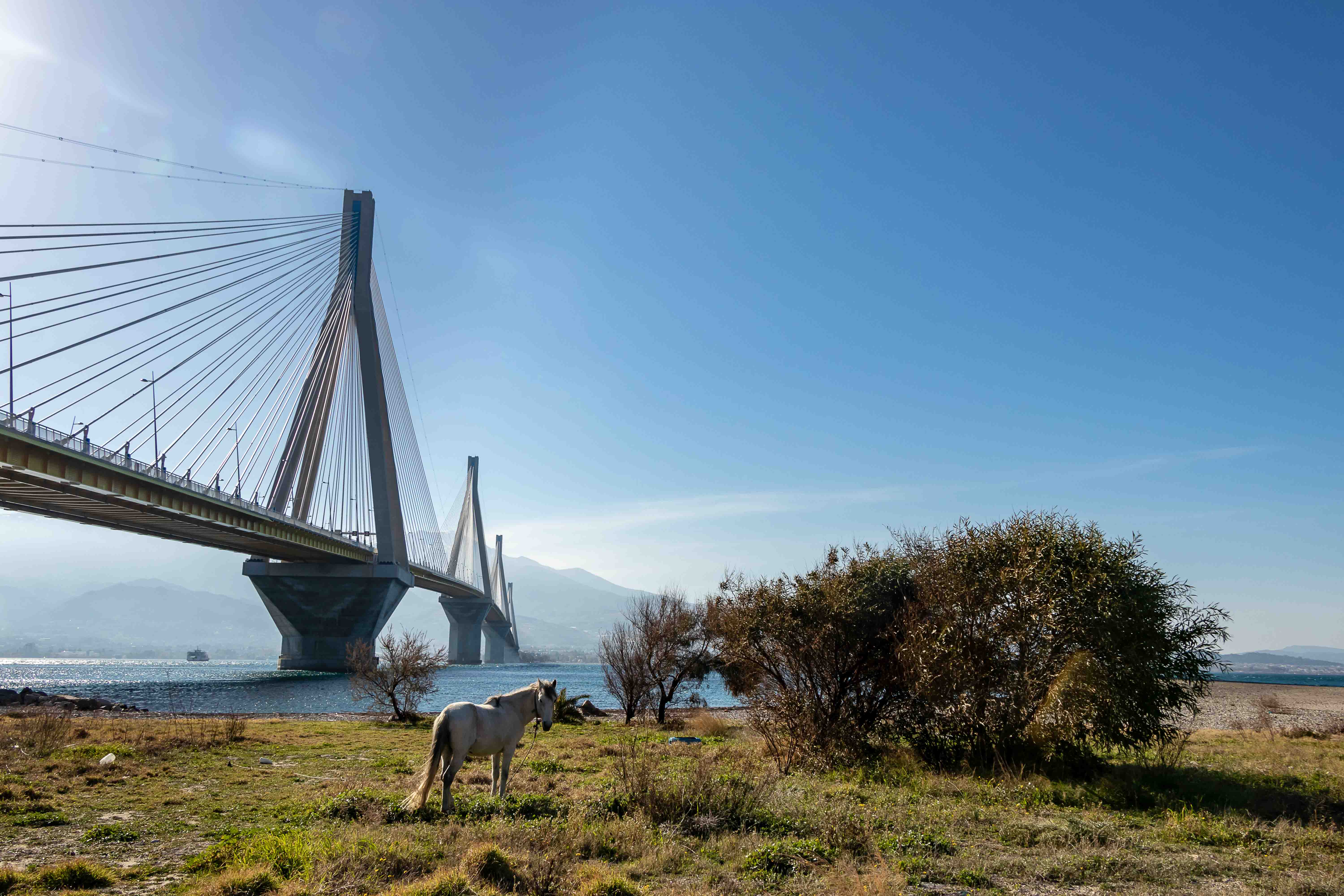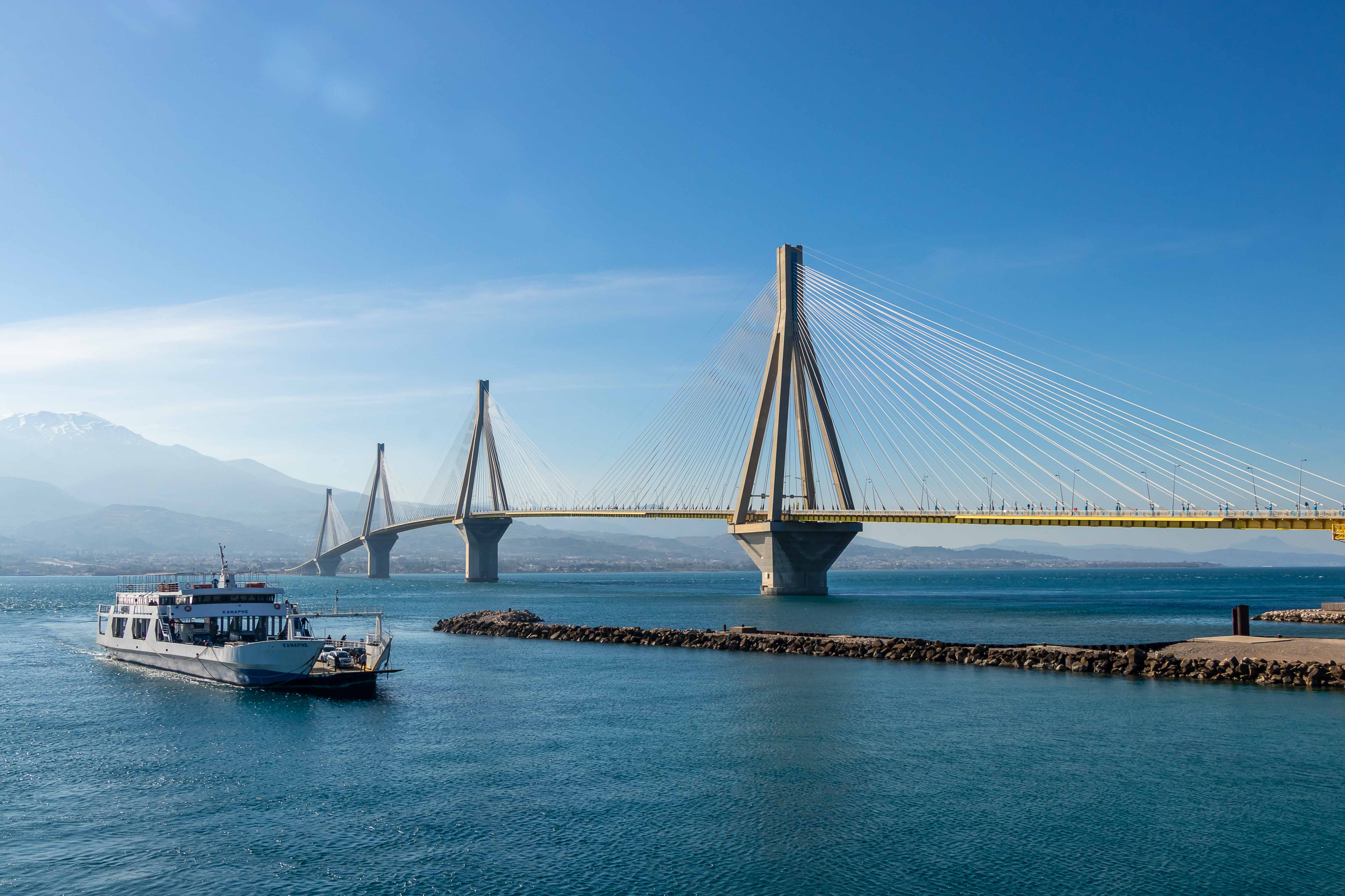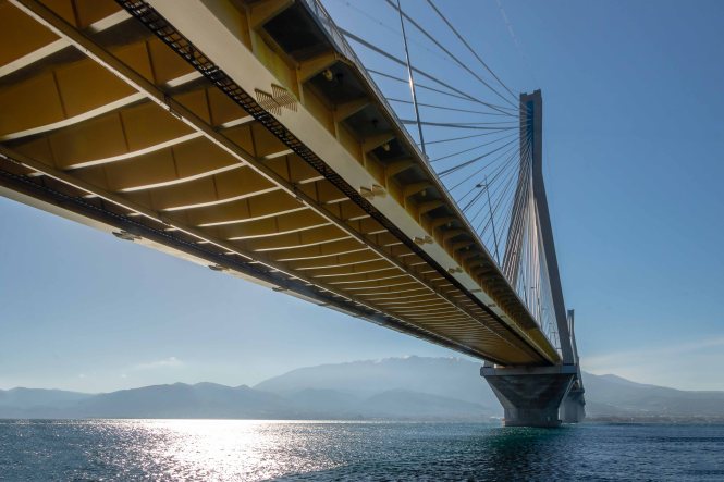 Eigentliche wollten wir eine kleine Runde über den PELOPONNES drehen, doch der viele Schnee in den Bergen und der starke Wind halten uns davon ab. So bleiben wir in ANTIRÍON am GOLF VON KORINTH und bestaunen die Eleganz der leicht geschwungenen Jahrhundertbrücke CHARÍLAOS TRIKOÚPIS. Schon im Jahre 1880 hatte der damalige Ministerpräsident Charilaos Trikoupis, deshalb auch der Name, die Idee einer Brücke an dieser Stelle. Doch die damaligen Techniker konnten die Schwierigkeiten nicht meistern. Das Wasser ist hier 65 m tief, es ist ein Erdbebengebiet und sowohl die Wasserströmungen als auch die Winde können stark sein. Noch 1992 hielt die griechische Ingenieurkammer eine Brücke für unmöglich. Bei Bohrungen konnte selbst in über 100 m Tiefe kein tragfähiger Fels gefunden werden; der Boden besteht aus Sand, Schlick und Geröll. Zahlreiche Erdbeben bis zur Stärke von 4,5 und das Auseinanderdriften von Peloponnes und Festland von mehreren Millimetern pro Jahr sorgten nicht gerade für Optimismus. Dennoch wurde das Projekt ausgeschrieben und ein französischer Konzern erhielt den Auftrag zum Bau der Brücke. Der erste Spatenstich erfolgte am 19.Juli 1998 und am 7. August 2004, noch rechtzeitig von den Olympischen Spielen in Athen, wurde sie eingeweiht. Otto Rehagel, der zuvor als Trainer die griechische Nationalmannschaft völlig überraschend zur Europameisterschaft führte, durfte mit der olympischen Fackel über die Brücke laufen.