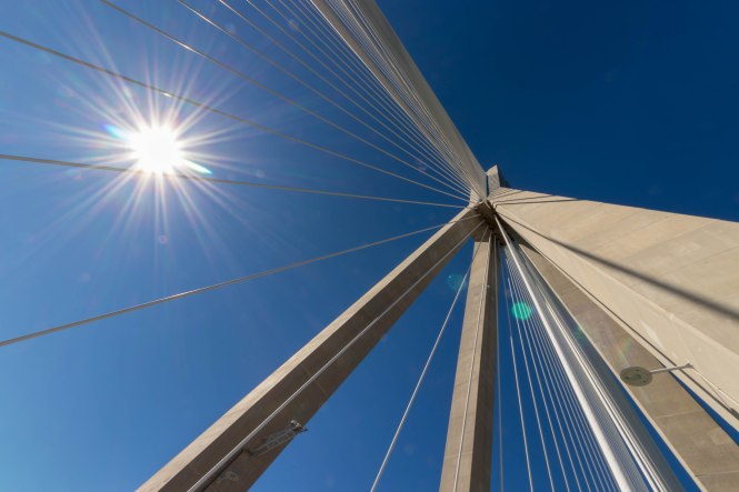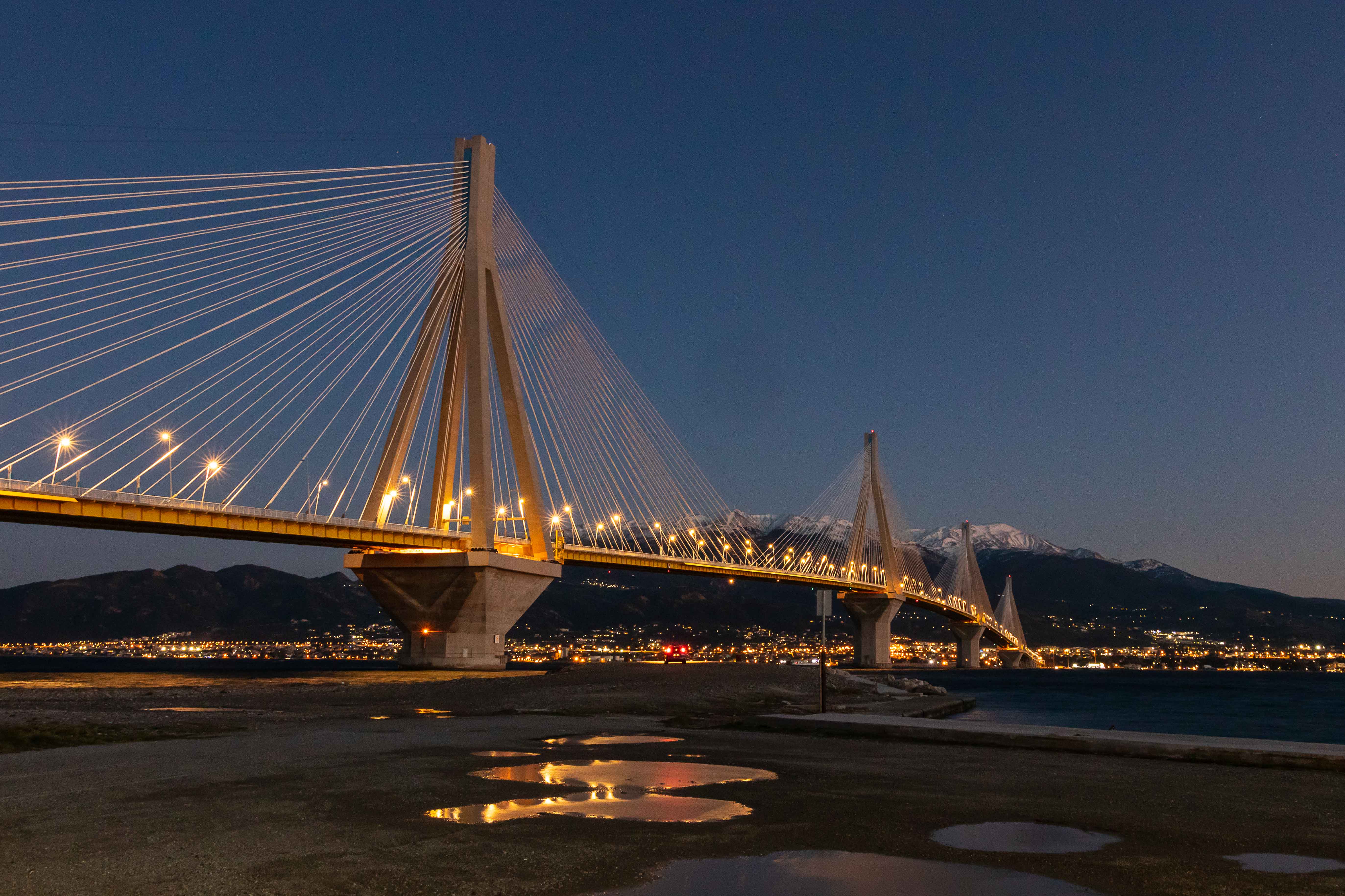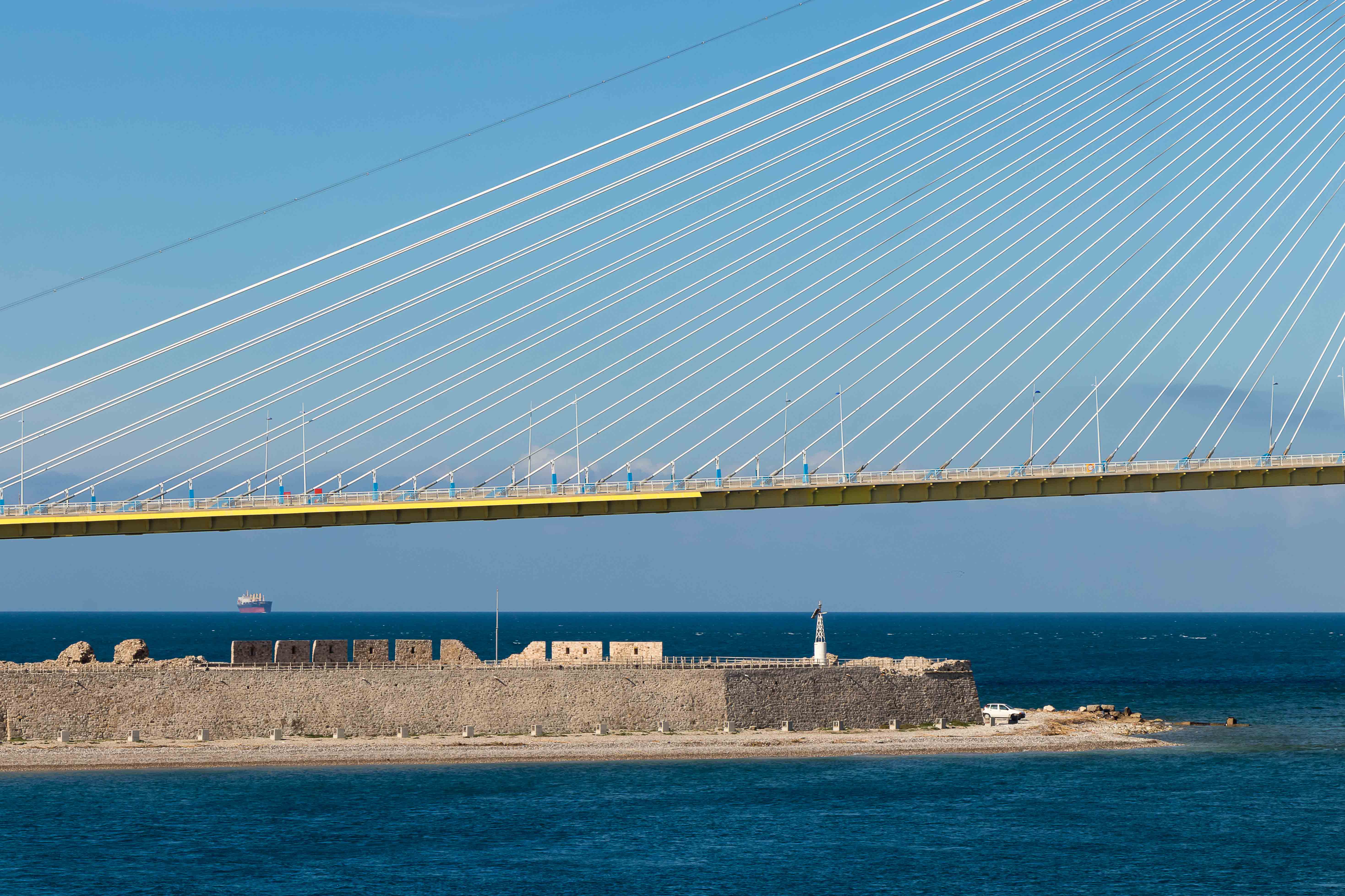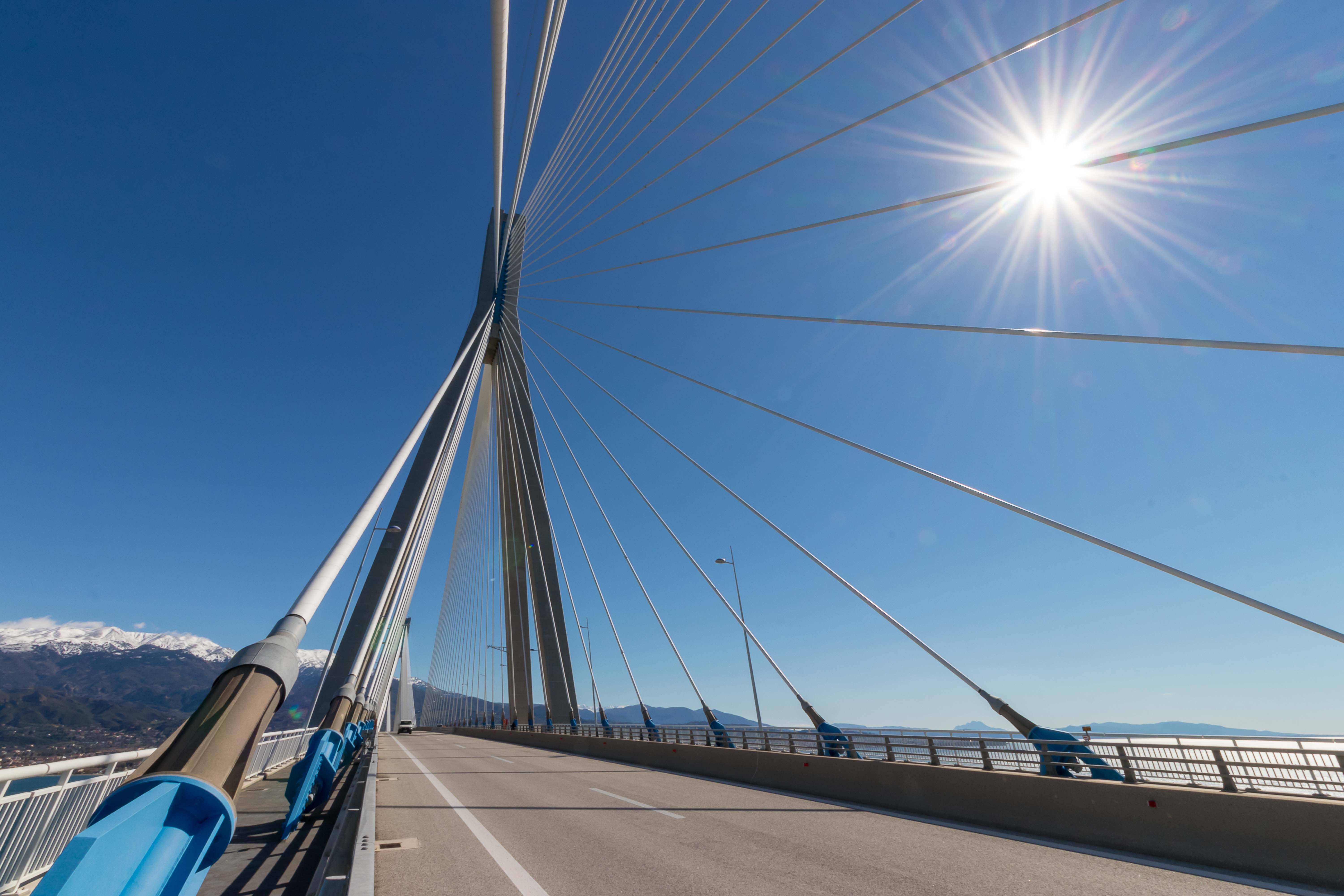 Eigentliche wollten wir eine kleine Runde über den PELOPONNES drehen, doch der viele Schnee in den Bergen und der starke Wind halten uns davon ab. So bleiben wir in ANTIRÍON am GOLF VON KORINTH und bestaunen die Eleganz der leicht geschwungenen Jahrhundertbrücke CHARÍLAOS TRIKOÚPIS. Schon im Jahre 1880 hatte der damalige Ministerpräsident Charilaos Trikoupis, deshalb auch der Name, die Idee einer Brücke an dieser Stelle. Doch die damaligen Techniker konnten die Schwierigkeiten nicht meistern. Das Wasser ist hier 65 m tief, es ist ein Erdbebengebiet und sowohl die Wasserströmungen als auch die Winde können stark sein. Noch 1992 hielt die griechische Ingenieurkammer eine Brücke für unmöglich. Bei Bohrungen konnte selbst in über 100 m Tiefe kein tragfähiger Fels gefunden werden; der Boden besteht aus Sand, Schlick und Geröll. Zahlreiche Erdbeben bis zur Stärke von 4,5 und das Auseinanderdriften von Peloponnes und Festland von mehreren Millimetern pro Jahr sorgten nicht gerade für Optimismus. Dennoch wurde das Projekt ausgeschrieben und ein französischer Konzern erhielt den Auftrag zum Bau der Brücke. Der erste Spatenstich erfolgte am 19.Juli 1998 und am 7. August 2004, noch rechtzeitig von den Olympischen Spielen in Athen, wurde sie eingeweiht. Otto Rehagel, der zuvor als Trainer die griechische Nationalmannschaft völlig überraschend zur Europameisterschaft führte, durfte mit der olympischen Fackel über die Brücke laufen.