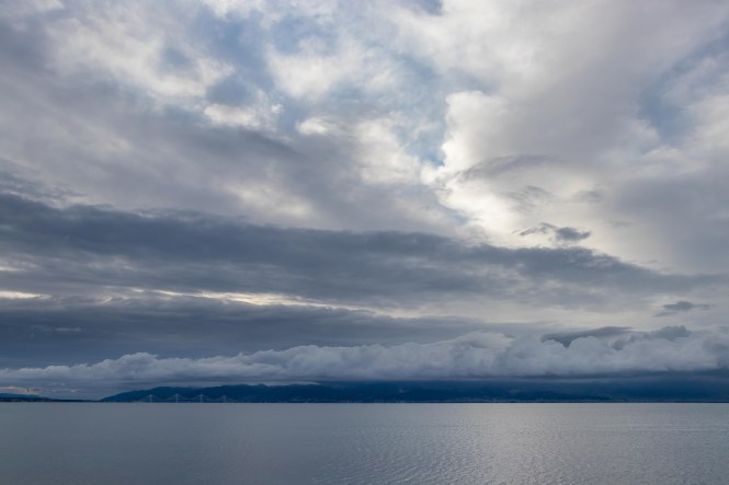 Wir bleiben noch einen Tag am Eingang zum GOLF VON KORINTH, über den sich in der Ferne die elegante Brücke spannt. Über die schneebedeckten Berge der PELOPONNES ziehen dicke Wolken, doch bis auf ein paar verirrte Regentropfen bleibt es trocken.