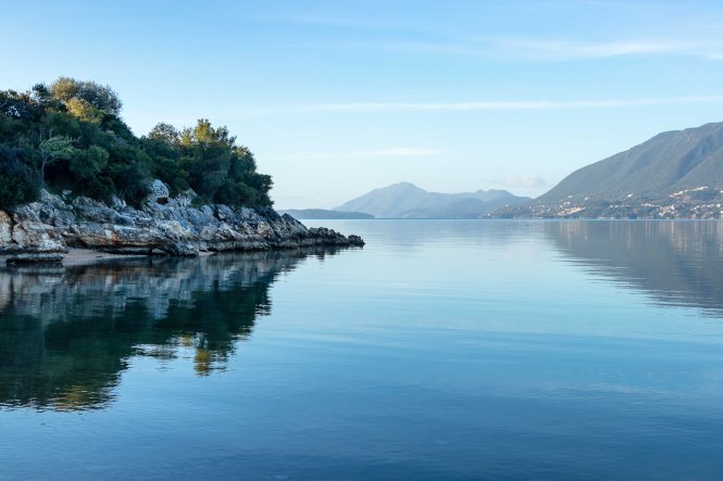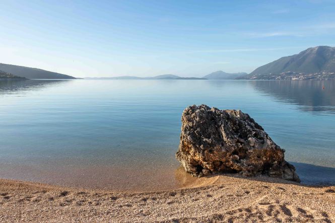 Gegenüber von LÉFKADA lädt uns in der Nähe von PLAGIÁ ein versteckter Strand zum Bleiben ein. Am Morgen und am Abend ist es fast windstill, das Meer ohne eine Welle spiegelglatt. Nur am Tag weht unter blauem Himmel eine leichte, angenehme Brise. Das sind genaue die Temperaturen, die wir mögen. Lediglich das Wasser könnte ein paar Grad wärmer sein.