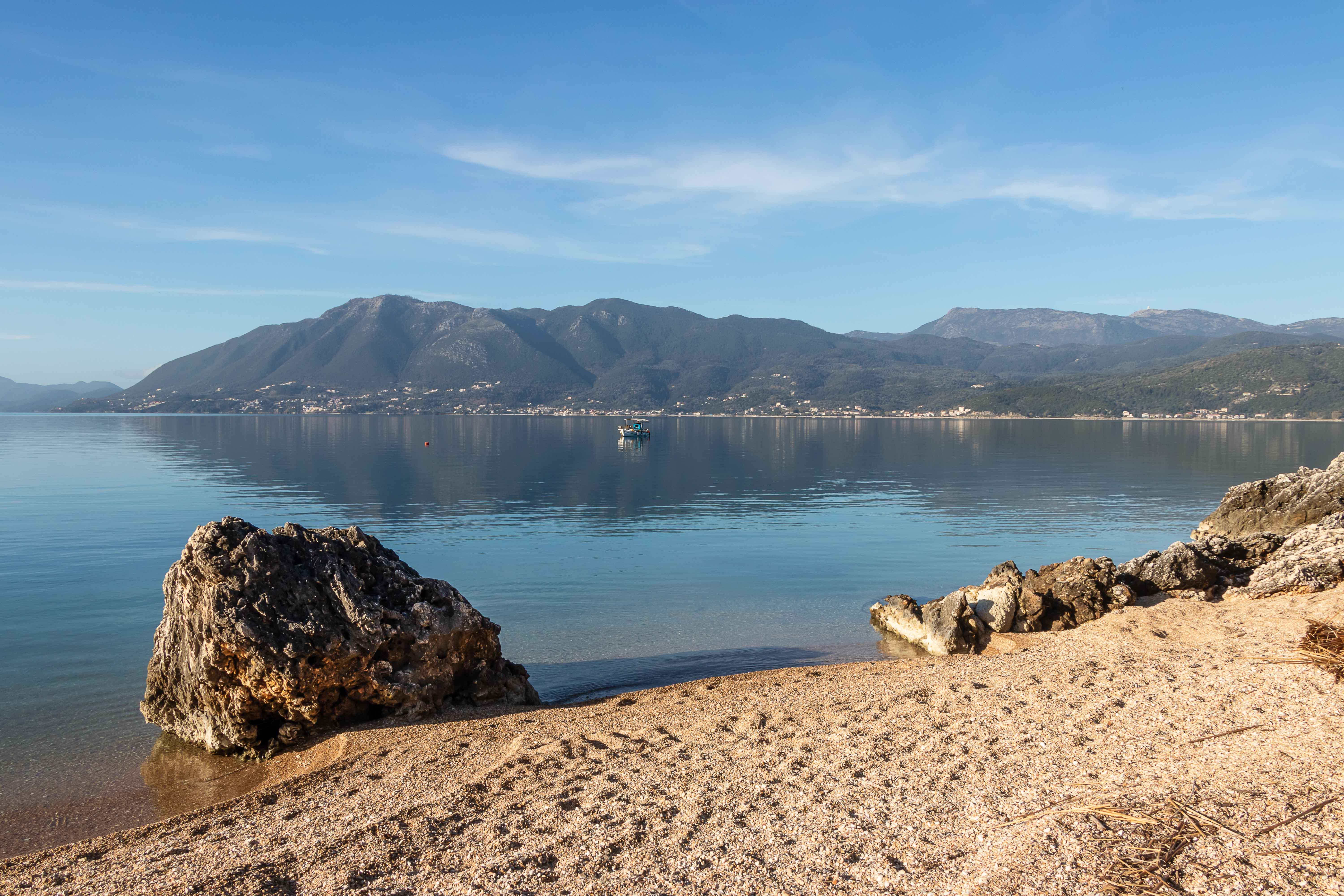 Gegenüber von LÉFKADA lädt uns in der Nähe von PLAGIÁ ein versteckter Strand zum Bleiben ein. Am Morgen und am Abend ist es fast windstill, das Meer ohne eine Welle spiegelglatt. Nur am Tag weht unter blauem Himmel eine leichte, angenehme Brise. Das sind genaue die Temperaturen, die wir mögen. Lediglich das Wasser könnte ein paar Grad wärmer sein.