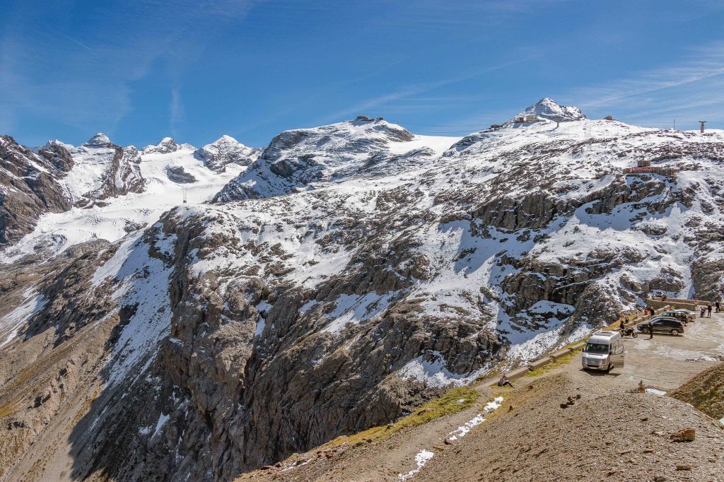Peter will unbedingt über das STILFSER JOCH. So wuchten wir den Dicken auf den knappen 30 km durch 48 steile Kehren hinauf auf 2757 m s.l.m. Wegen der erwarteten nächtlichen Kälte bleiben wir nur für einen kurzen Halt auf der Passhöhe.