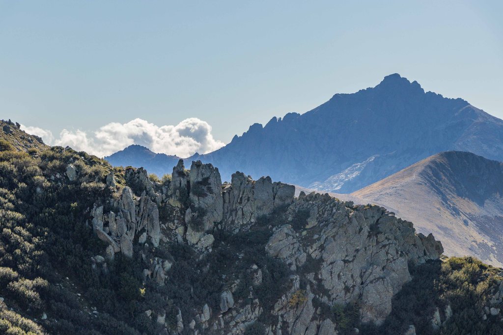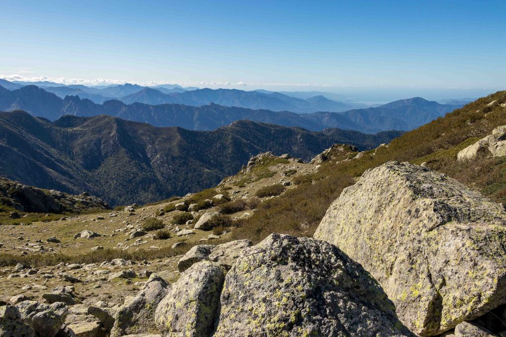 Das Wetter ist heute wieder traumhaft, fürs Fotografieren ist der blauer Himmel zwar langweilig, doch fürs Wandern natürlich bestens. Wir fahren ein Stück in das RESTONICA-TAL hinein, überall ist das Übernachten verboten, und bleiben nach einer kurzen Erkundungsrunde letztendlich fast am Taleingang stehen. Peter nimmt den Roller und fährt die 13 km hinauf zur BERGERIE DE GROTTELLE, dem Ausgangspunkt der Wanderung. Gemütlich geht es auf breitem Weg los, die Bergspitzen leuchten schon in der Sonne. Über zwei Leitern sind von Gletschern glatt geschliffene Felsen zu überwinden. Nach einer Stunde liegt vor mir der MELOSEE, noch halb im Schatten der mächtigen Berge. Die Bäume haben hier oben schon ihr buntes herbstliches Kleid angelegt. Über grüne Weiden, noch mit etwas Raureif überzogen, und durch niedriges Erlengestrüpp erklimme ich die 2052 m ü.d.M liegende BOCCA A SOGLIA und komme zum GR 20. Erinnerung an die zwei Wochen auf dieser Wanderung werden wach. Ein Norweger kommt mir entgegen und wir schwärmen beide von der Tour. Vom Grat tut sich der Blick in die südlichen Bergketten und den GOLF VON AJACCIO auf. Eine Stunde genieße ich im gemütlichen Auf und Ab des Weitwanderwegs die fantastische Aussicht. Bei der BRECCHE DU CAPITELLU verlasse ich den GR 20 und steige über viel Blockschutt hinunter zum LAC DU CAPITELLU. Auf einem der vielen rund geschliffenen Felsen lasse ich mir das Vesper und eine Dose Bier schmecken. Vorbei an vielen Wanderern komme ich noch einmal zum MELOSEE, der nun in der Sonne liegt. Trotz des klaren Wassers wage ich keinen Schwumm, hier auf über 1700 m ü.d.M. ist es trotz Sonne selbst in der Luft richtig frisch. Schon etwas müde von den vielen Höhenmetern und voller Eindrücke laufe ich die letzten Meter auf dem gleichen Weg zurück zur BERGERIE DE GROTTELLE. Mittlerweile hat sich der Parkplatz am Ende des Tales gefüllt, selbst die schon enge Straße ist auf dem letzten Kilometer völlig zugeparkt. Gut, dass ich mit dem Roller zurückfahren kann. Mit jedem Meter wird es auch wieder wärmer.