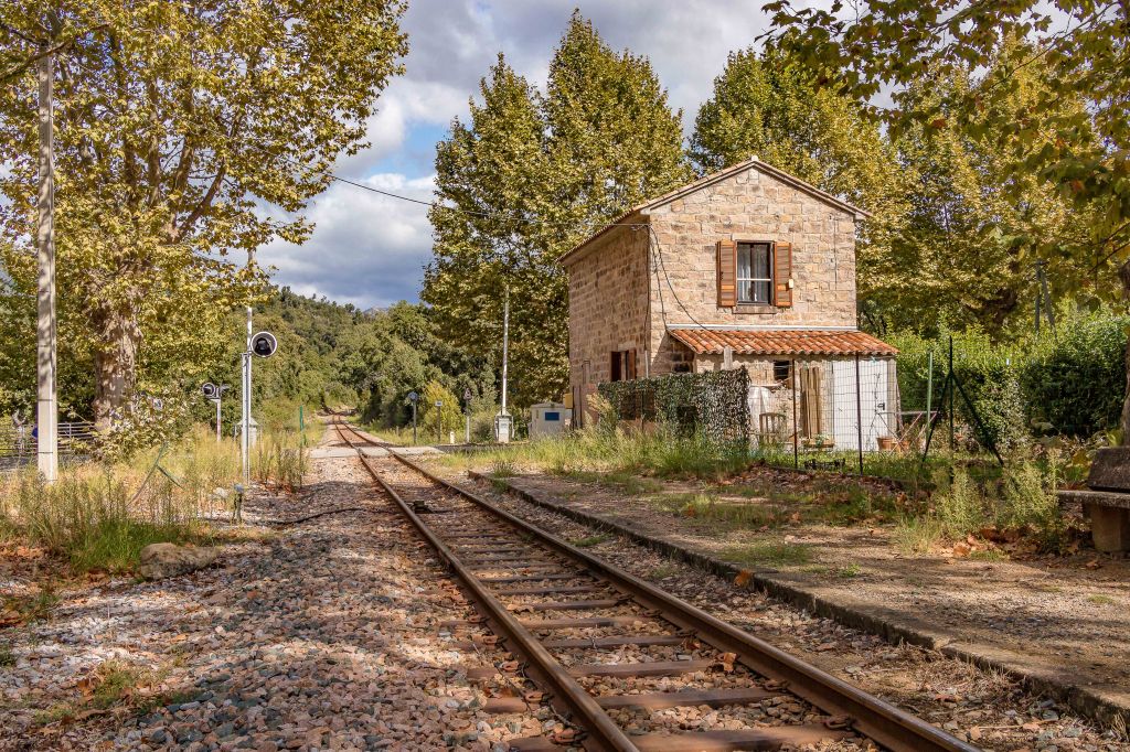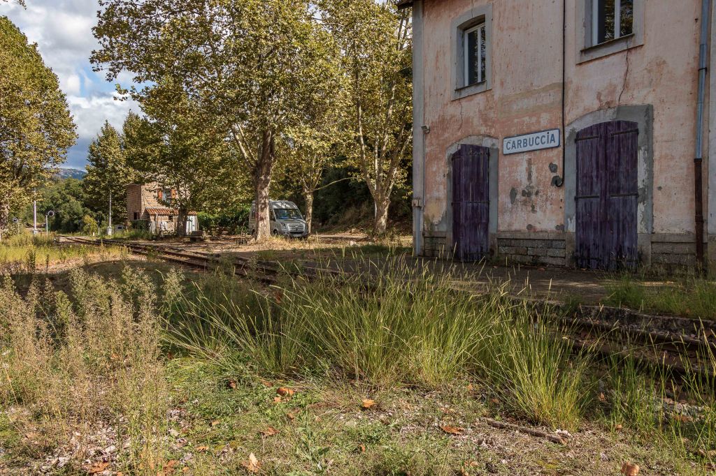 Auf der anderen Seite des Passes erspähen wir erste blaue Flecken am Himmel. Wir suchen nicht lang und parken für den Rest des Tages am Bahnhof von CARBUCCIA unter mächtigen Platanen, die noch heftig im Wind schwanken. Ab und zu kommt laut brummend einer der modernen Diesel-Treibwagen vorbei. Als Peter auf der Bank sitzt, bremst er sogar, vielleicht hätte er zum Anhalten nur den Daumen raus strecken müssen. Gegen Abend beruhigt sich das Wetter. Ein Abschleppwagenfarmer brüllt uns noch ein: „no camping“ zu, doch dann ist es ruhig.