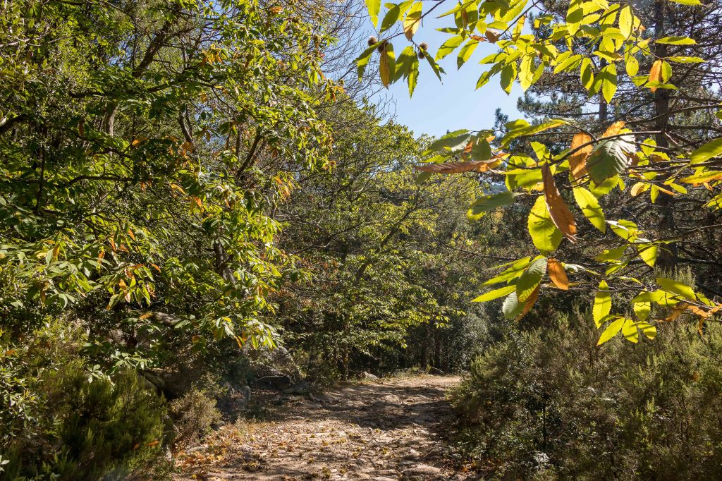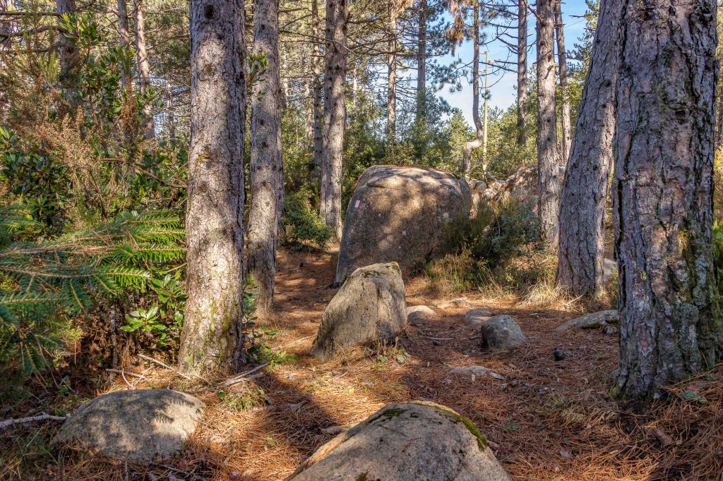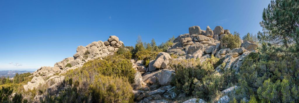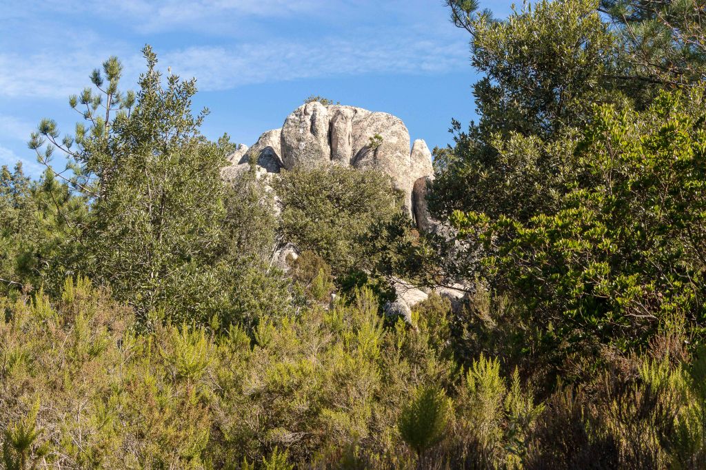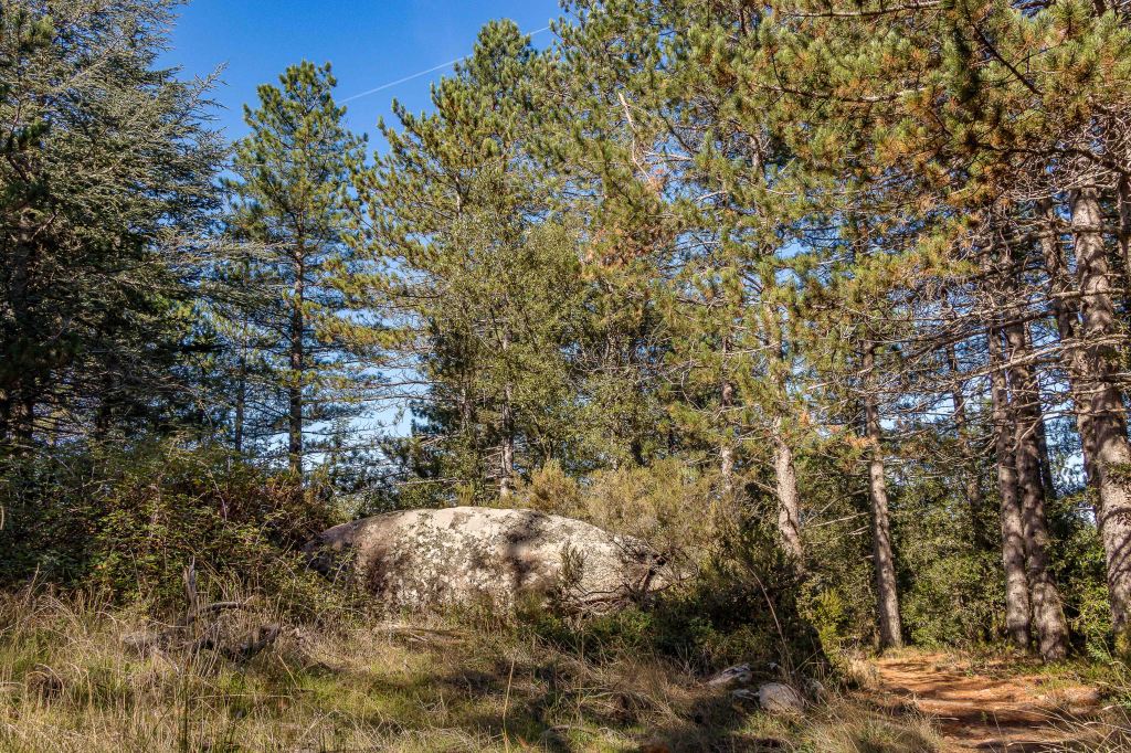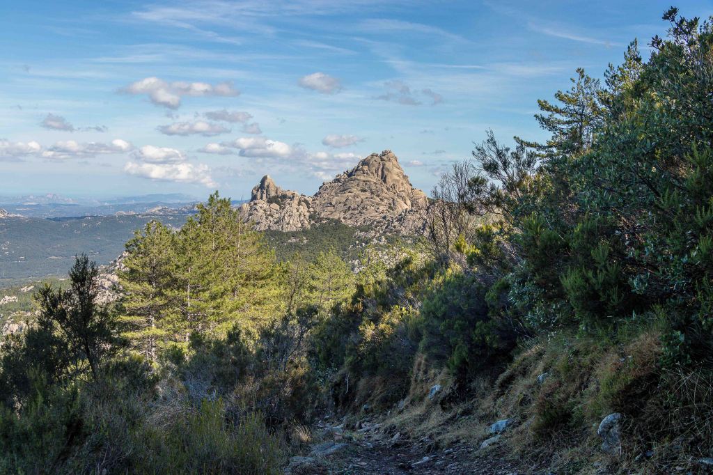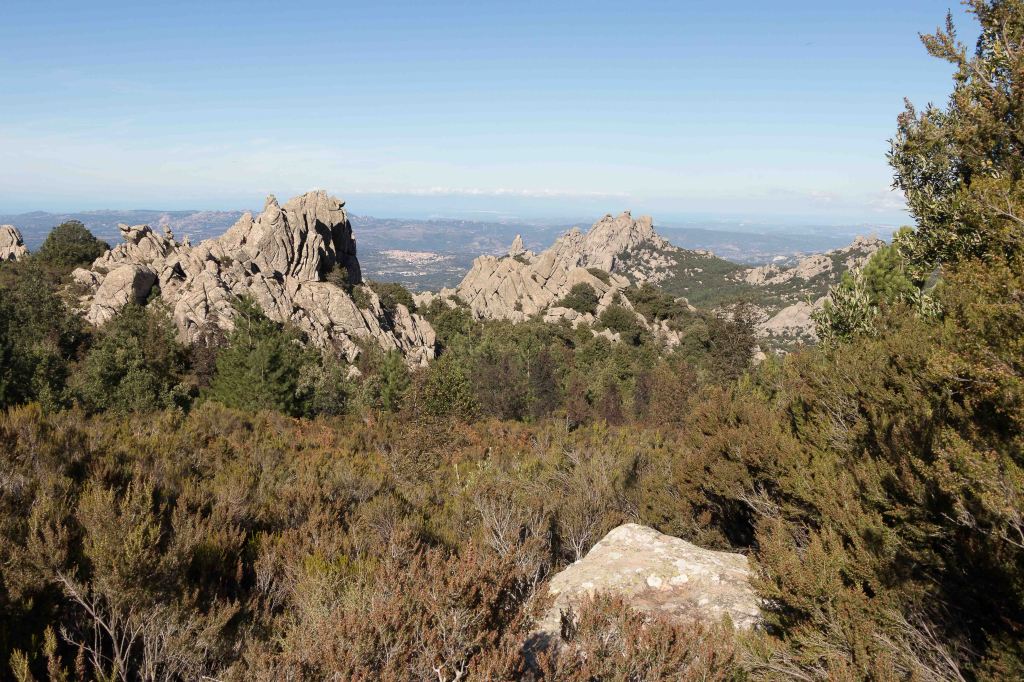 Wir umrunden AGGIUS auf einer Strada Panoramica, fahren weiter nach TEMPIO PAUSANIA und folgen der steilen kurvenreichen Straße hinauf nach VALLICCIOLA auf über 1000 m ü.d.M. Ein großer Sosta Camper (alle Versorgungseinrichtungen außer Betrieb, nachts ist der Platz jedoch gut beleuchtet) liegt am Fuße des, mit etwas über 1300 m ü.d.M., höchsten Gebirgszugs Nordsardiniens, dem MONTE LIMBARA. Peter macht sich auf den Weg, der durch einen prächtigen Wald mit Kiefern, Tannen, Pinien und Steineichen führt. Dazwischen liegen verstreut Granitfelsen wie Hinkelsteine. Überall haben Wildschweine den Boden aufgebrochen; Obelix würde es hier bestimmt gut gefallen, waren auch zeitweise die Römer hier. Ab und zu gibt der Wald den Blick frei auf den Norden Sardiniens, im Dunst ist sogar die weiße Küste von BONIFACIO zu sehen. Zurück geht es, vorbei an der mit Masten gespickten PUNTA BANDIERA und der PUNTA GJUCANTINU, auf der Rückseite des Gebirgsmassives. In sanften Wellen durchziehen die Berge die Insel, ganz anders als die hoch aufragenden schroffen Berge Korsikas. In der Luft liegt eine angenehme herbstliche Frische, gewürzt mit dem Geruch des Nadelwaldes.