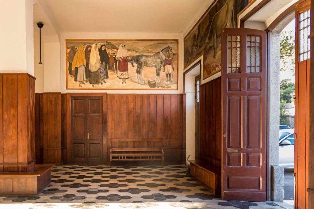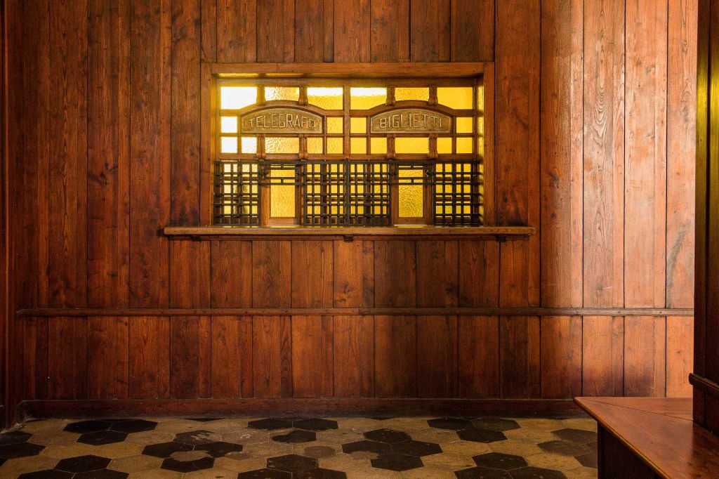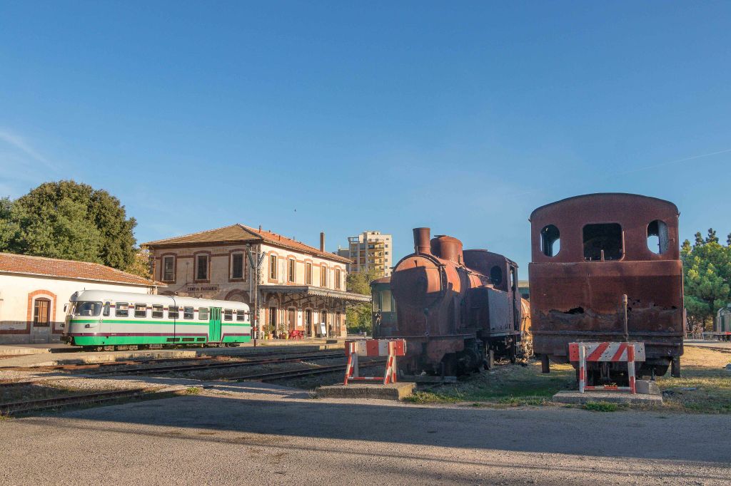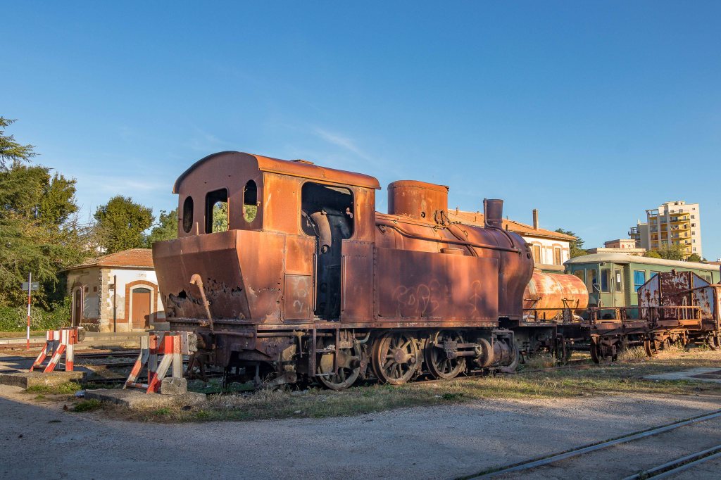 Die Nacht war trotz der Höhe wieder einmal überraschend warm; am Morgen zeigt das Thermometer immer noch 100 C an. Wir schlängeln uns die vielen engen Kurven wieder hinunter nach TEMPIO PAUSANIA und besuchen den alten Bahnhof. Die Wartehalle ist denkmalgeschützt und liebevoll ausgestaltet. Neben den Fahrkarten konnte man hier auch Telegramme aufgeben. An den Wänden hängen Bilder mit typischen Dorfszenen, gemalt von Guiseppe Biasi, der als einziger nennenswerter Repräsentant zeitgenössischer sardischer Malerei gilt. Der Capo Stazione hatte natürlich seinen eigenen Eingang. Auf den Bahnsteigen stehen ein paar alte, nunmehr ausgediente Lokomotiven und ein Triebwagen; die Dampfloks sind vom Rost zerfressen. Nur in der Touristenzeit fahren am Wochenende ein paar Züge, den täglichen Transport haben die schnelleren Busse übernommen.