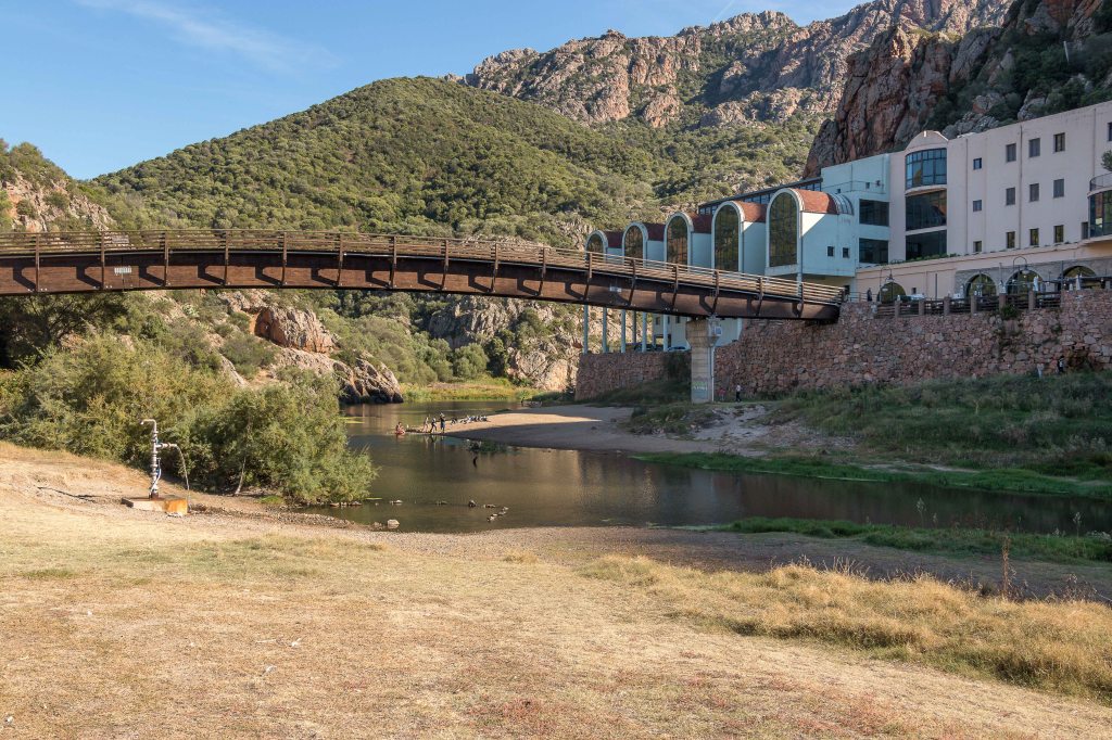 Dann freuen wir uns auf ein Bad im warmen Wasser. Doch die TERME DI CASTELDORIA bietet nur trübes Wasser in Knietiefe. Da verzichten wir lieber und genießen den herrlichen Tag im Schatten eines Olivenbusches. Einige Sarden lassen sich dennoch von einem Bad nicht abhalten und beschmieren sich zudem noch mit dem angeblich heilsamen Schlamm des Flusses.