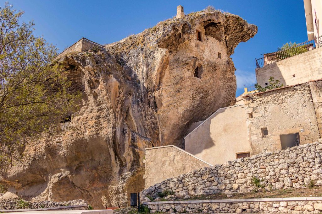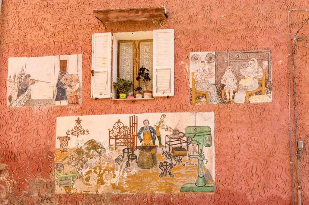 Der Weiterweg ist etwas schwierig: alle Straßen nach SEDINI sind wegen Bauarbeiten gesperrt. Doch wir erinnern uns an eine Straße, die aus unerfindlichen Gründen bereits vor fünf Jahren gesperrt war. Die Sperren und Hinweisschilder einer Sackgasse stehen zwar immer noch, aber Autos kommen uns entgegen, also wagen auch wir die Strecke, und die Sperrung ist immer noch ohne Grund. In SEDINI drehen wir eine Runde durch das Dorf. Kein Mensch ist in den engen Gassen unterwegs (die Bewohner machen sich wohl für ein Leichenprozession zurecht, die wir später dem Friedhof zustreben sehen), die Häuser wirken unpersönlich, die Ortschaft kühl und abweisend. Nur ein paar blumenumrankte Eingänge lockern das Gesamtbild etwas auf. Wir sehen erste Wandbilder; eine Frau schießt auf zwei streitende Frauen. Geht es um einen Mann? In der Dorfkirche entdecken wir einen gar merkwürdigen Engel, die ja sonst immer geschlechtsneutral dargestellt werden. Hier ist DER Engel vom Künstler deutlich herausgestellt. Am Weg zu unserem Übernachtungsplatz erhebt sich LA ROCCA, ein ausgehöhlter Kalkfelsen, der als Grabstätte, Gefängnis und zuletzt als Wohnung diente.