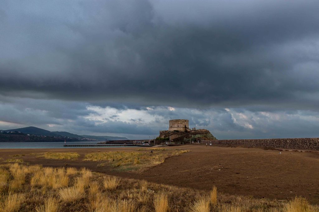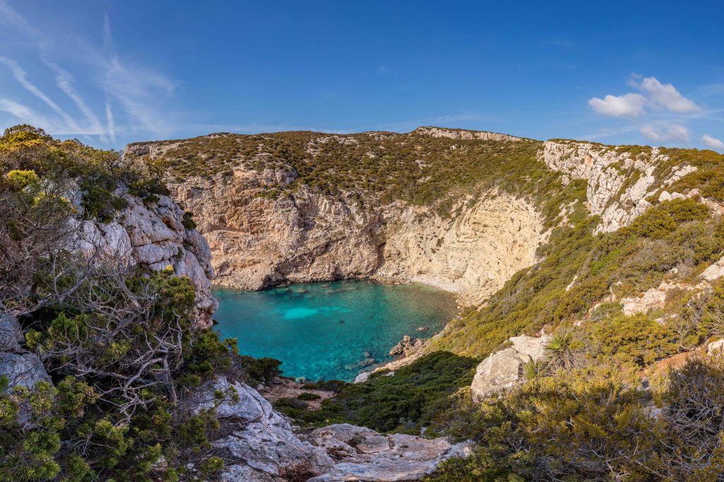 Nur ein paar Kilometer von ARGENTIERA entfernt liegt am weiten Golf von PORTO CONTE das CAPO CÁCCIA. Wie eine riesige Haifischflosse ragt die Vogelinsel FORADADA aus dem silbrigen Meer. Ein Trampelpfad führt entlang der steil abfallenden Küste, hoch über der türkisblauen CALA D’INFERNO, zum mittelalterlichen Sarazenenturm TORRE DELLA PEGNA. Trotz blauer Markierung und einiger Steinmännchen verlaufe ich mich ein paar Mal in der der hüfthohen Macchia.