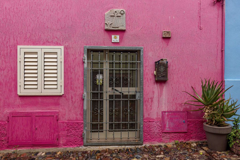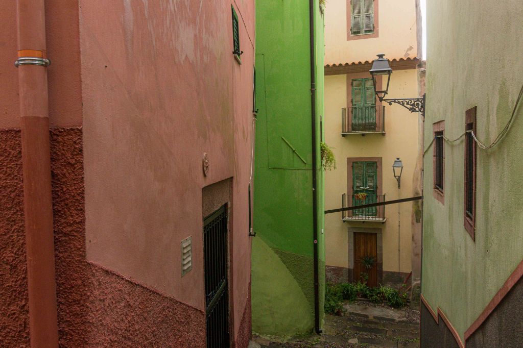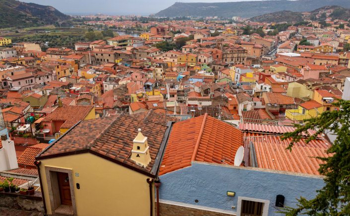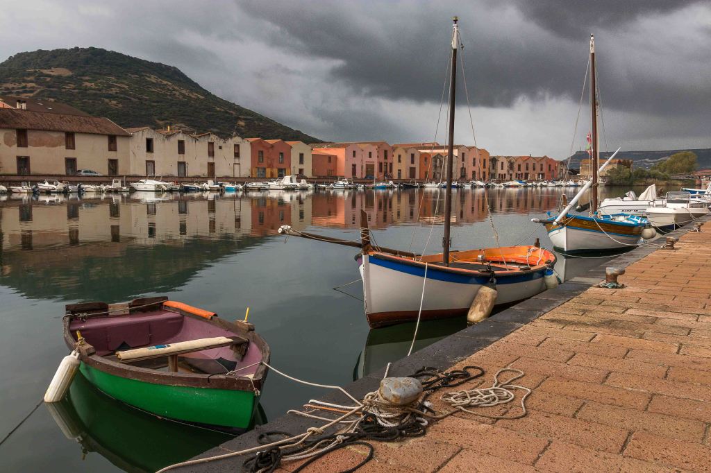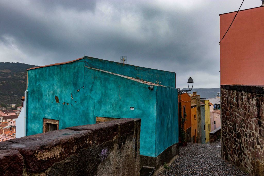 In der Nacht schiebt sich ein Tief heran, am Morgen ist der Himmel grau und es beginnt erst leicht, dann immer stärker zu regnen. Doch wir sind ja nicht aus Zuckerwatte, schnappen uns den Regenschirm und erkunden das bunte BOSA. Vorbei an den schmalen Häusern der Gerber, die der Stadt mit anderen Handwerkern früher einen gewissen Wohlstand bescherten, und über die alte Brücke über den TENO kommen wir ins alte Zentrum. Am Fluss liegen kleine Fischerboote, an der Uferpromenade stehen herrschaftliche Häuser. Leider ist die einst prächtige Palmenallee dem Palmrüssler zum Opfer gefallen. Wir steigen die Gassen den Hügel zum CASTELL mit den bunten Häusern hinauf. Das Wasser rinnt über das Pflaster aus runden Kieselsteinen.