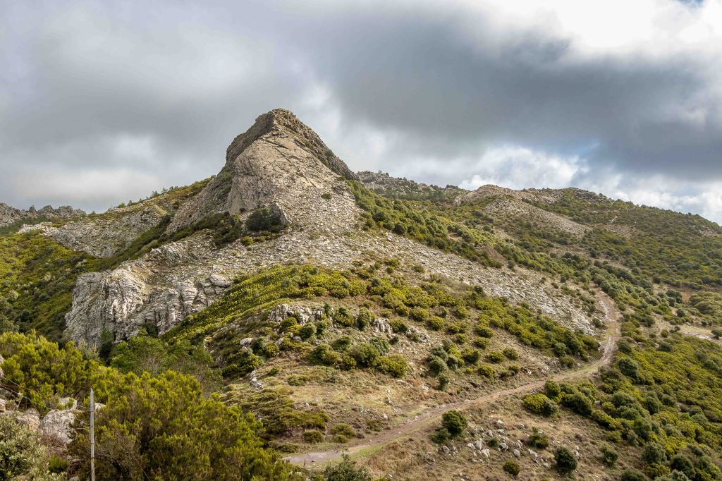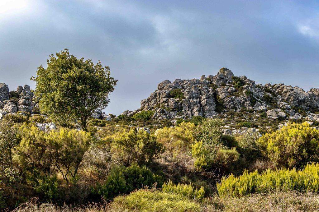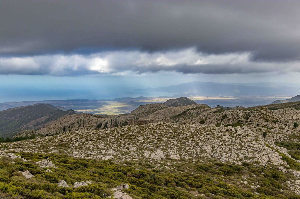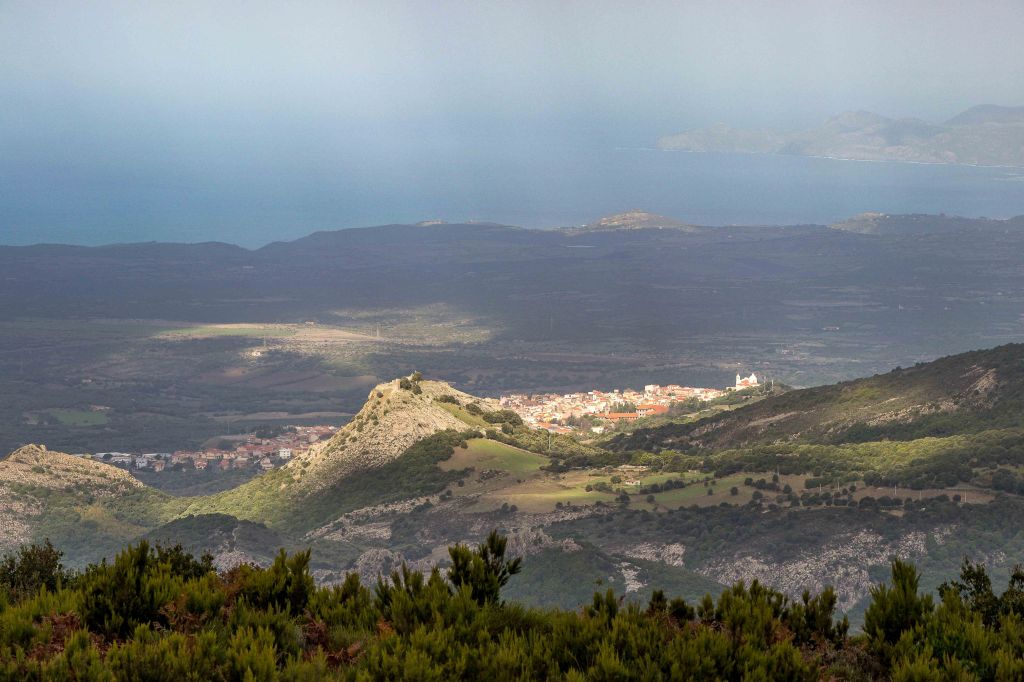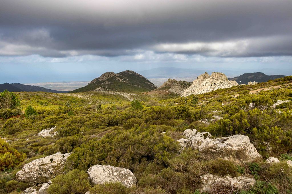 Für einen Tag scheint sich das Wetter etwas zu beruhigen. Vielleicht wird ja noch was aus der schon seit einigen Tagen geplanten kleinen Wanderung. Die Wolken ziehen zwar immer noch schnell nach Osten, doch die Berge scheinen frei zu sein. Durch weite Olivenhaine fahren auf hinauf auf 950 m ü.d.M. zum RAI-Fernsehsender BADDE URBARE, mitten im größten erloschenen Vulkanmassivs Sardiniens, dem MONTE FERRU. Die kleine Runde führt auf Pisten zum höchsten Gipfel, dem MONTE URTIGU mit 1050 m ü.d.M. Zügig ziehen die Wolken über die kahlen Bergkuppen und reißen der Sonne hie und da ein kleines Loch. Dann leuchtet die Landschaft nach dem herbstlichen Regen im satten Grün. Die Erdbeerbäume blühen, die reifen und gut schmeckenden Früchte hängen noch rot leuchtend in den Zweigen. Die ersten Gänseblümchen recken ihre gelben Köpfe in den Himmel. Weit reicht der Blick unter der grauen Wolkenschicht: CUGLIERI wird von einem Sonnenstrahl beschienen, ebenso SANTU LUSSURGIU, das über der fruchtbaren Ebene des TIRSO thront.