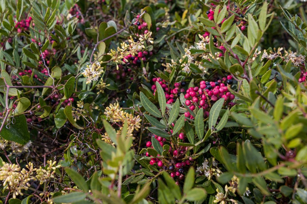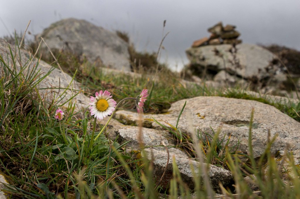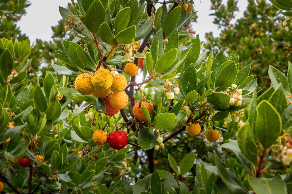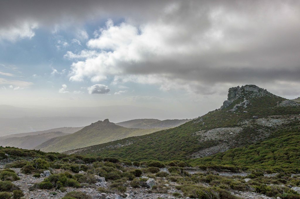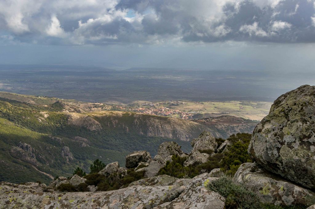 Für einen Tag scheint sich das Wetter etwas zu beruhigen. Vielleicht wird ja noch was aus der schon seit einigen Tagen geplanten kleinen Wanderung. Die Wolken ziehen zwar immer noch schnell nach Osten, doch die Berge scheinen frei zu sein. Durch weite Olivenhaine fahren auf hinauf auf 950 m ü.d.M. zum RAI-Fernsehsender BADDE URBARE, mitten im größten erloschenen Vulkanmassivs Sardiniens, dem MONTE FERRU. Die kleine Runde führt auf Pisten zum höchsten Gipfel, dem MONTE URTIGU mit 1050 m ü.d.M. Zügig ziehen die Wolken über die kahlen Bergkuppen und reißen der Sonne hie und da ein kleines Loch. Dann leuchtet die Landschaft nach dem herbstlichen Regen im satten Grün. Die Erdbeerbäume blühen, die reifen und gut schmeckenden Früchte hängen noch rot leuchtend in den Zweigen. Die ersten Gänseblümchen recken ihre gelben Köpfe in den Himmel. Weit reicht der Blick unter der grauen Wolkenschicht: CUGLIERI wird von einem Sonnenstrahl beschienen, ebenso SANTU LUSSURGIU, das über der fruchtbaren Ebene des TIRSO thront.