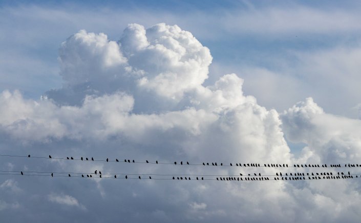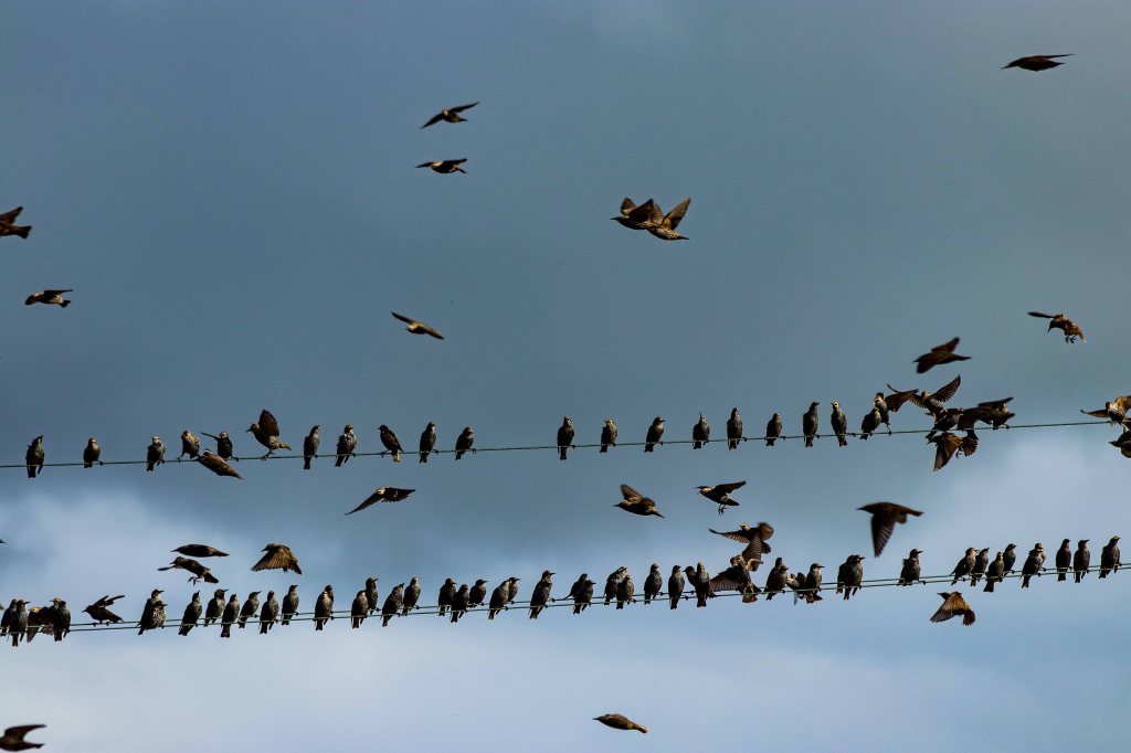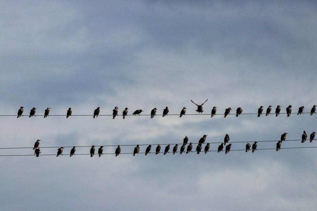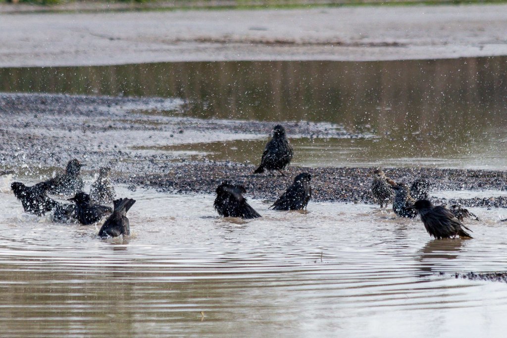 Den Nachmittag schauen wir den Abertausenden von Staren zu, die in immer neuen Formationen über unseren Köpfen hinwegbrausen. Beliebt sind die gegenüberliegende Stromleitung und die großen Wasserpfützen vor unserer Haustüre.