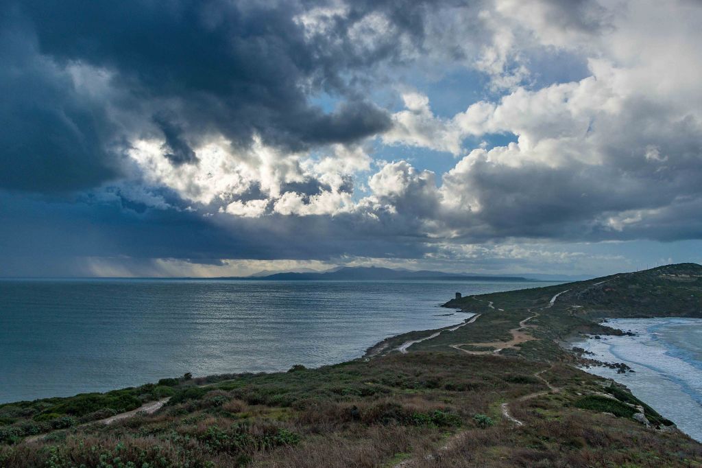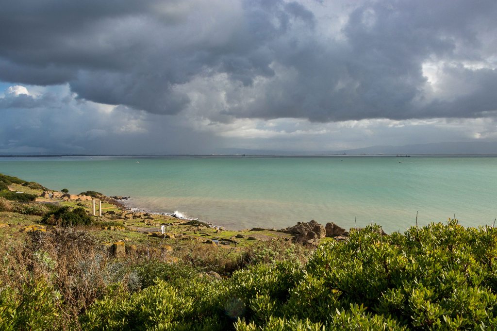 In der Nacht hat es geblitzt, gedonnert, heftig geregnet und gehagelt, ein wahres Trommelfeuer ging auf unseren Dicken nieder. Am Morgen sind die blauen Lücken größer als gestern und wir machen uns auf den Weg. Doch schon beim mächtigen TORRE DE SAN GIOVANNI müssen wir uns unterstellen. Der Regenschauer ist nach ein paar Minuten durchgezogen und die Sonne schafft ab und zu ein paar helle Flecken auf dem Meer und in der grünen Macchia, in der sich schon die ersten Blüten zeigen. Bis zum Leuchtturm am CAP SAN MARCO bleibt es trocken, doch die nächste Regenfront mit Blitz und Donner folgt. Ein gemauerter Unterstand gibt etwas Schutz. Und fünf Minuten später scheint schon wieder die Sonne. Die Ausgrabung von THARROS sind auch von außen gut zu sehen. Schon in der Steinzeit war der Ort besiedelt, dann kamen Phönizer und Römer. Im 11. Jh. hatten die Einwohner genug von den Sarazenenüberfällen. Sie rissen ihre Häuser ab und nahmen das Baumaterial mit nach Oristano.
